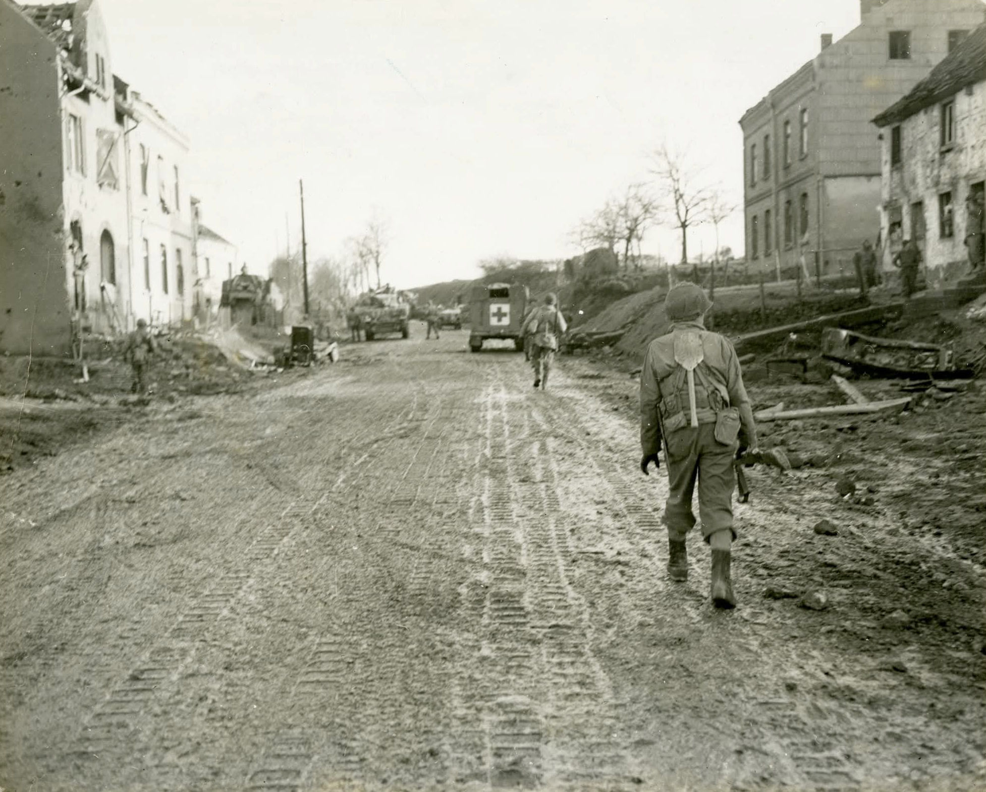 American infantrymen advance to the front through the shell-torn town of Langerwehe, Germany. 10 December, 1944.
