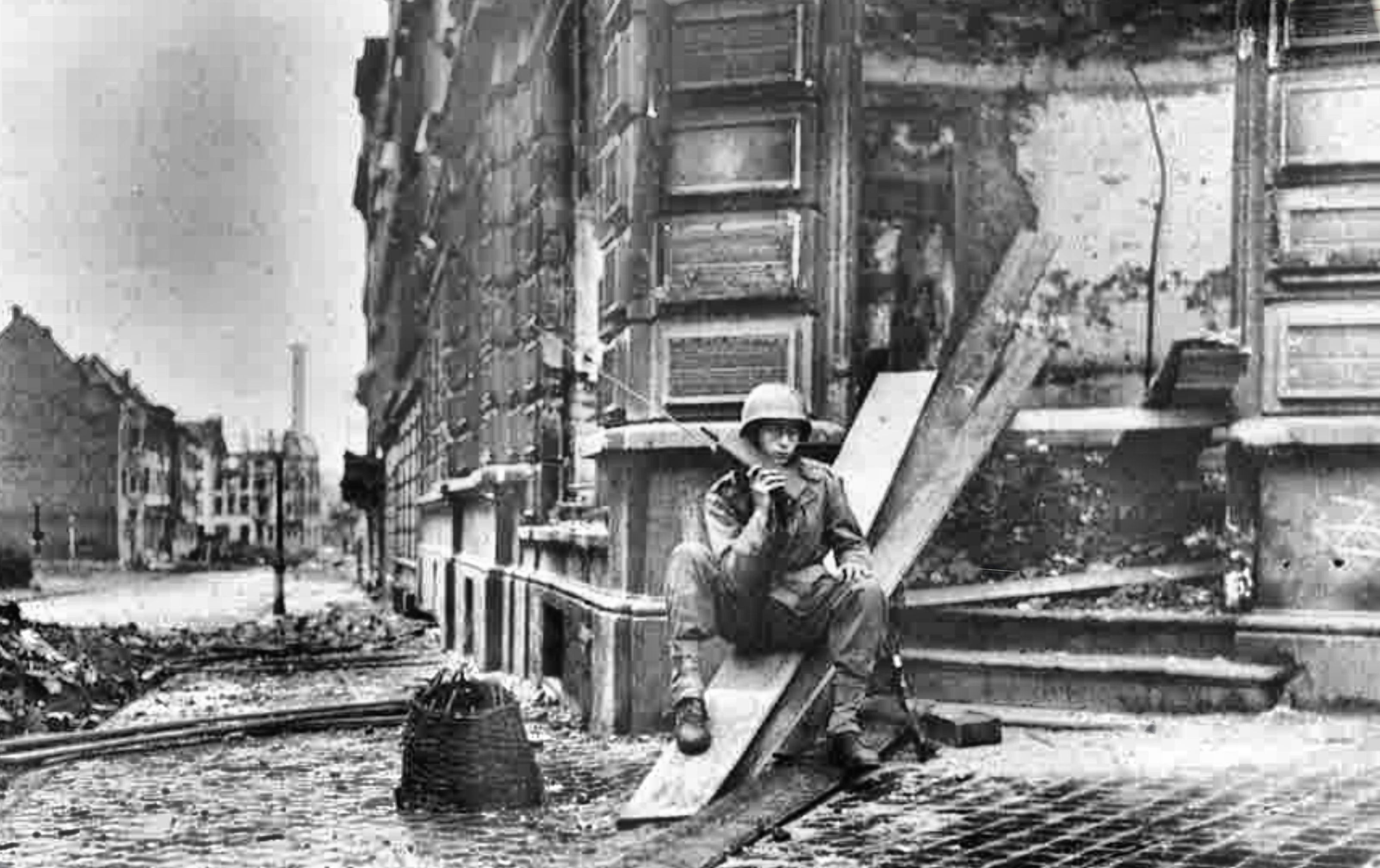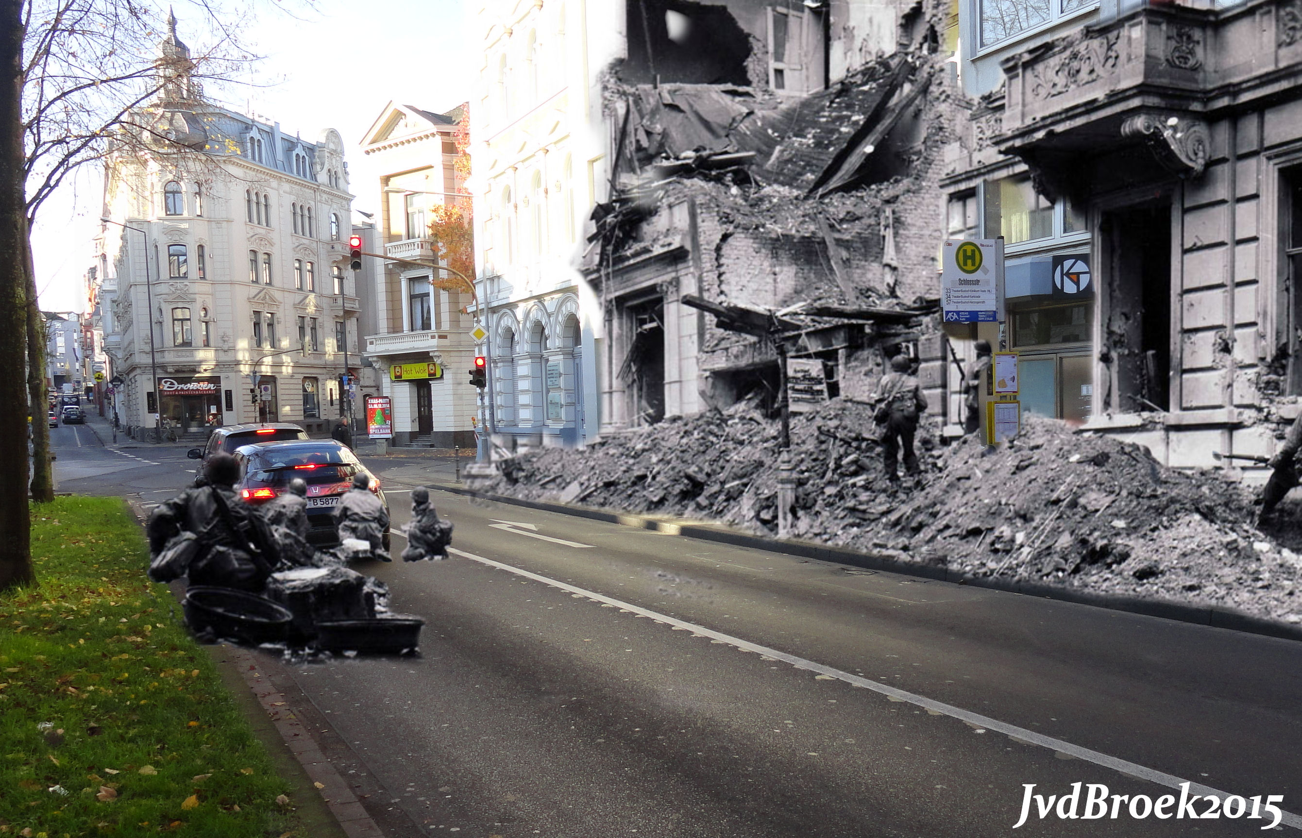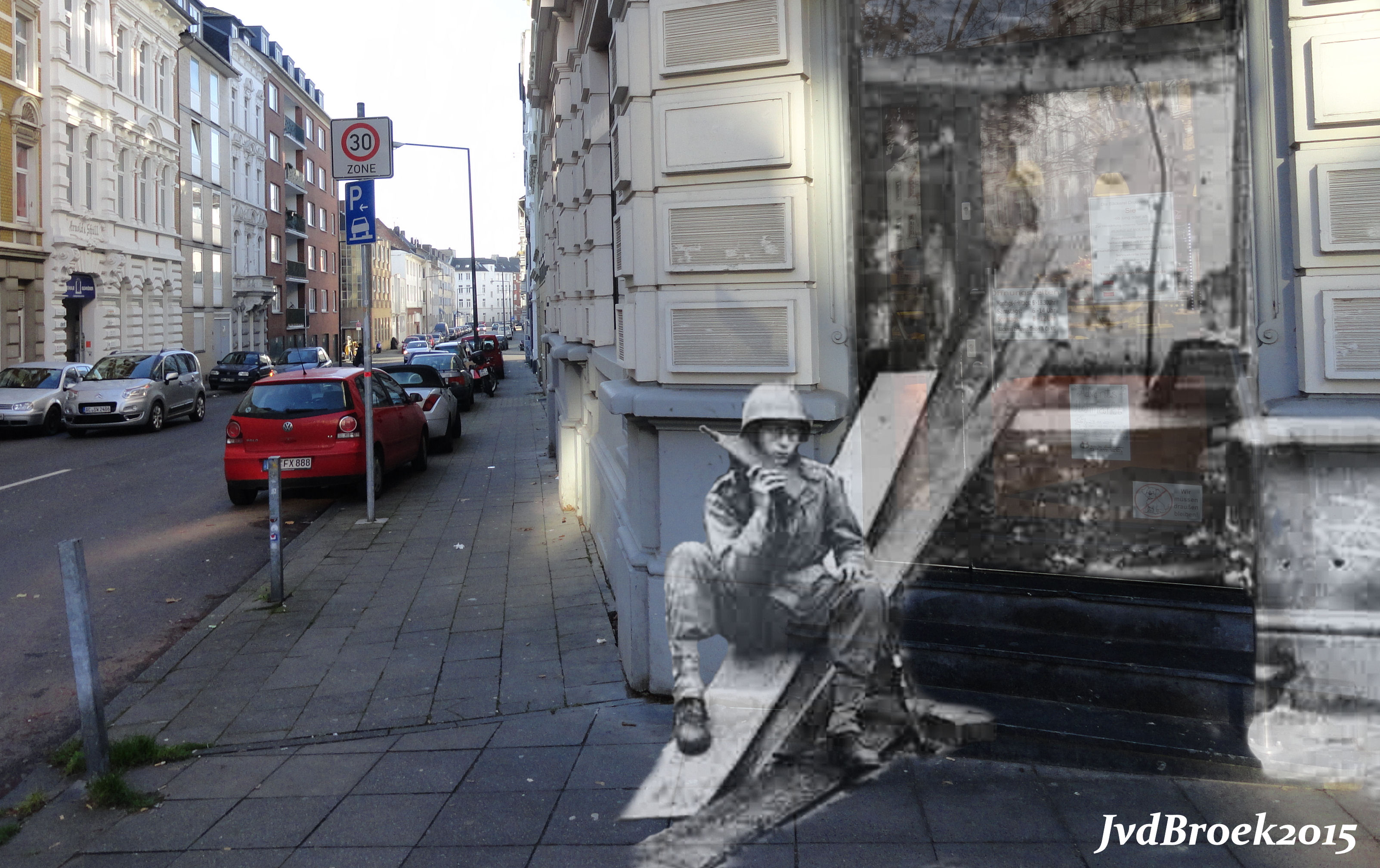 Private in conversation with HQ during the battle of Aachen in 1944 at the corner of Adalbertsteinweg junction Oranienstraße.