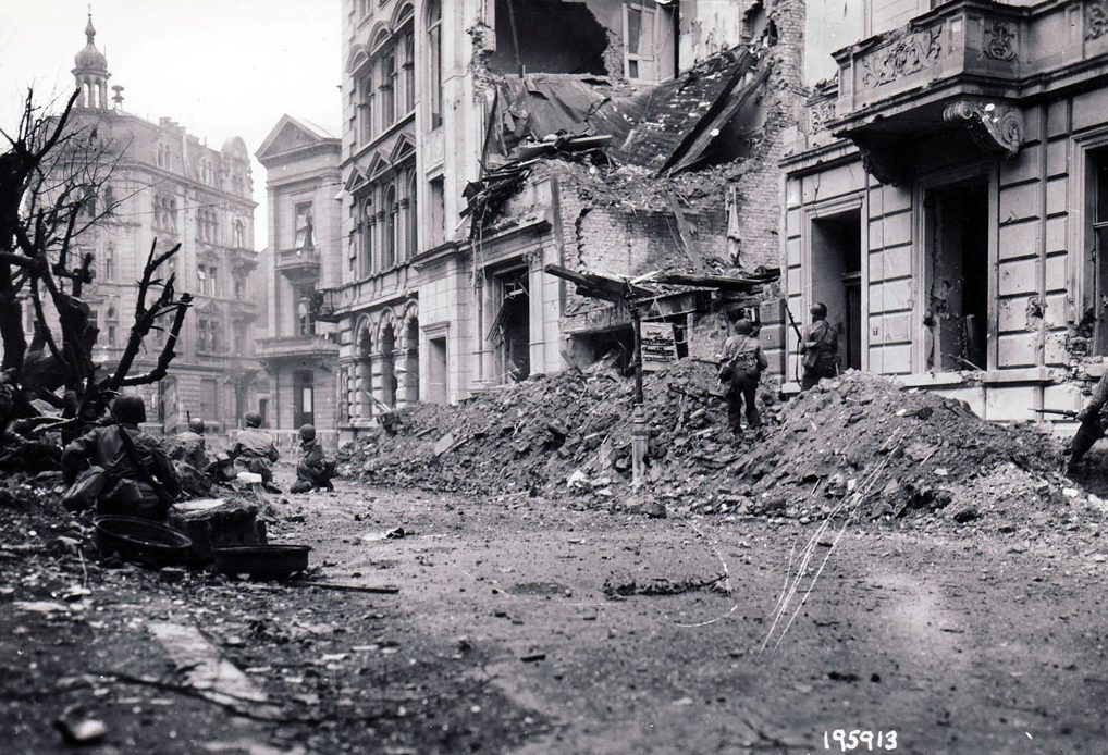 Sherman tank and M10 tank destroyer on the streets of Aachen, October 1944.