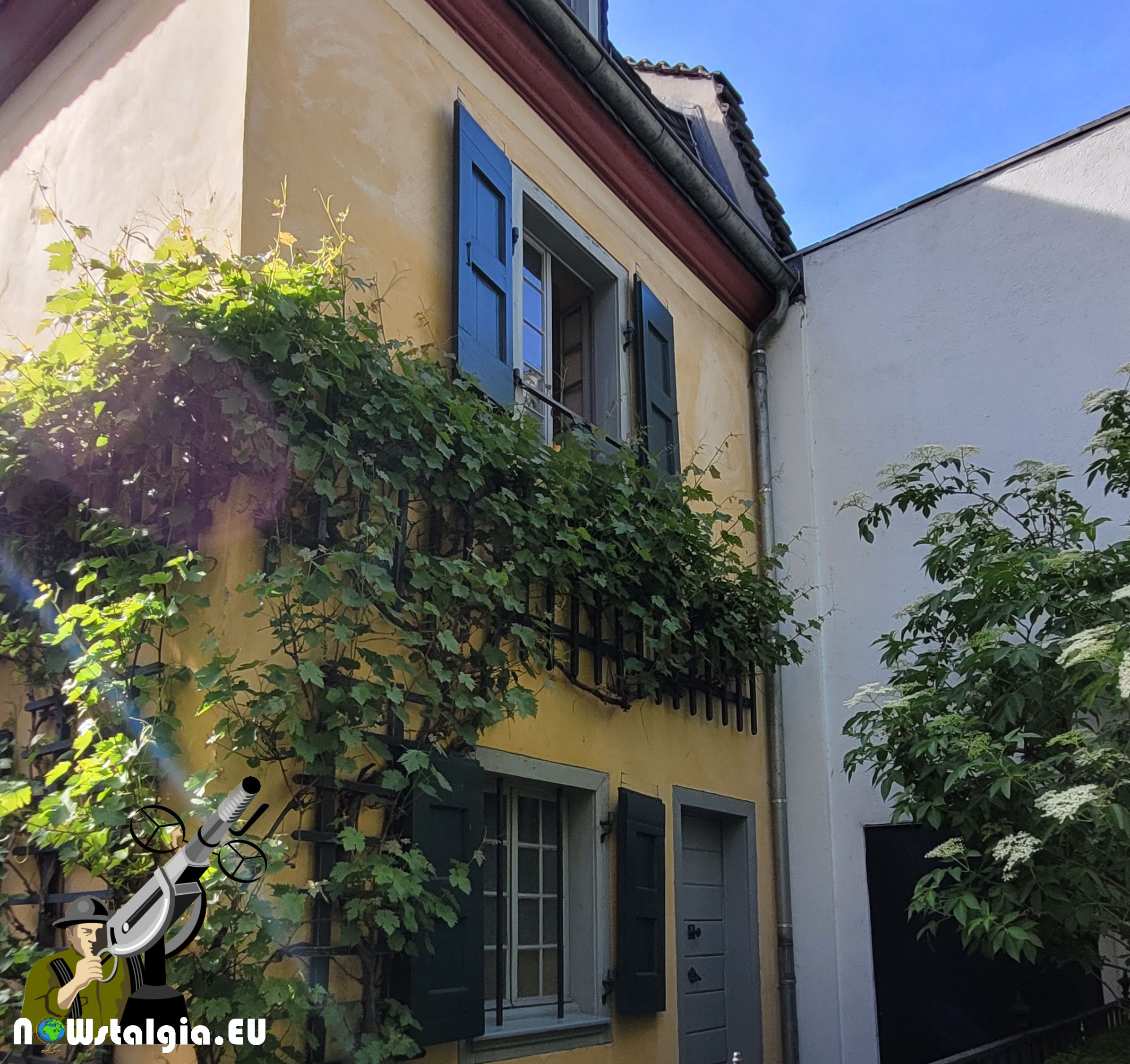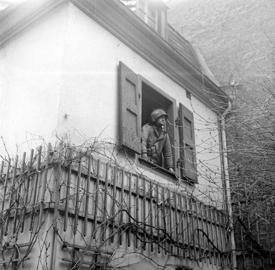 American soldier enjoying the view in the courtyard of the Beethoven Haus after the battle for the city of Bonn, March 1945.