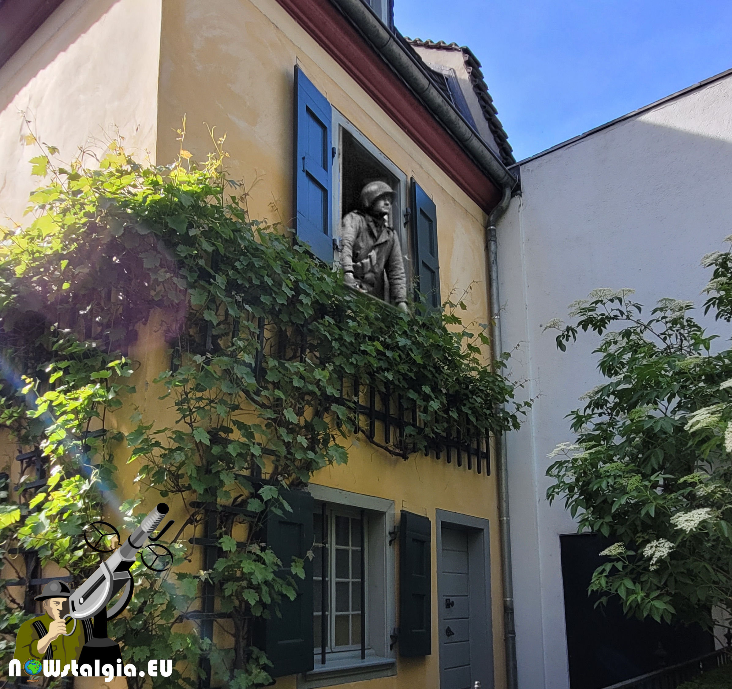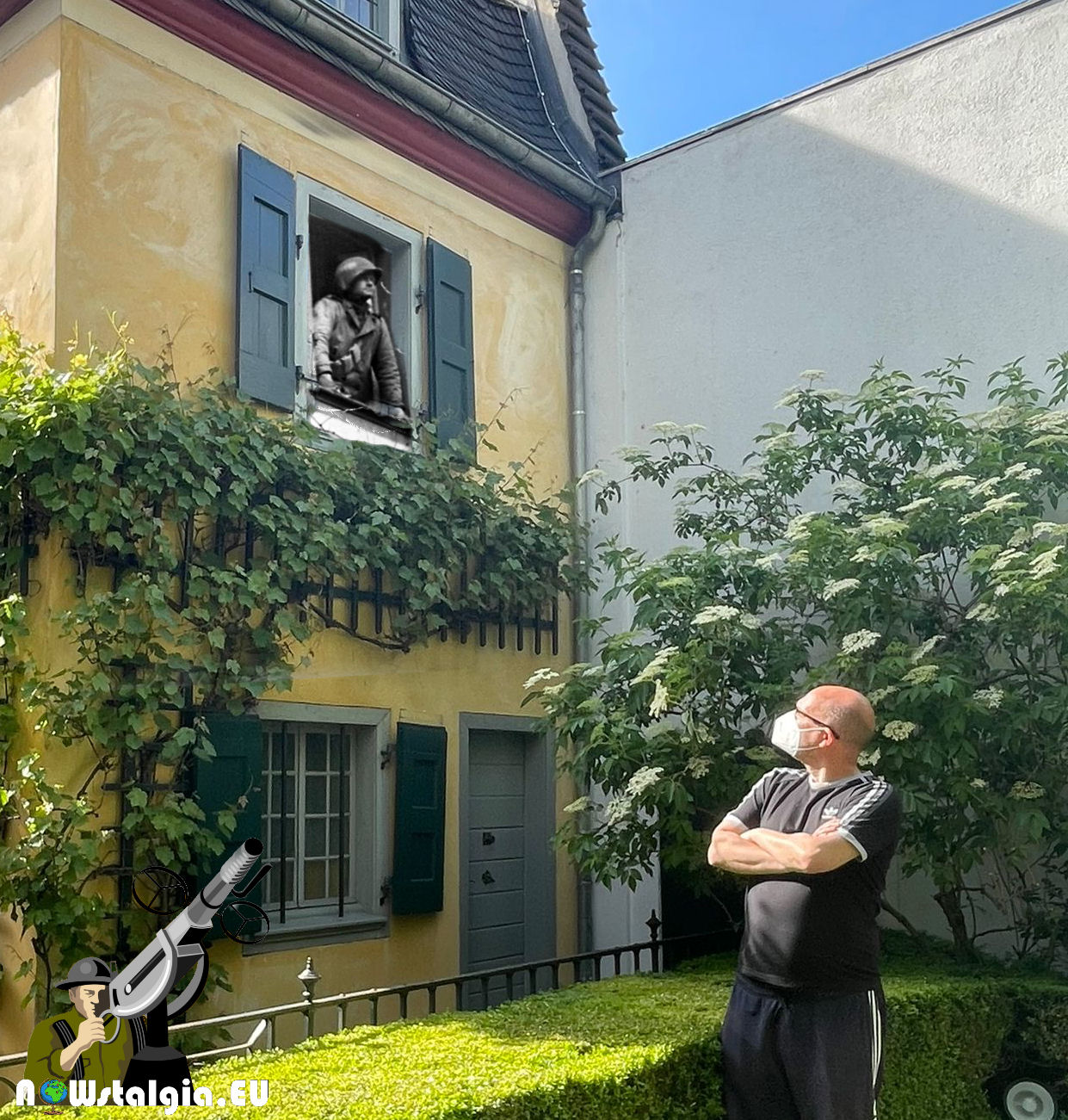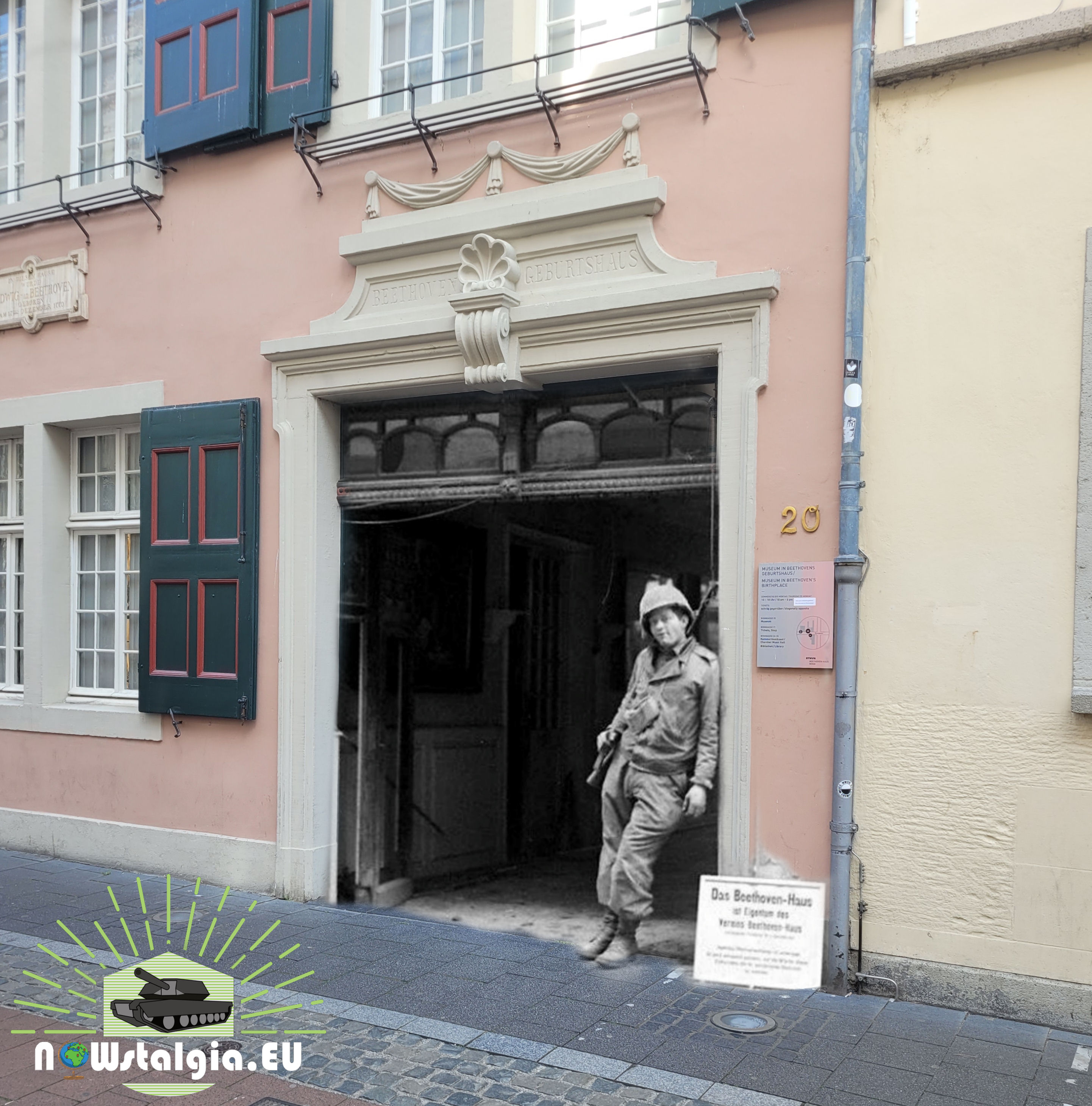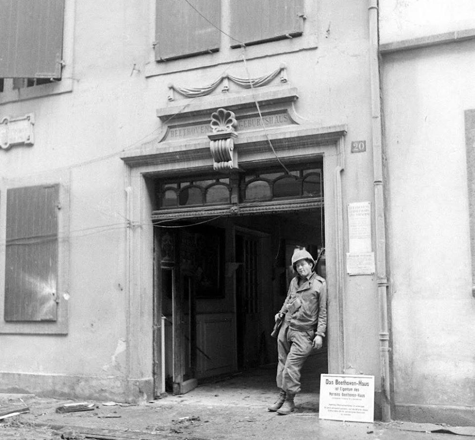 American soldier poses in front of the birth house of Ludwig von Beethoven, in Bonn after the attack of the city in March 1945.