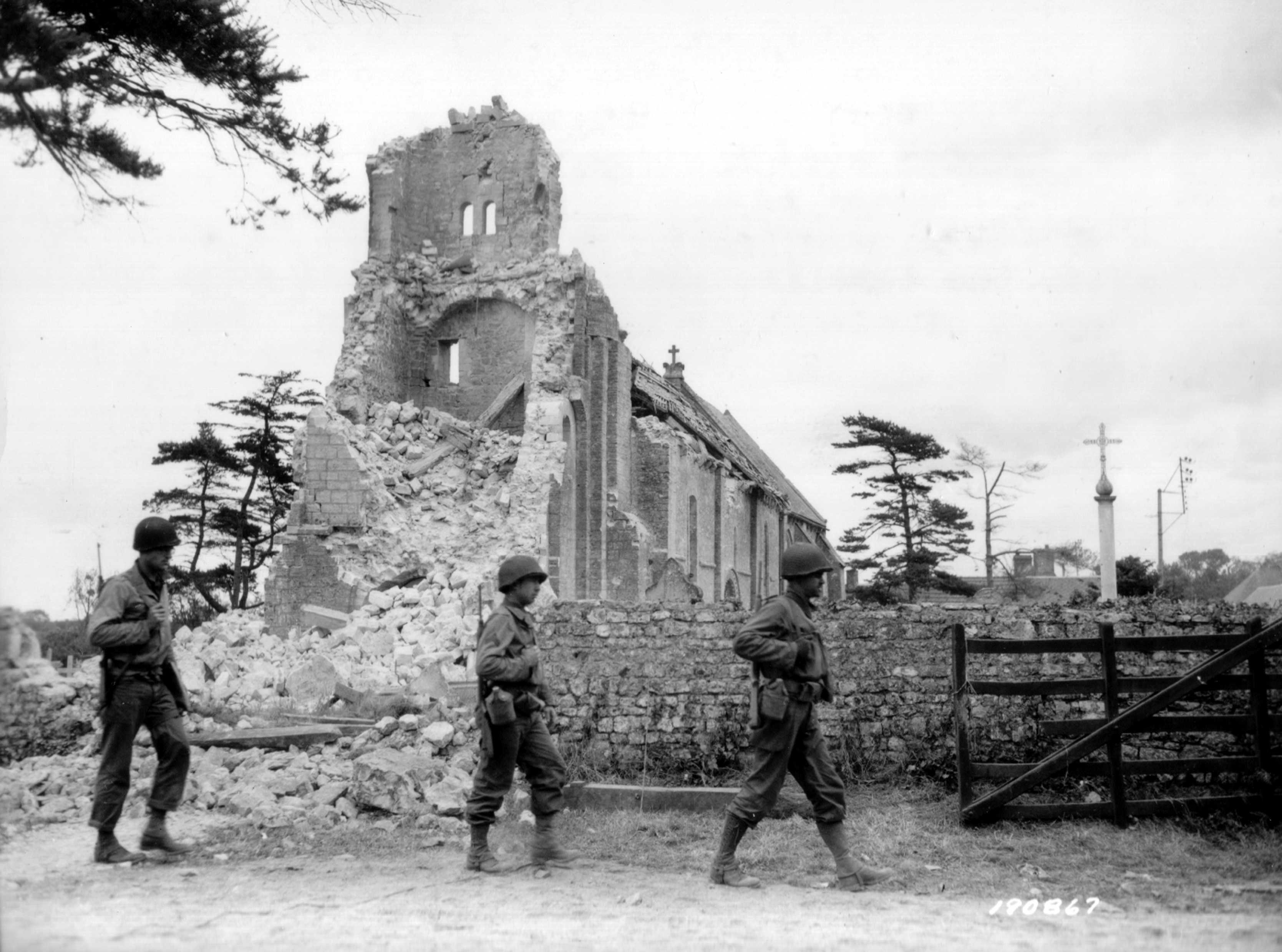 US troops moving past the church at Colleville-sur-mer just after D-day.