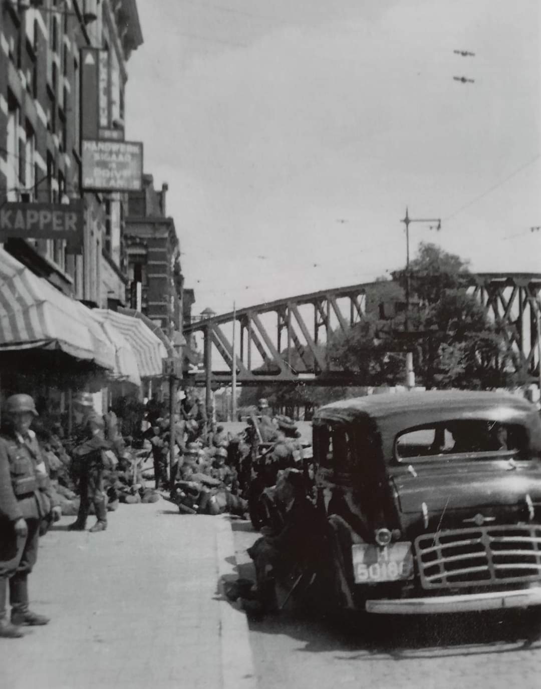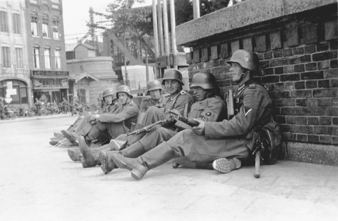German soldiers waiting for further orders in Rotterdam during Fall Gelb in May 1940 with in the background the famous railwaybridge “De Hef”.
