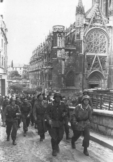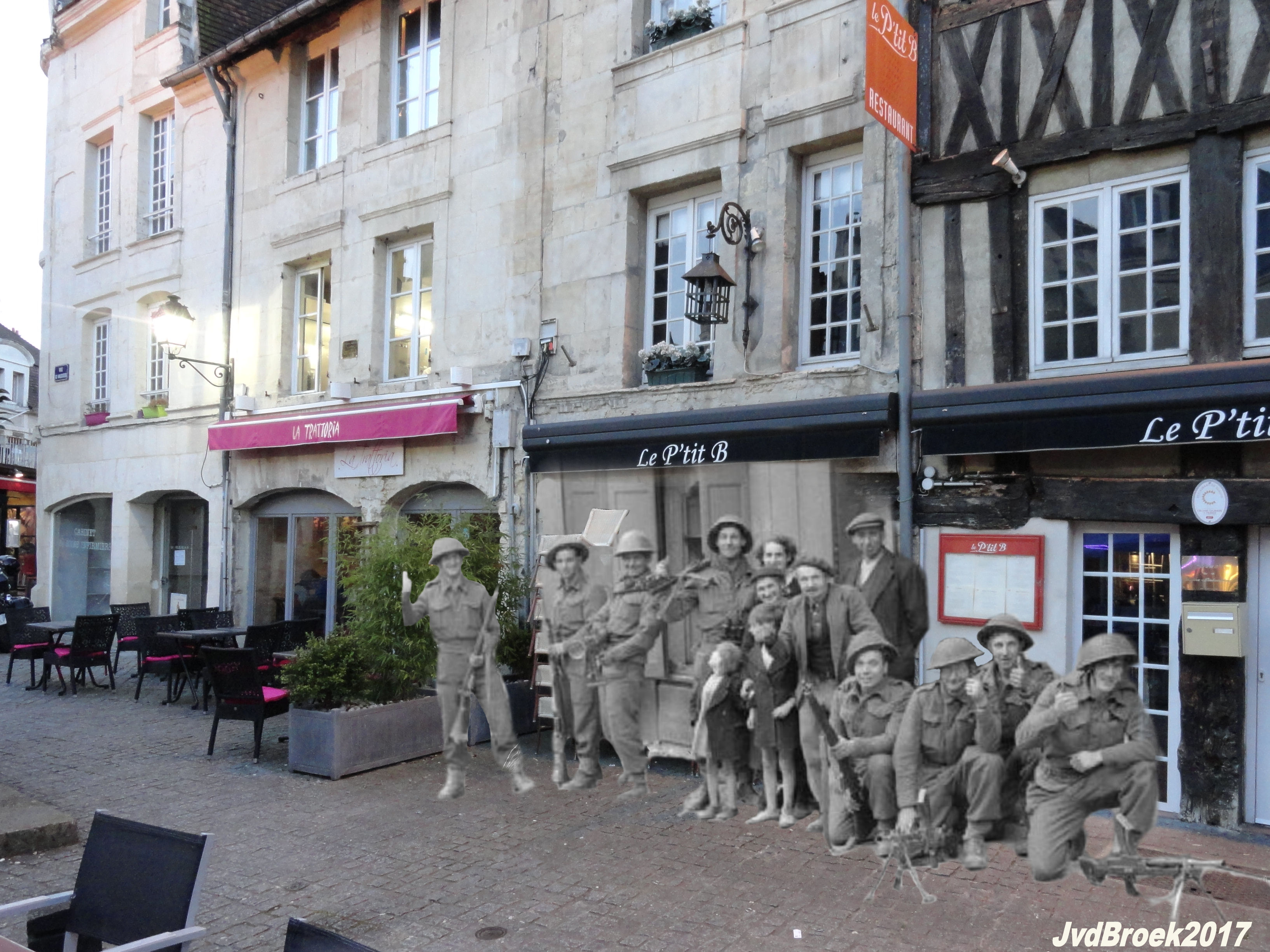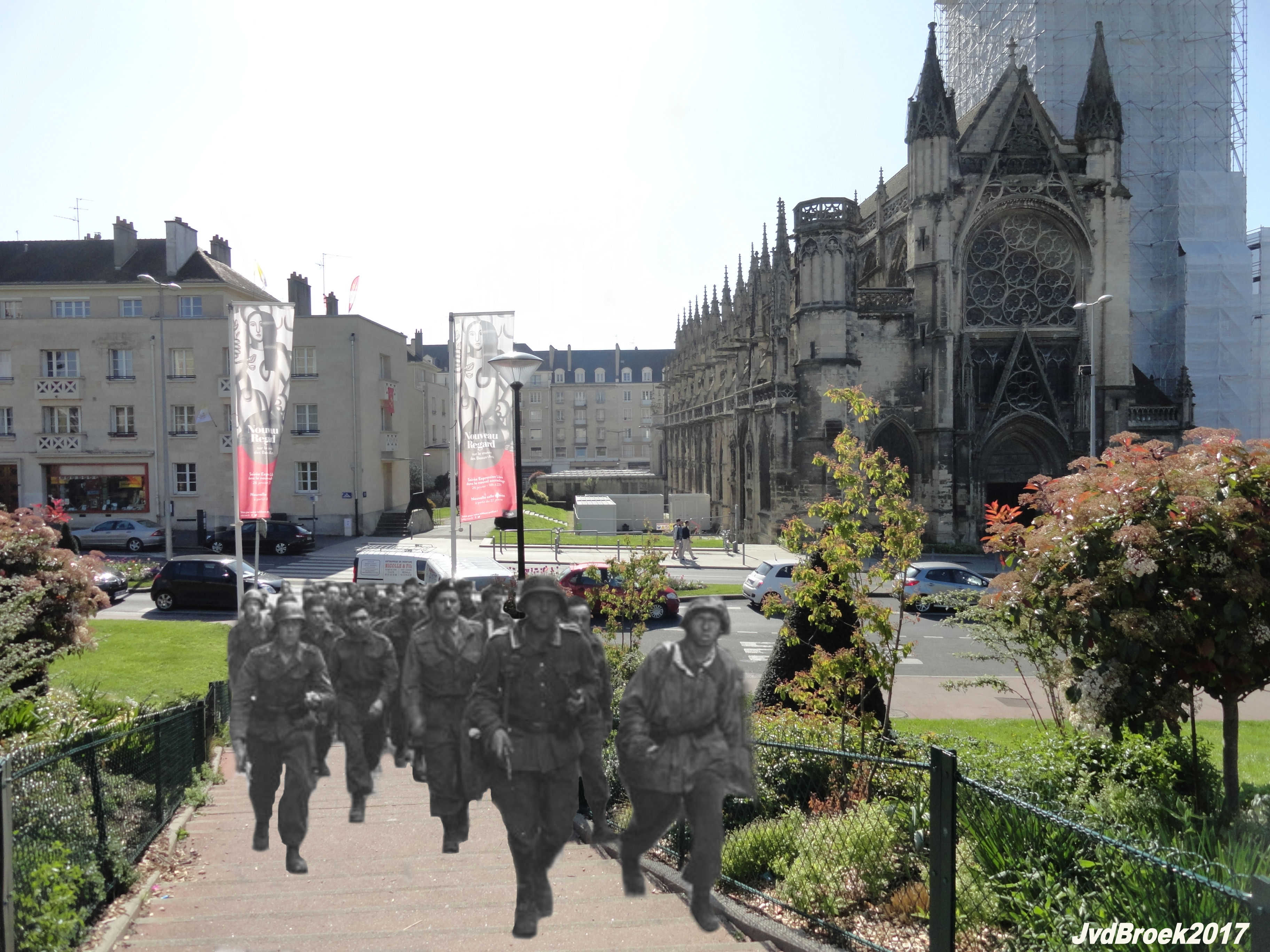 On the morning of June 6, Canadian prisoners of the Chaudière Regiment climbed the ramp of the castle (in the background the Saint Pierre church). Almost the same location. I had to replace them a little to the left because there is no ramp but a stairs today.