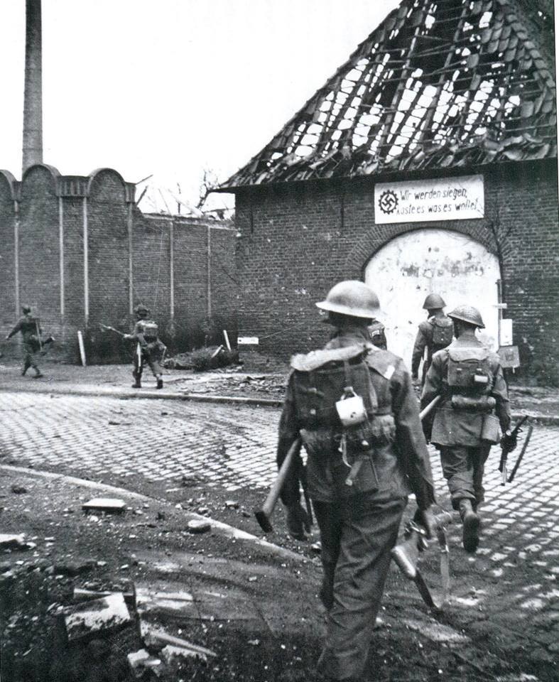 Infantry of the 2nd Bn. Monmouthsire Regiment making their way through the streets of Bocholt, 29 March 1945. Note the slogan: Wir werden siegen koste es was es wolte!