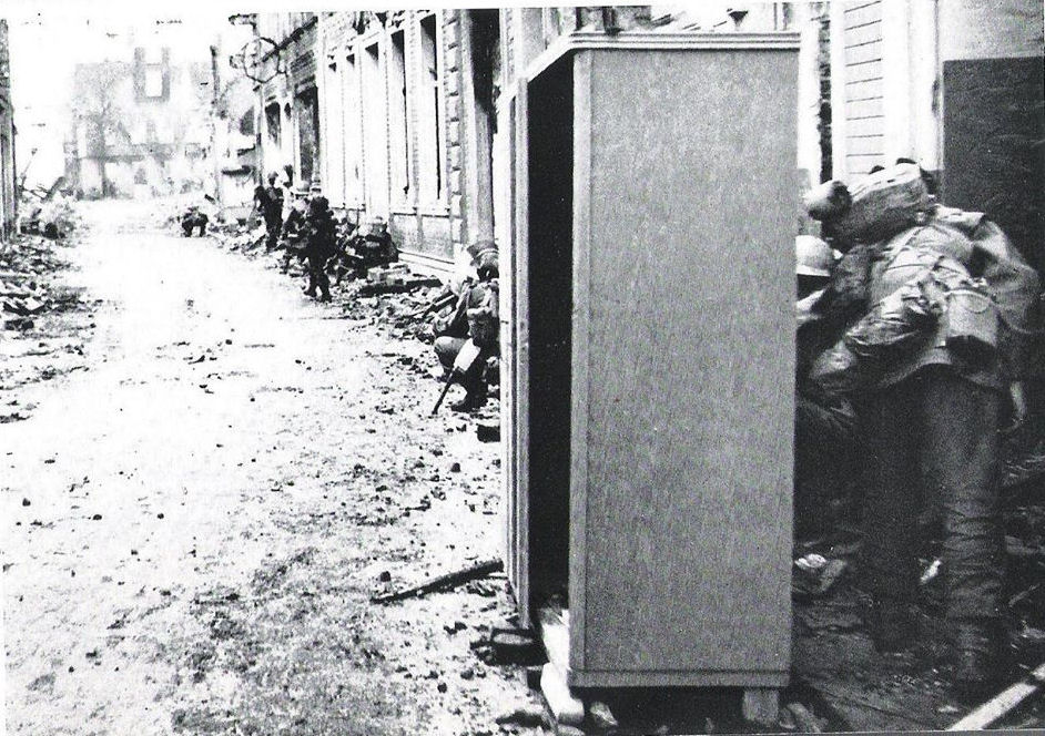 Infantry take cover behind some furniture left by the roadside, Bocholt, 29 March 1945.