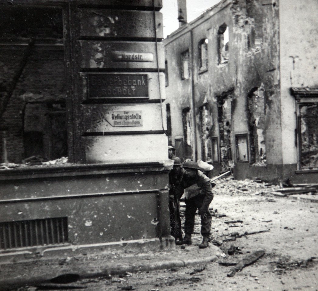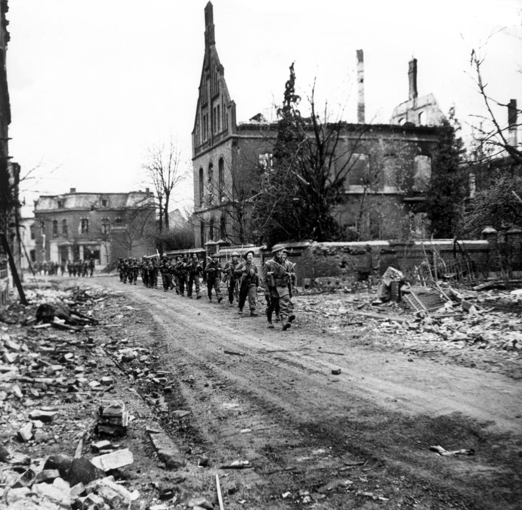 Infantry making their way through devastated streets of Bocholt, 29 March 1945.