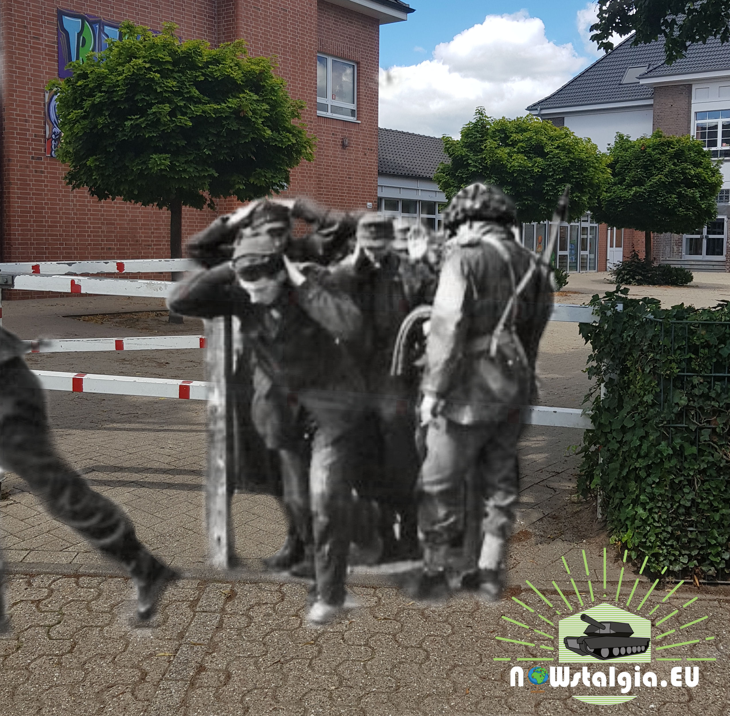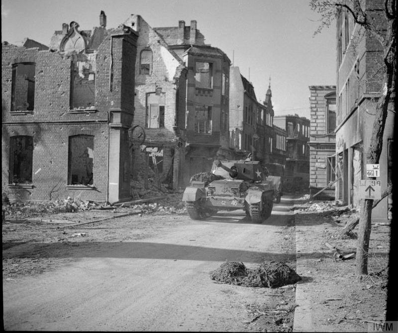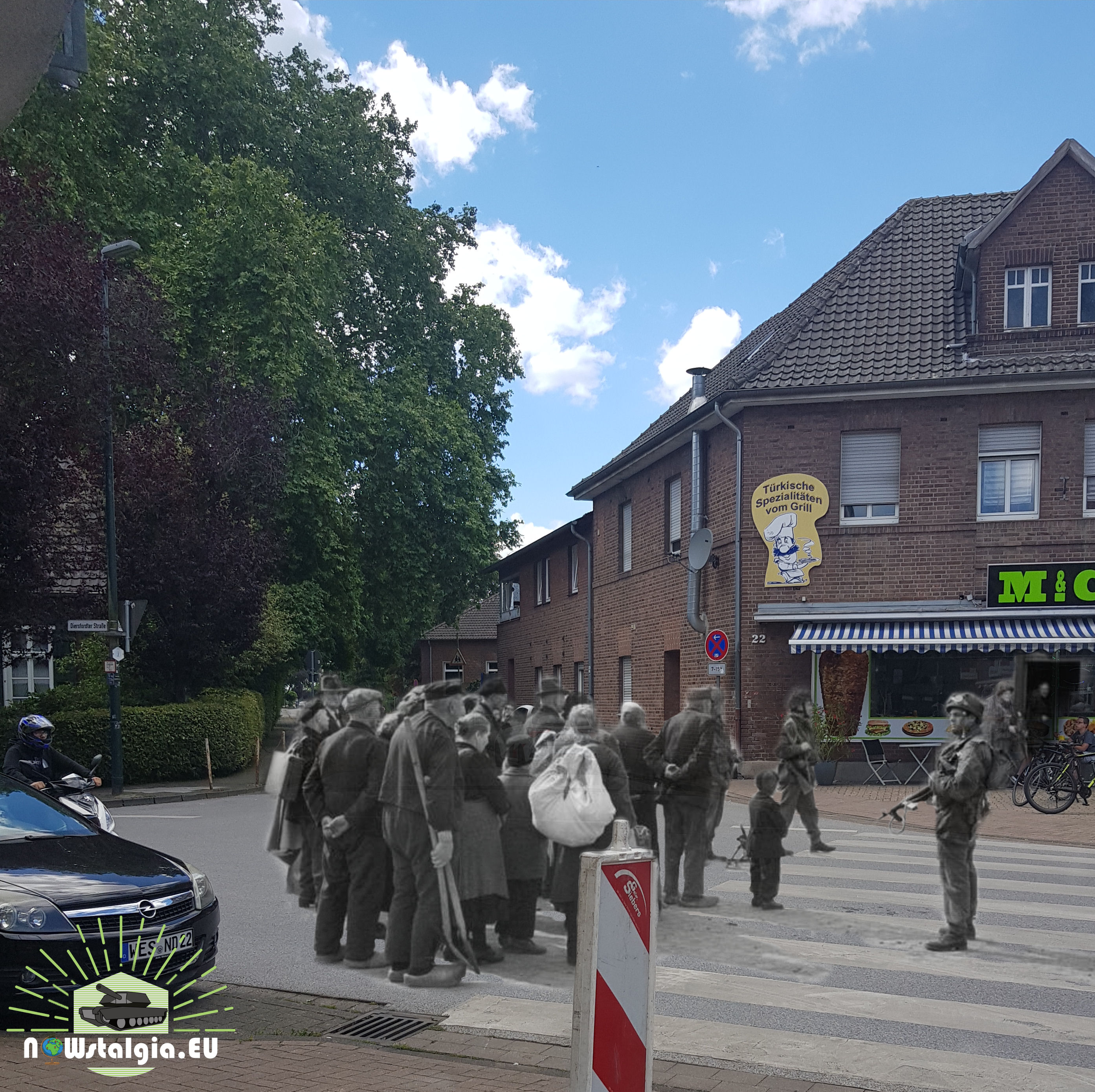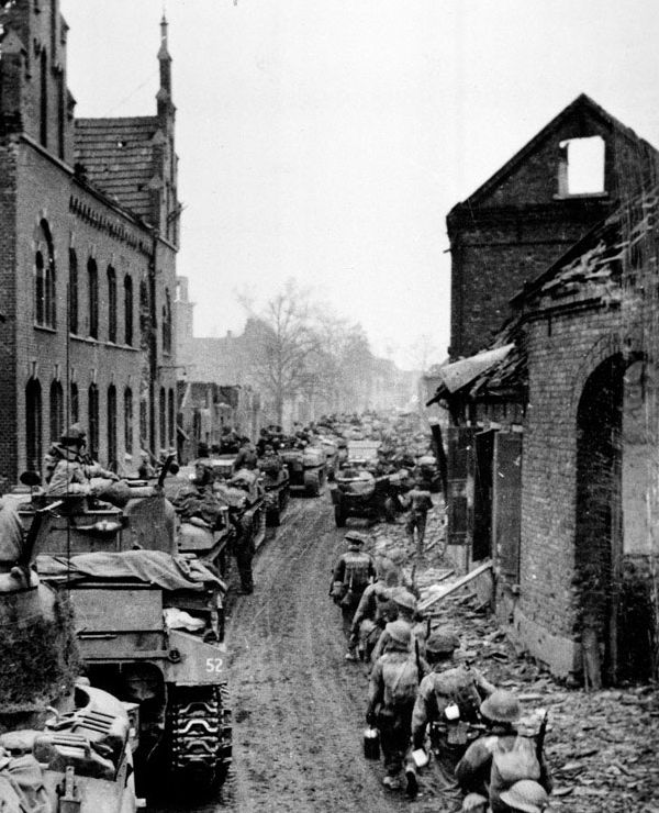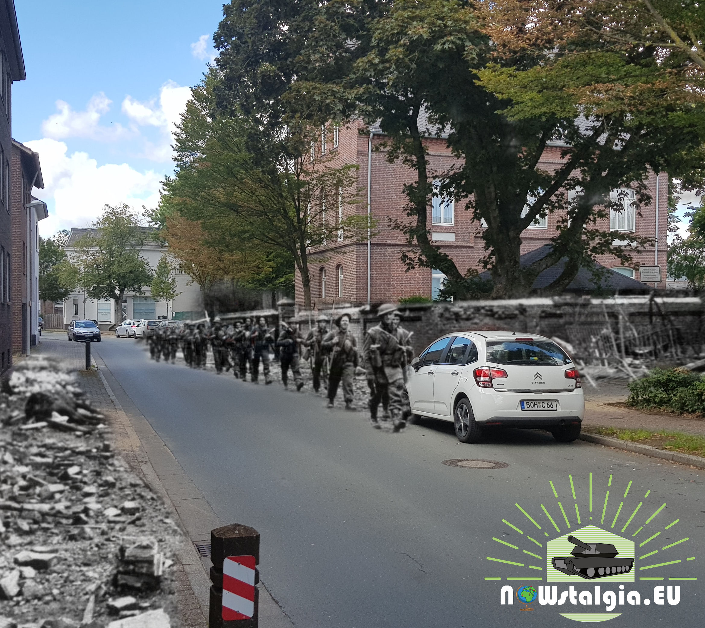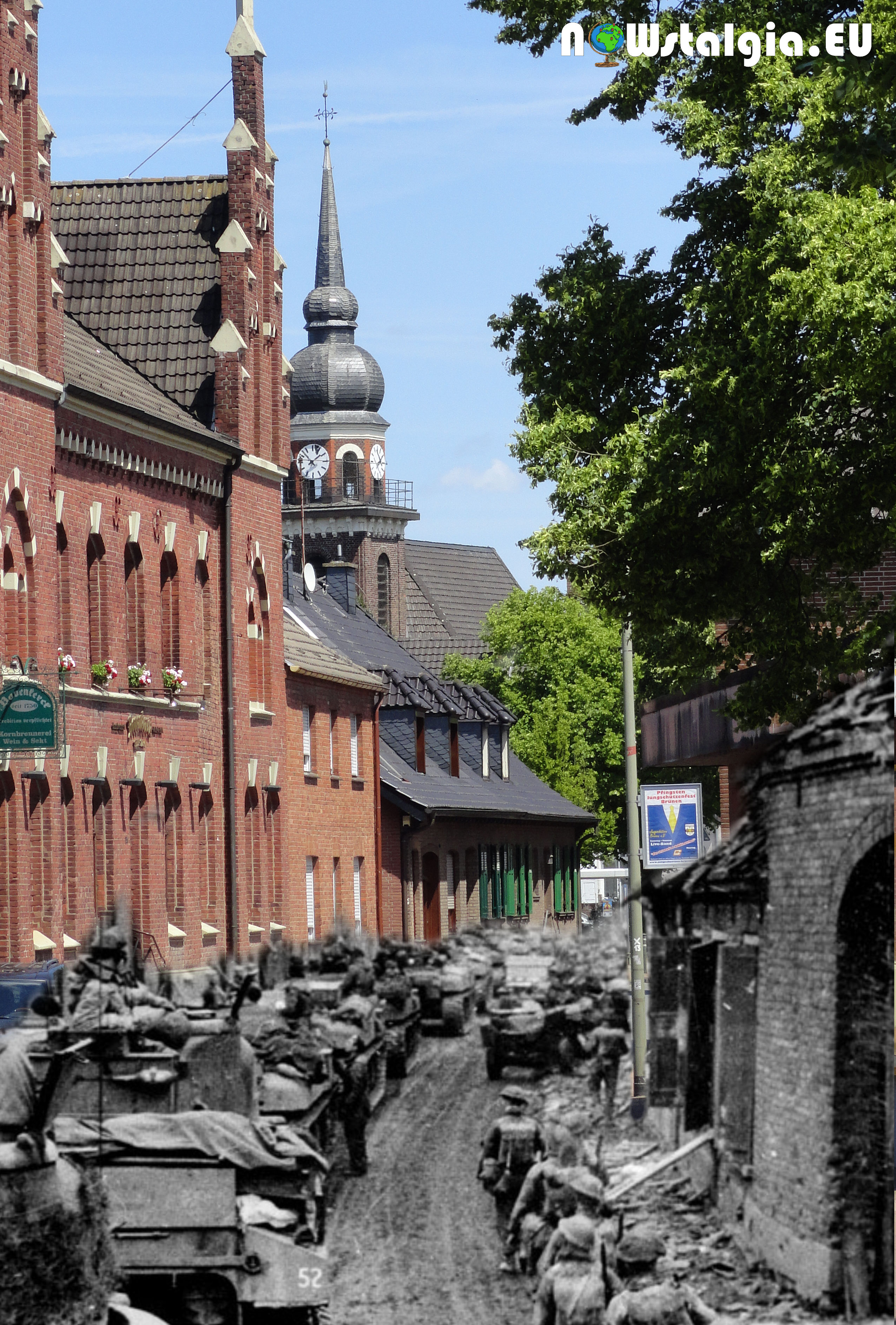 Infantry and tanks moving through Ringelenberg (not Brunen as mentioned in the original text) around March 1945. (very difficult shot)