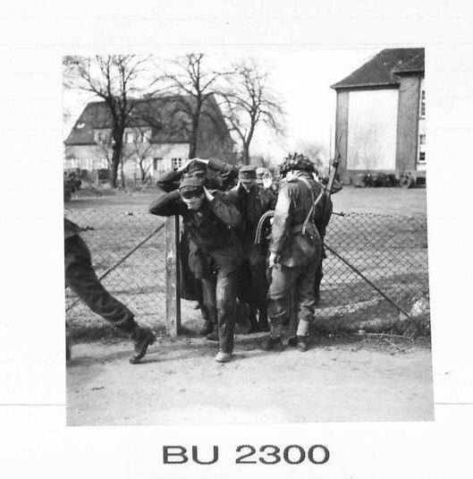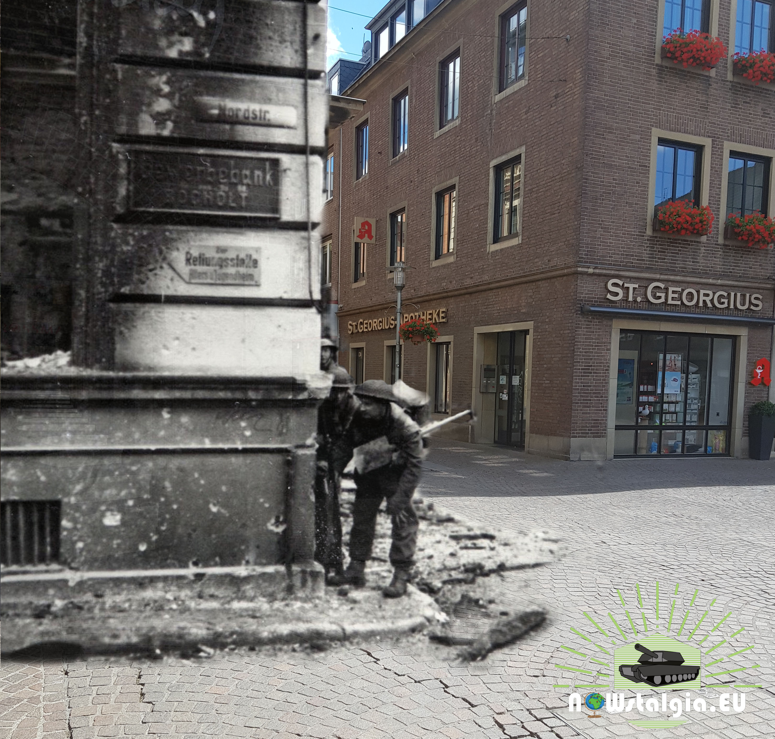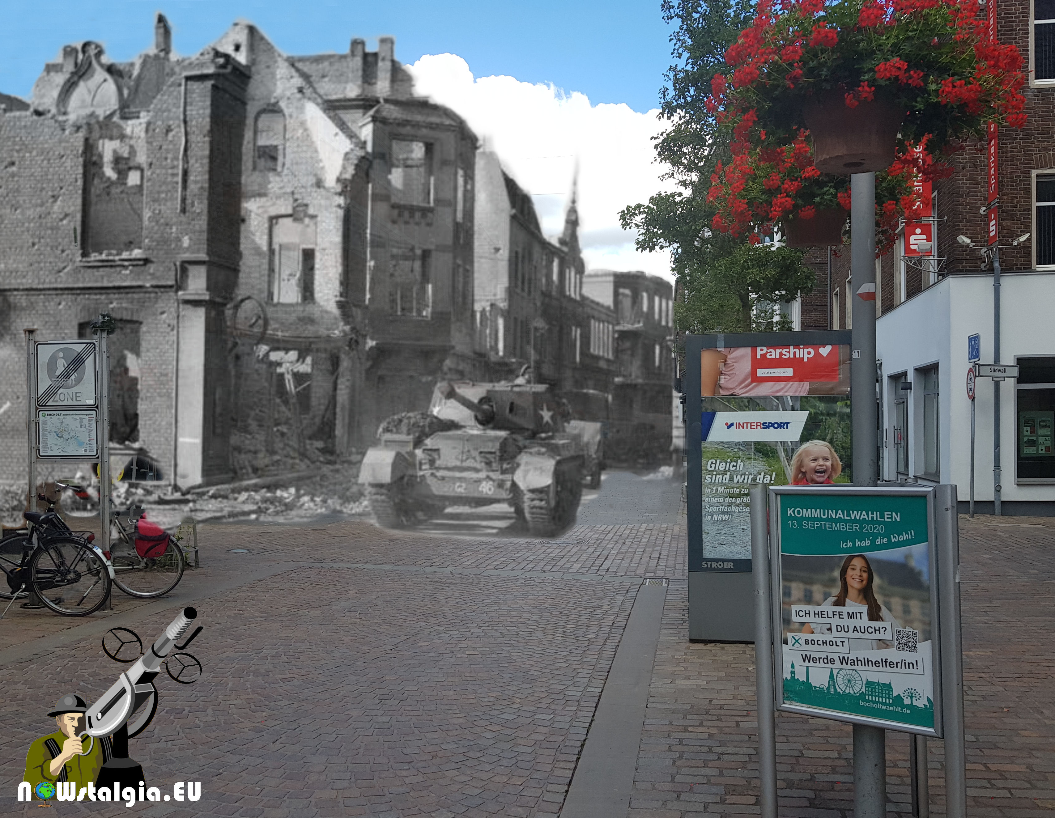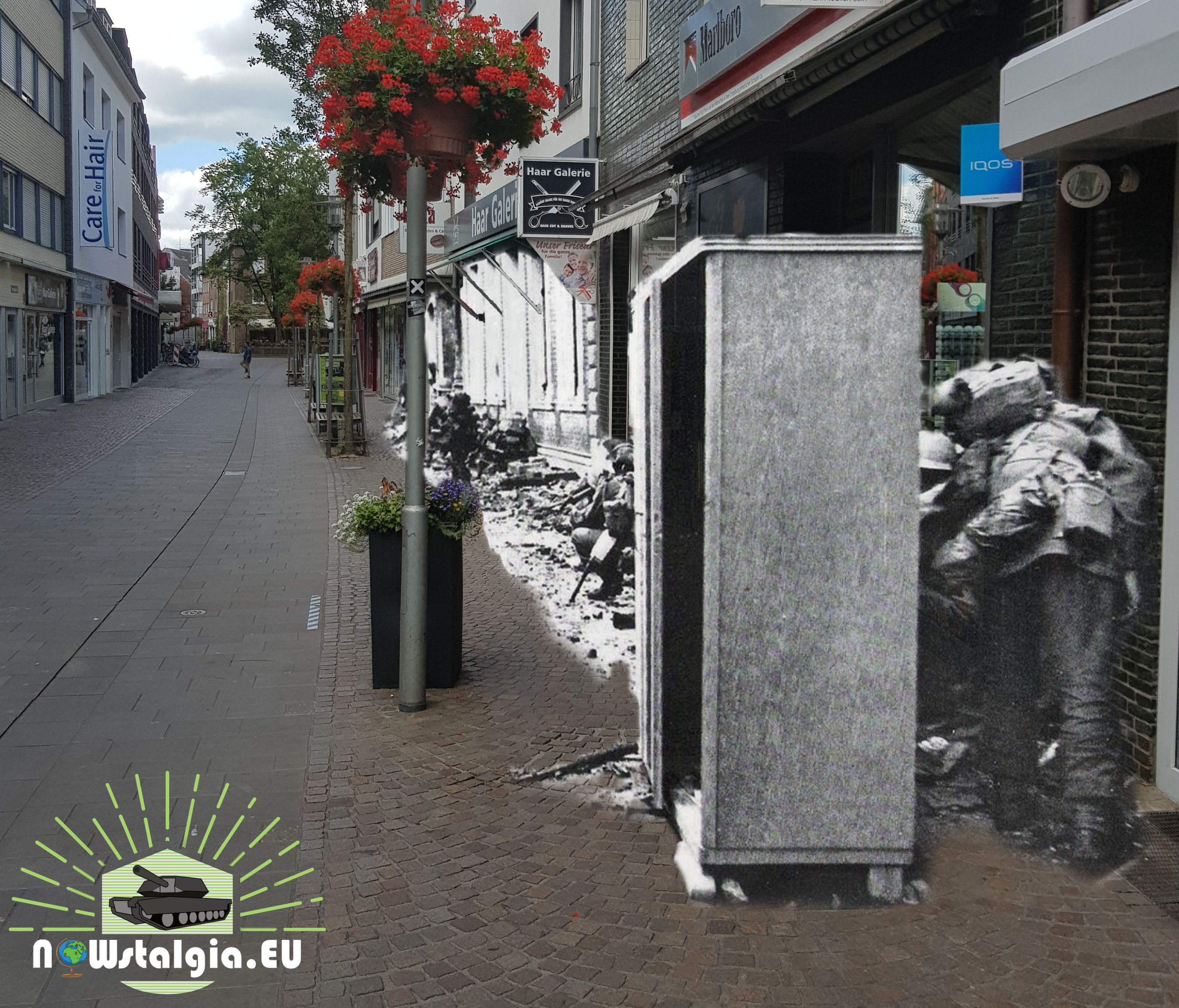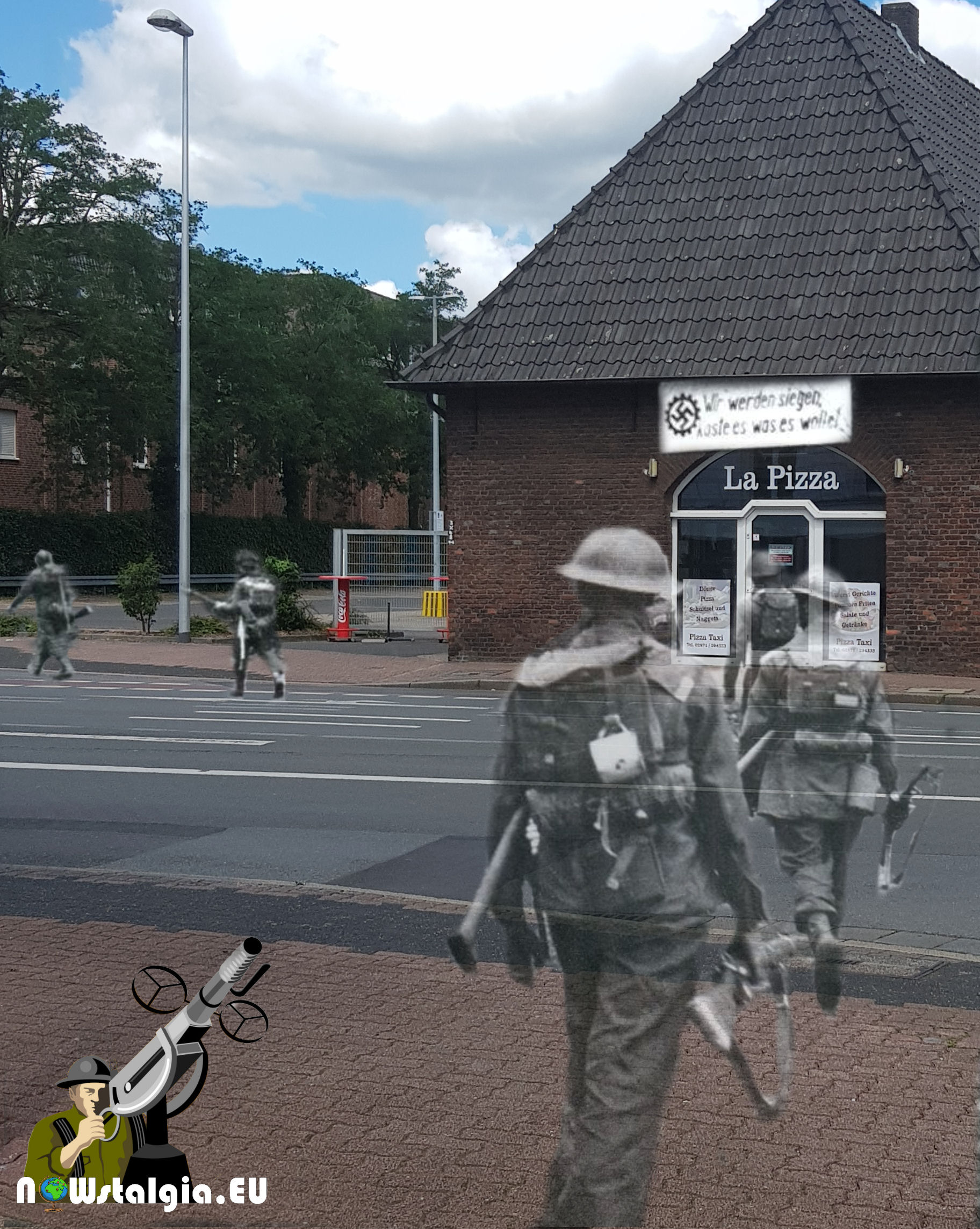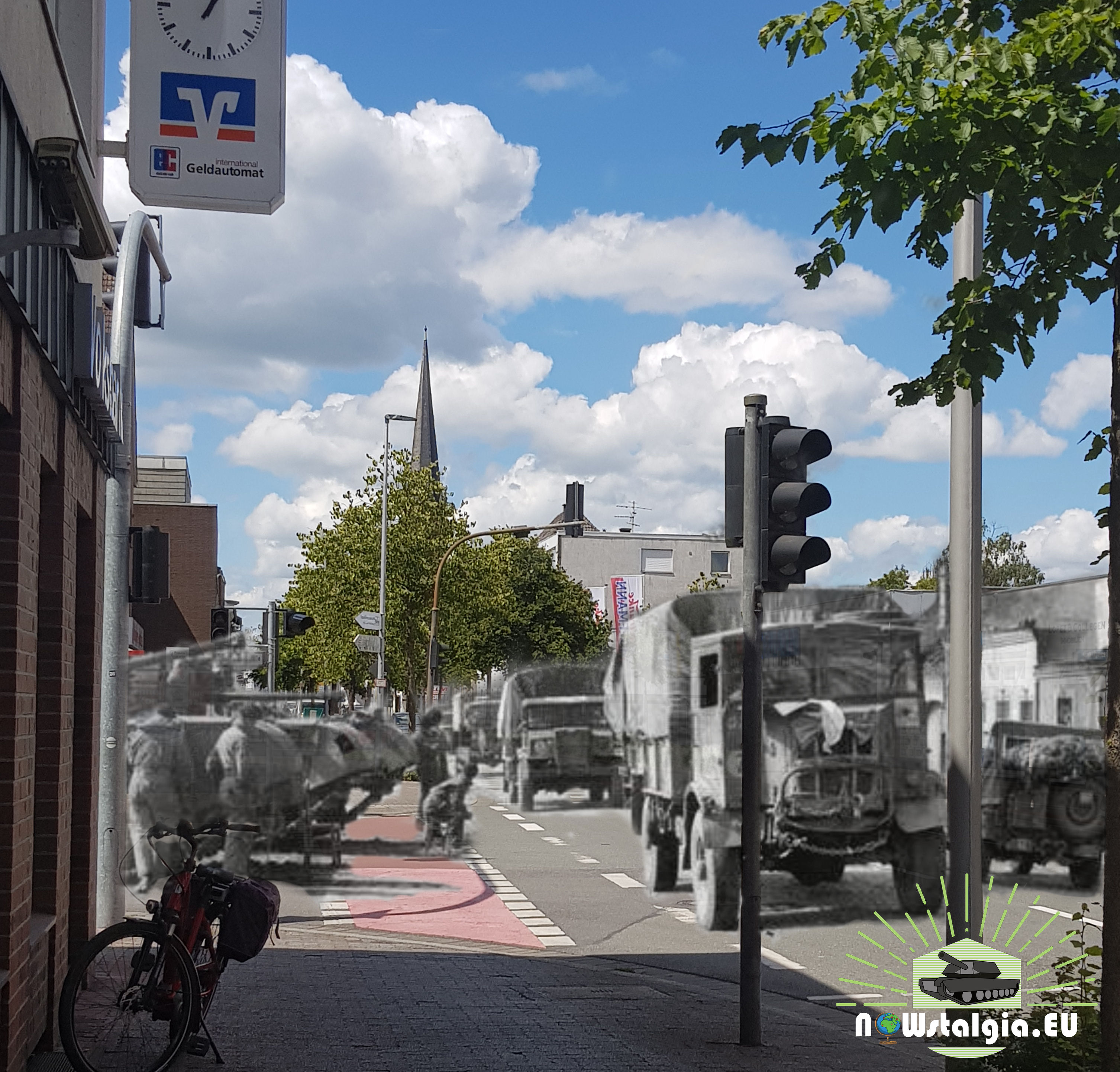 Infantry and tanks moving through Ringelenberg (not Brunen as mentioned in the original text) around March 1945. (very difficult shot)