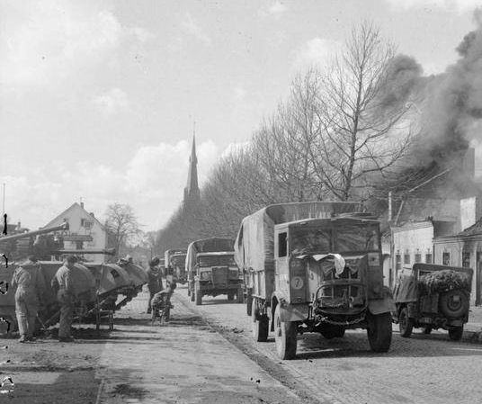 Supply lorries pass burning buildings in Bocholt, 31 March 1945. In the lead is an