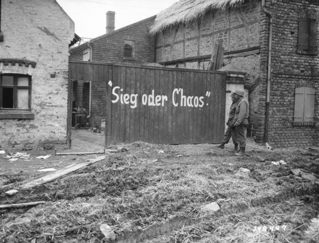 Soldiers of US 1 Infantry Division read the slogan “Sieg oder Chaos” or “Victory or Chaos” in the village of Vettweiss, March 1945.