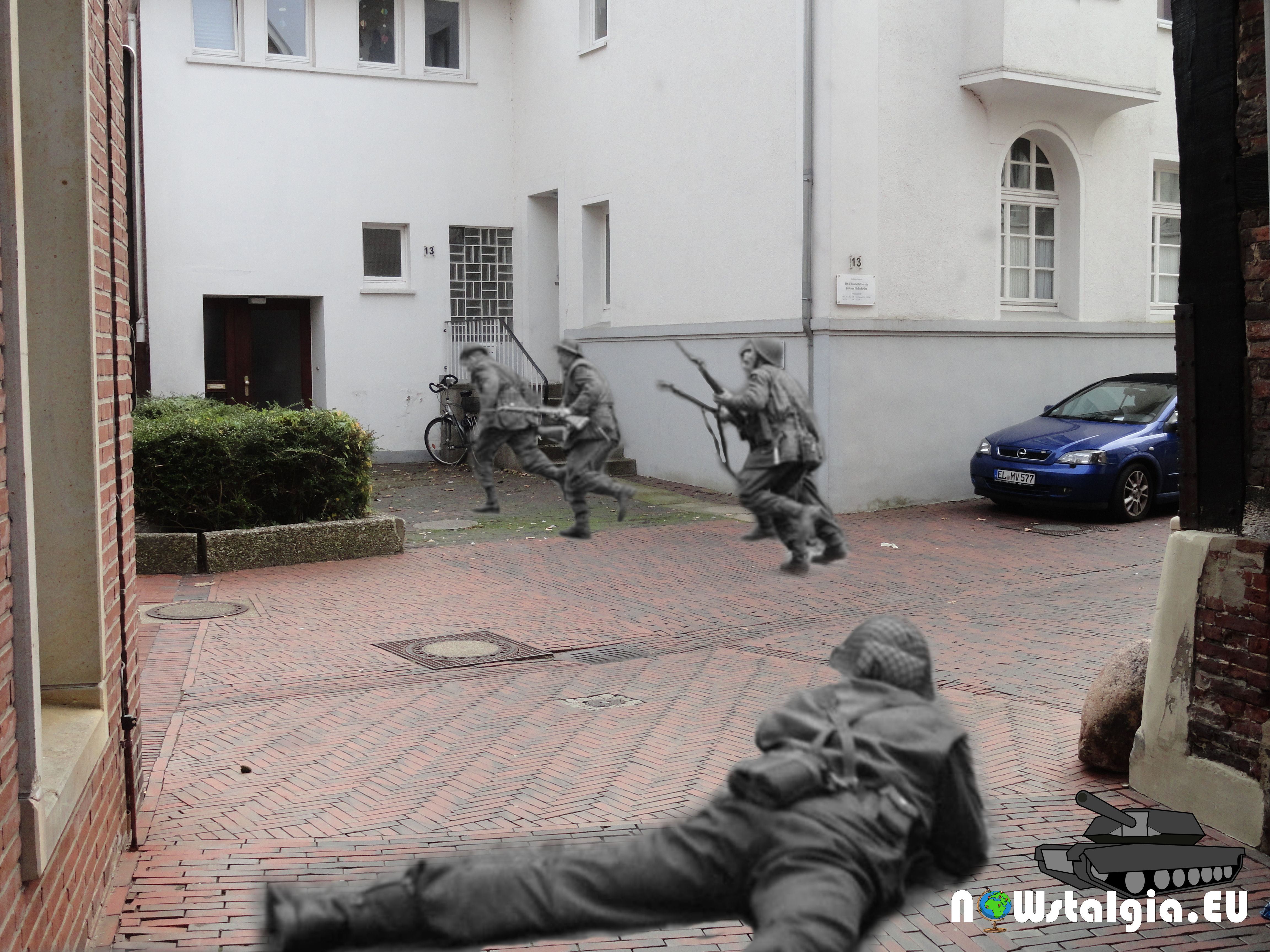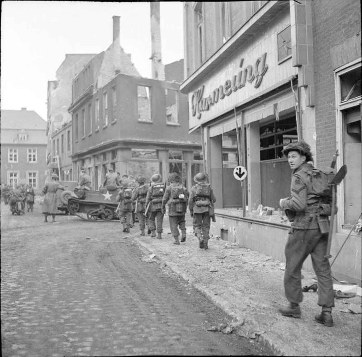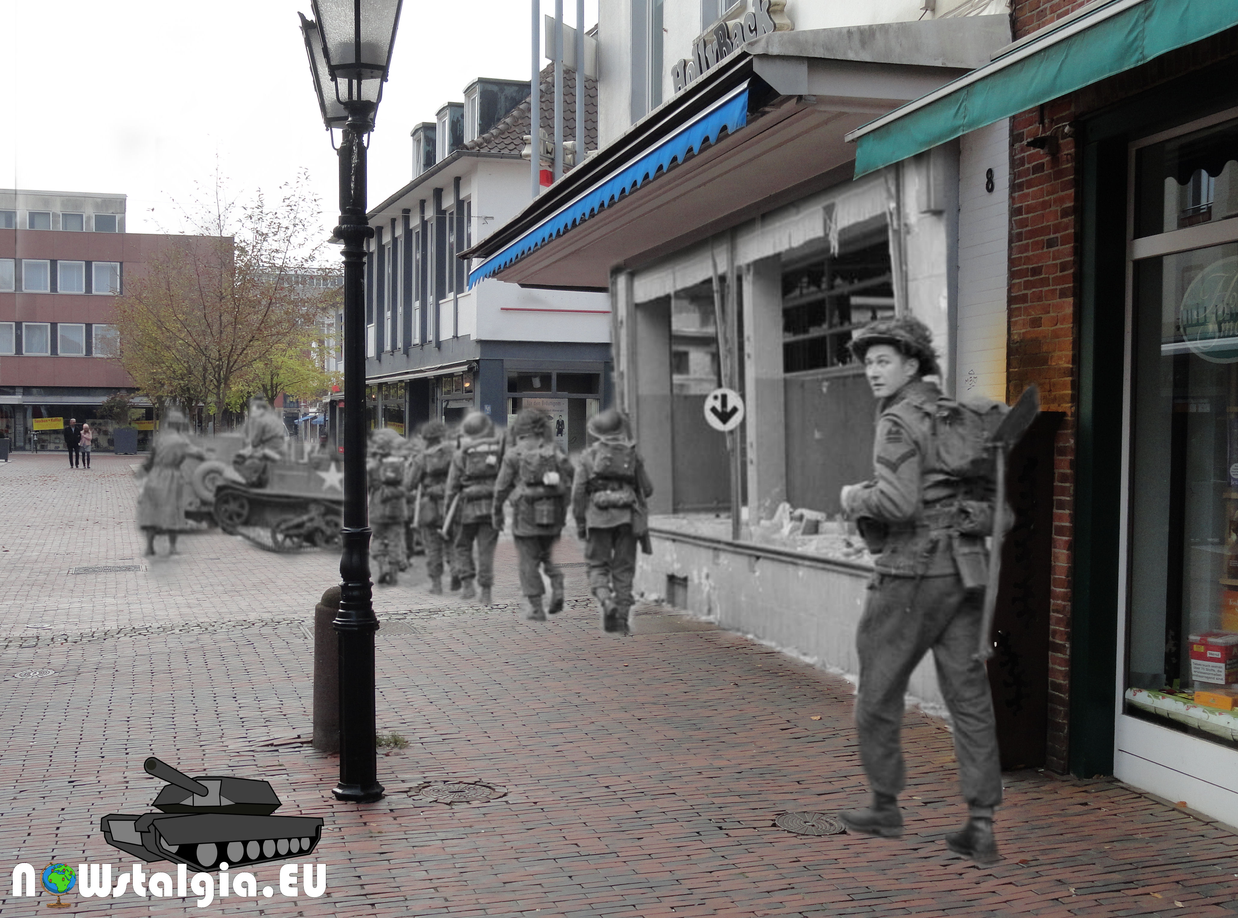 Infantry and carriers in the German town of Lingen, 6 April 1945. Note: The building on the far right is the same.