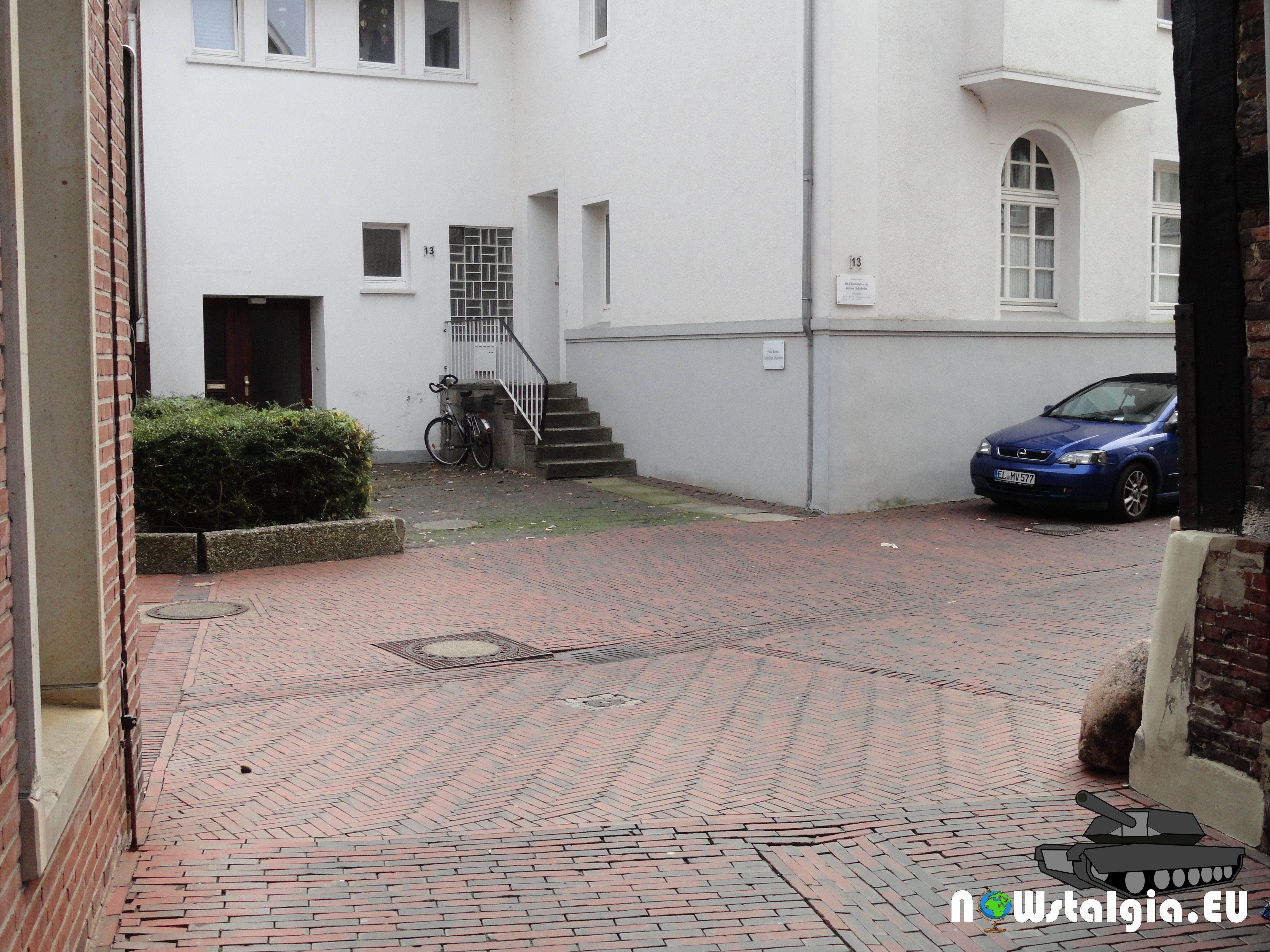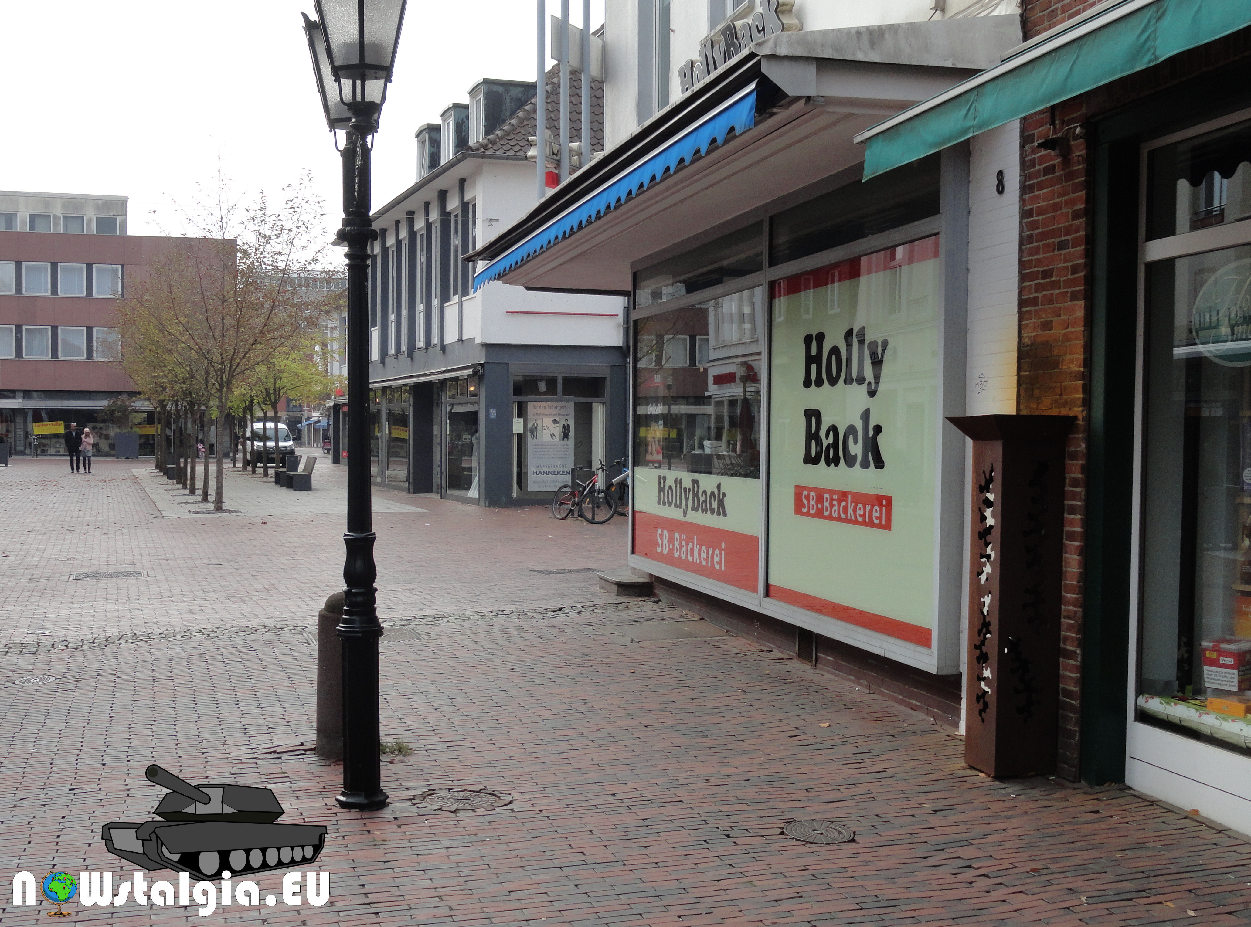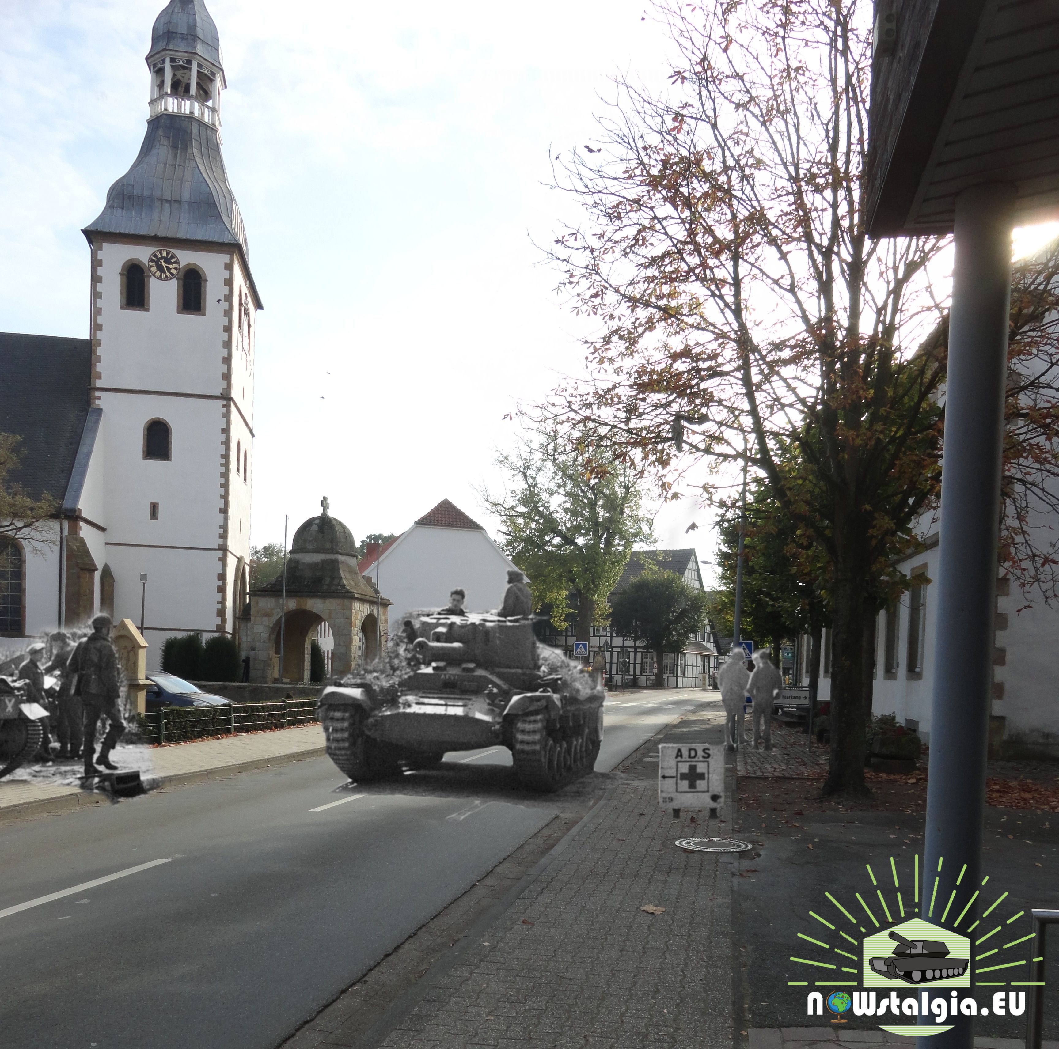 Infantry and carriers in the German town of Lingen, 6 April 1945. Note: The building on the far right is the same.