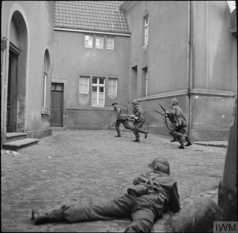 Infantry of 3rd Division clearing out snipers in the town of Lingen, 7 April 1945.