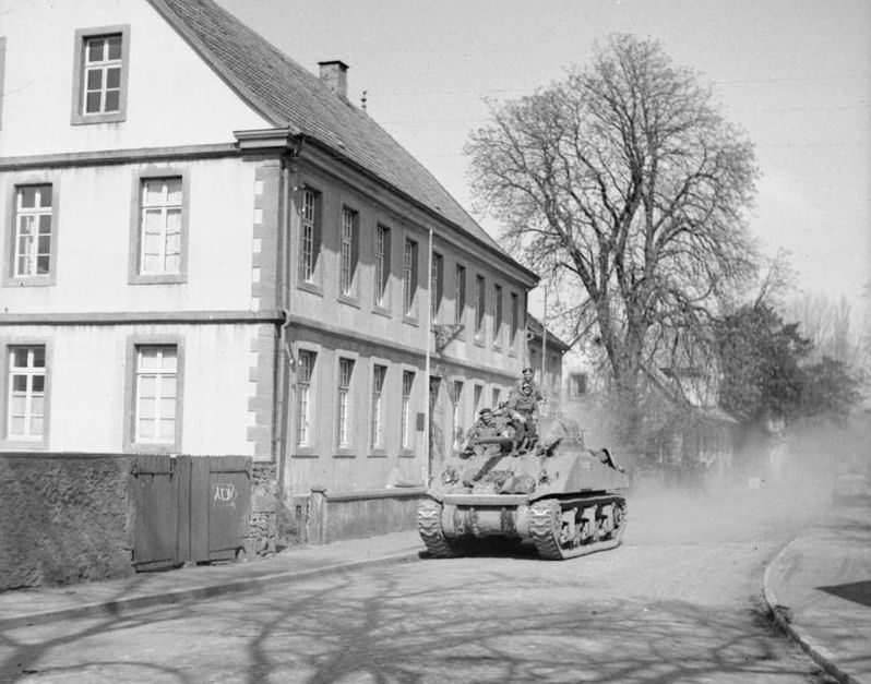 A Sherman tank passing through Hopsten, 6 – 8 April 1945 during operation