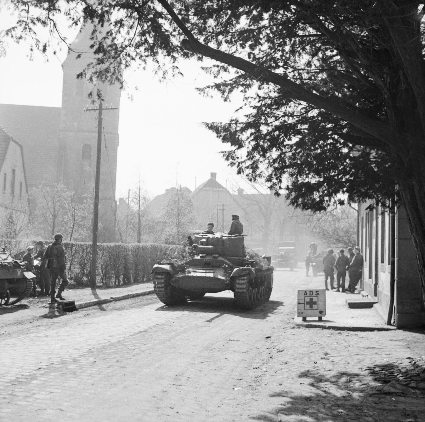 A Valentine Mk XI artillery OP tank passing through Hopsten, Germany around 6 – 8 April 1945.