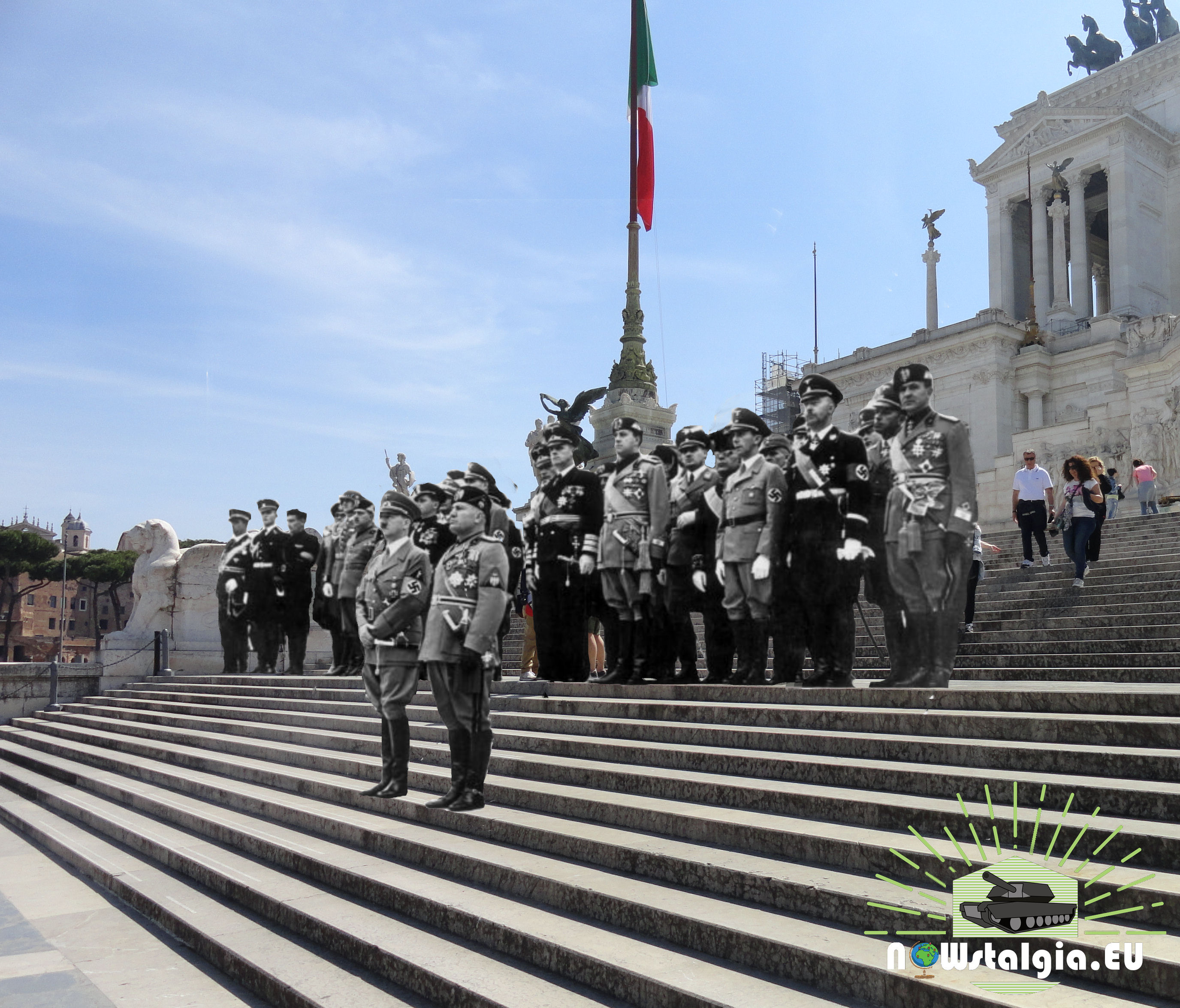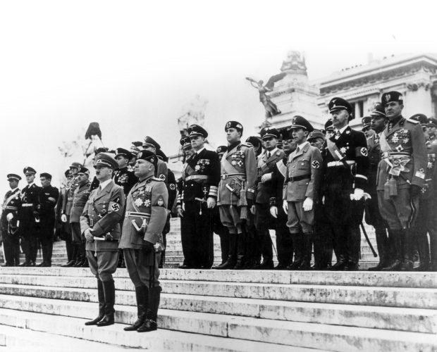 Mussolini and Hitler with Nazi and Fascist officials on the steps of the Vittoriano in Rome in May 1938.