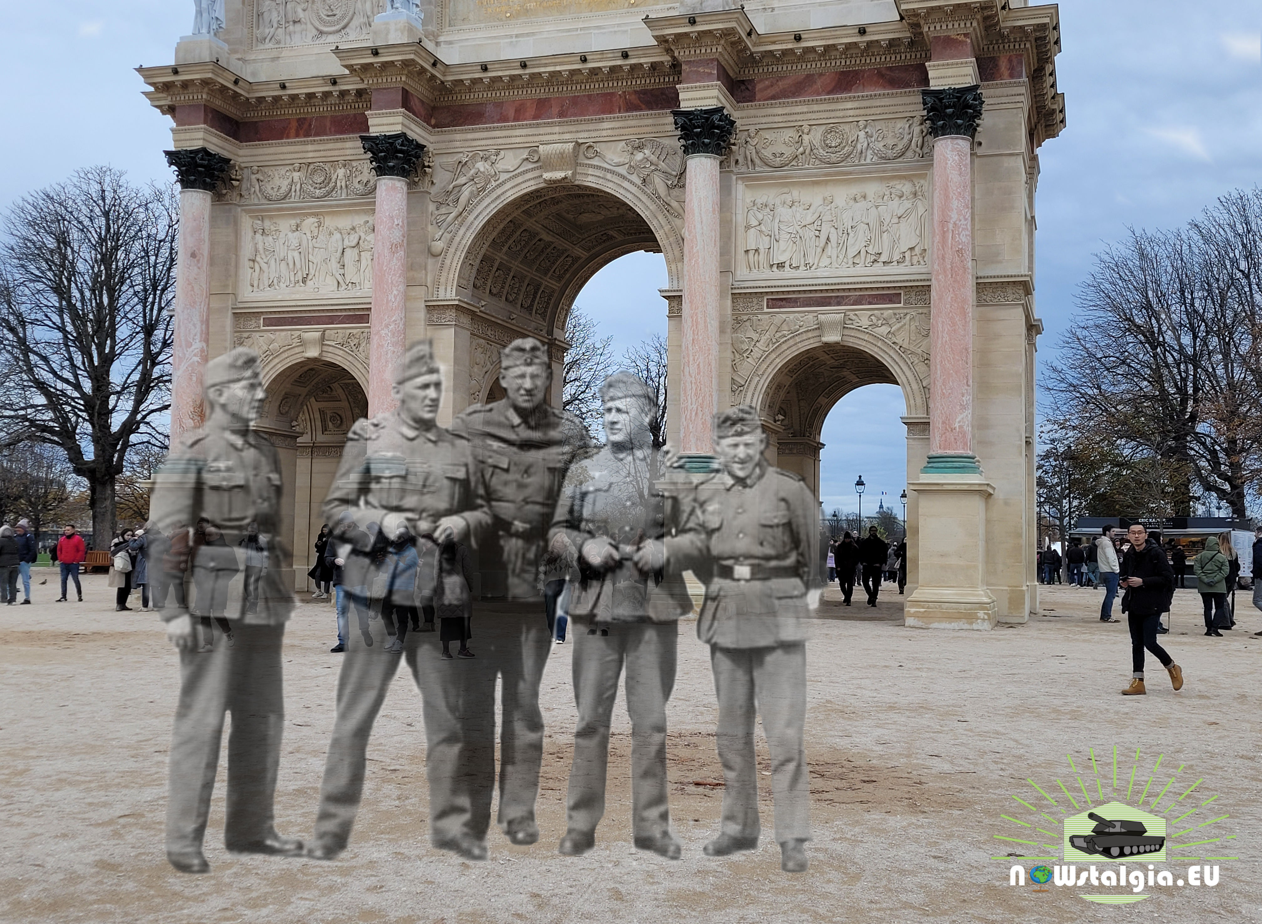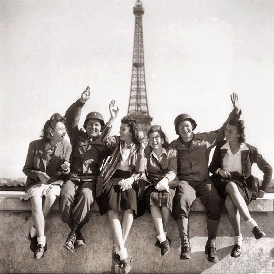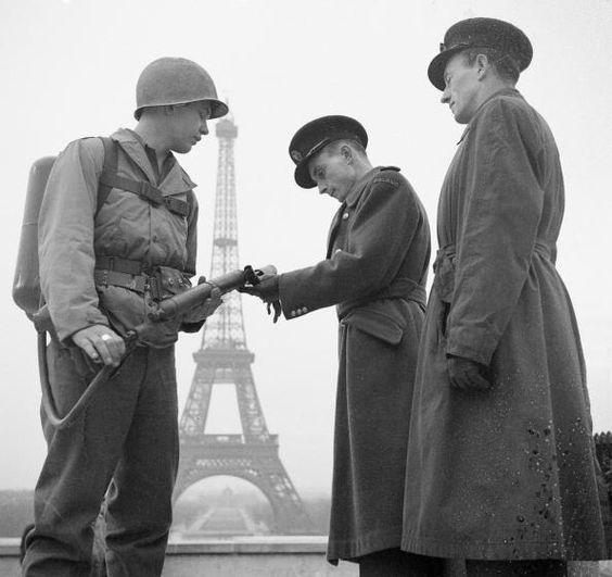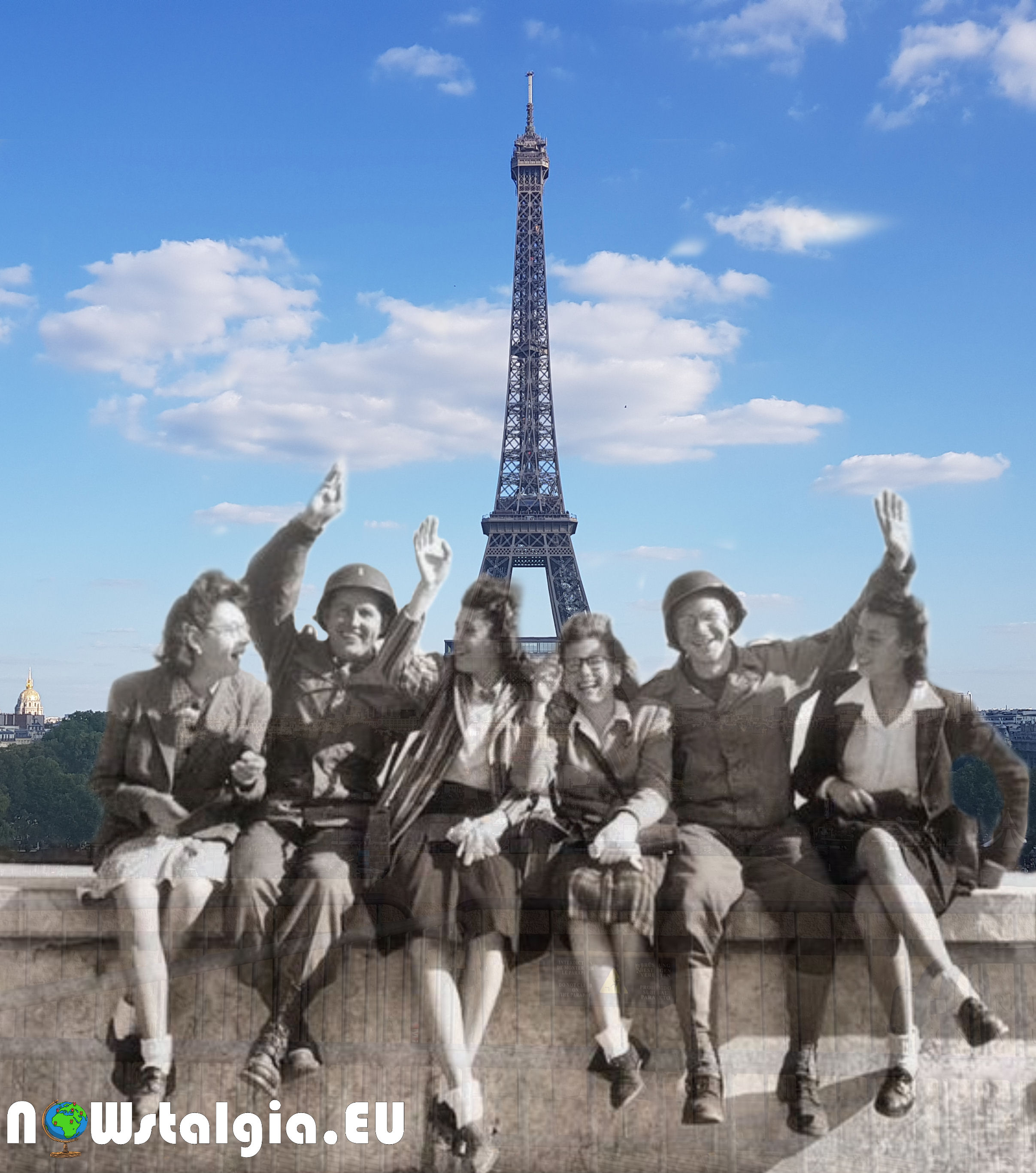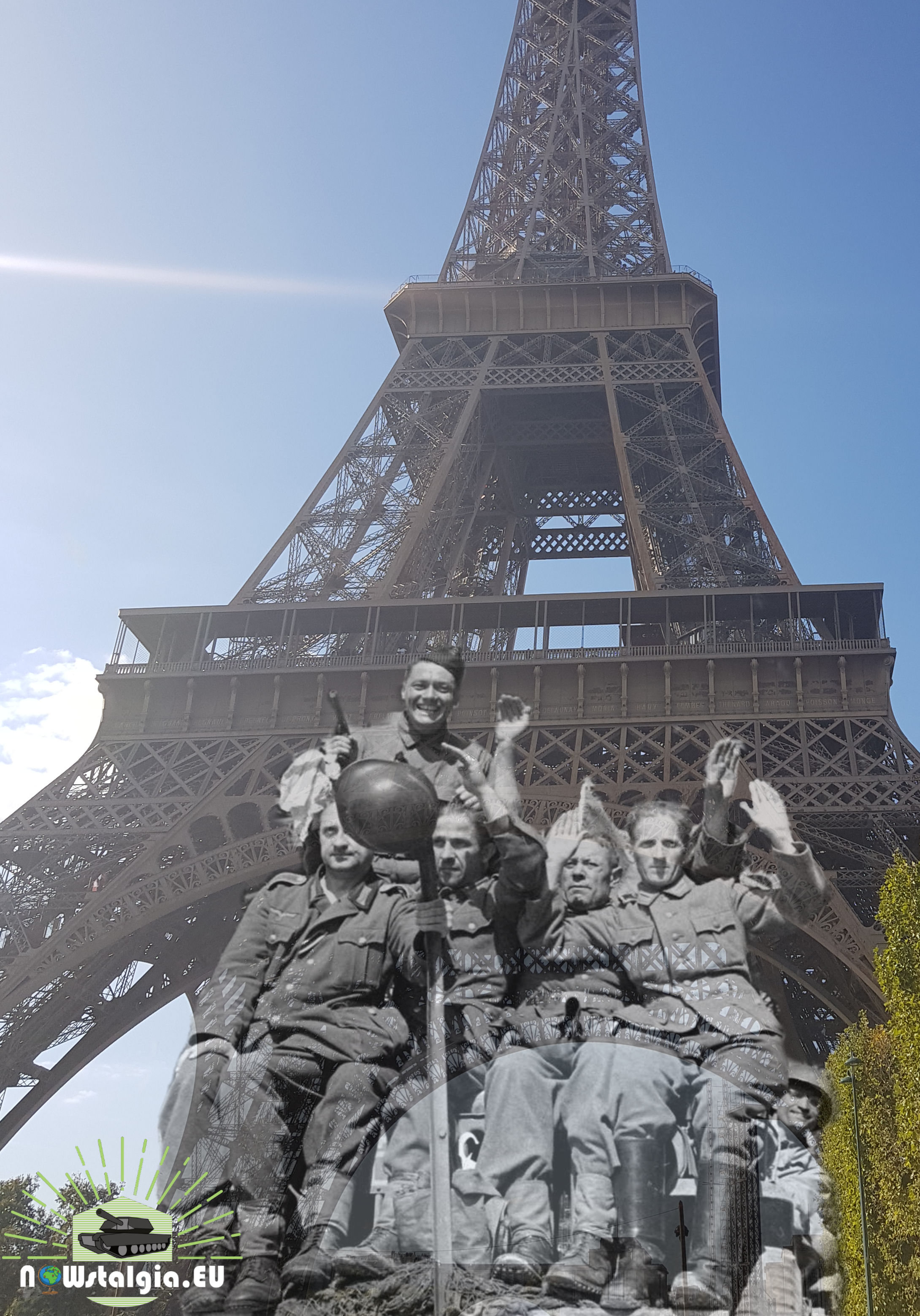 Allied soldiers in front of the eiffeltower in Augustus 1944 during the liberation of Paris.