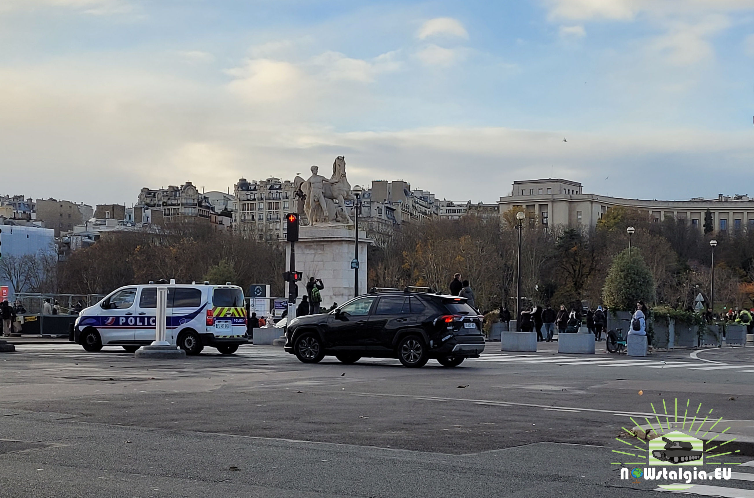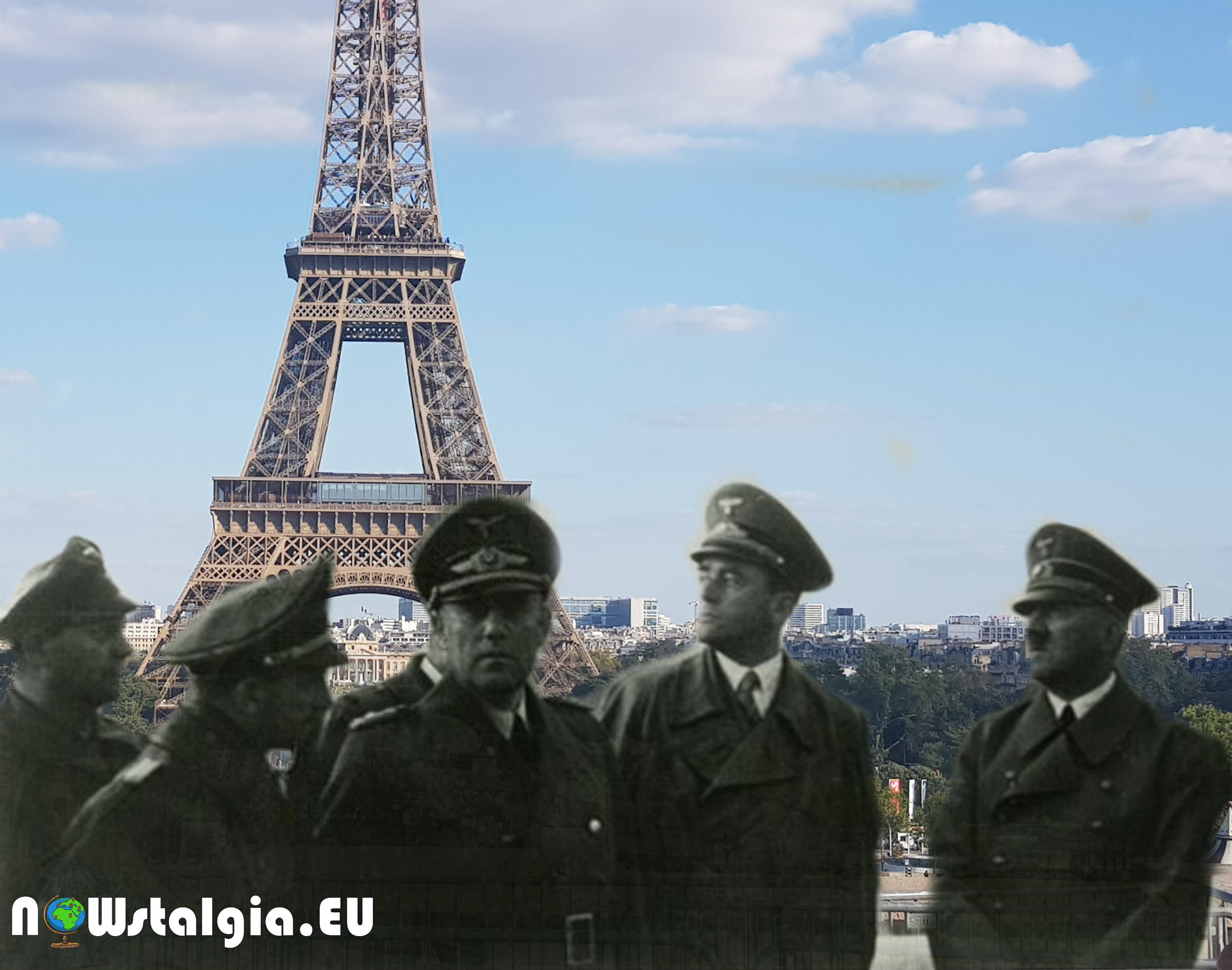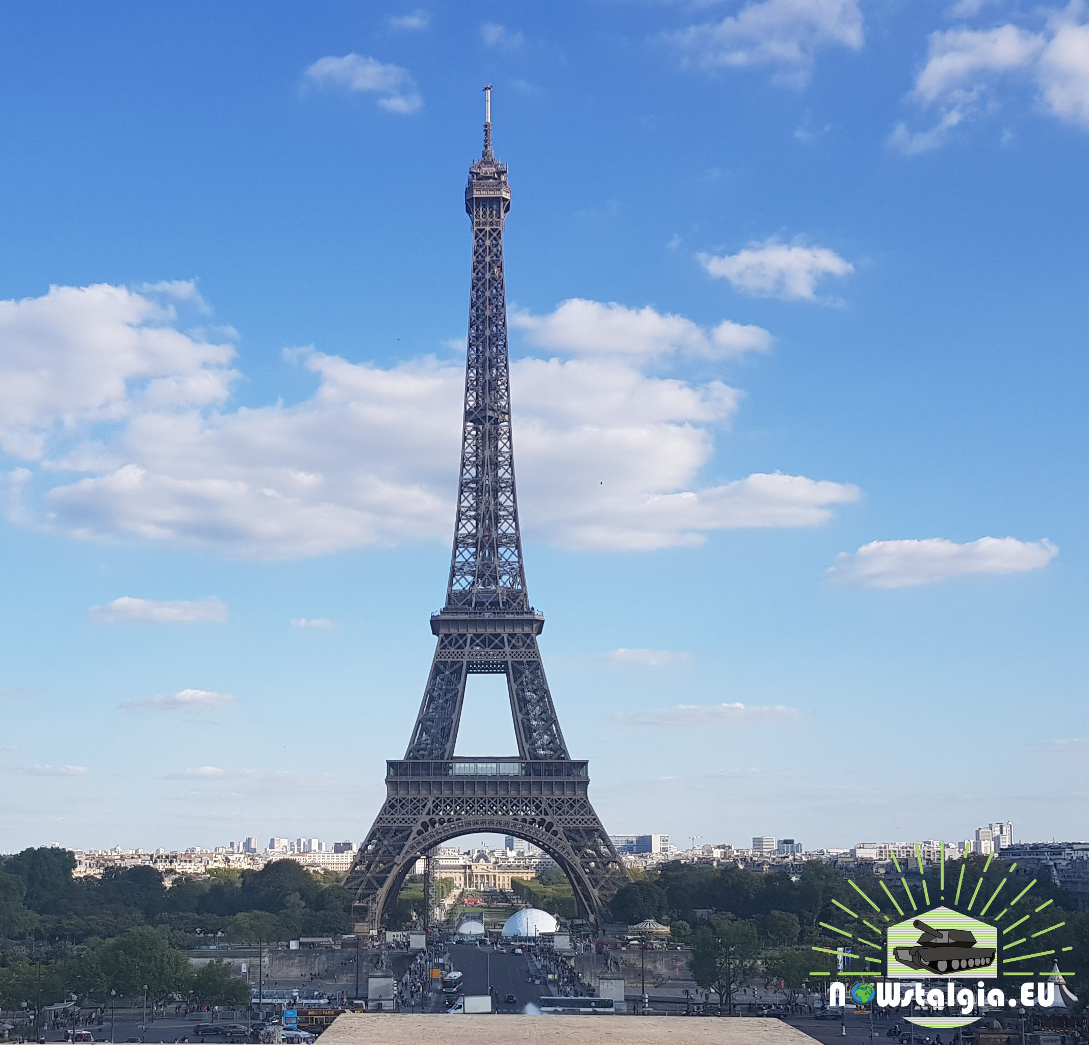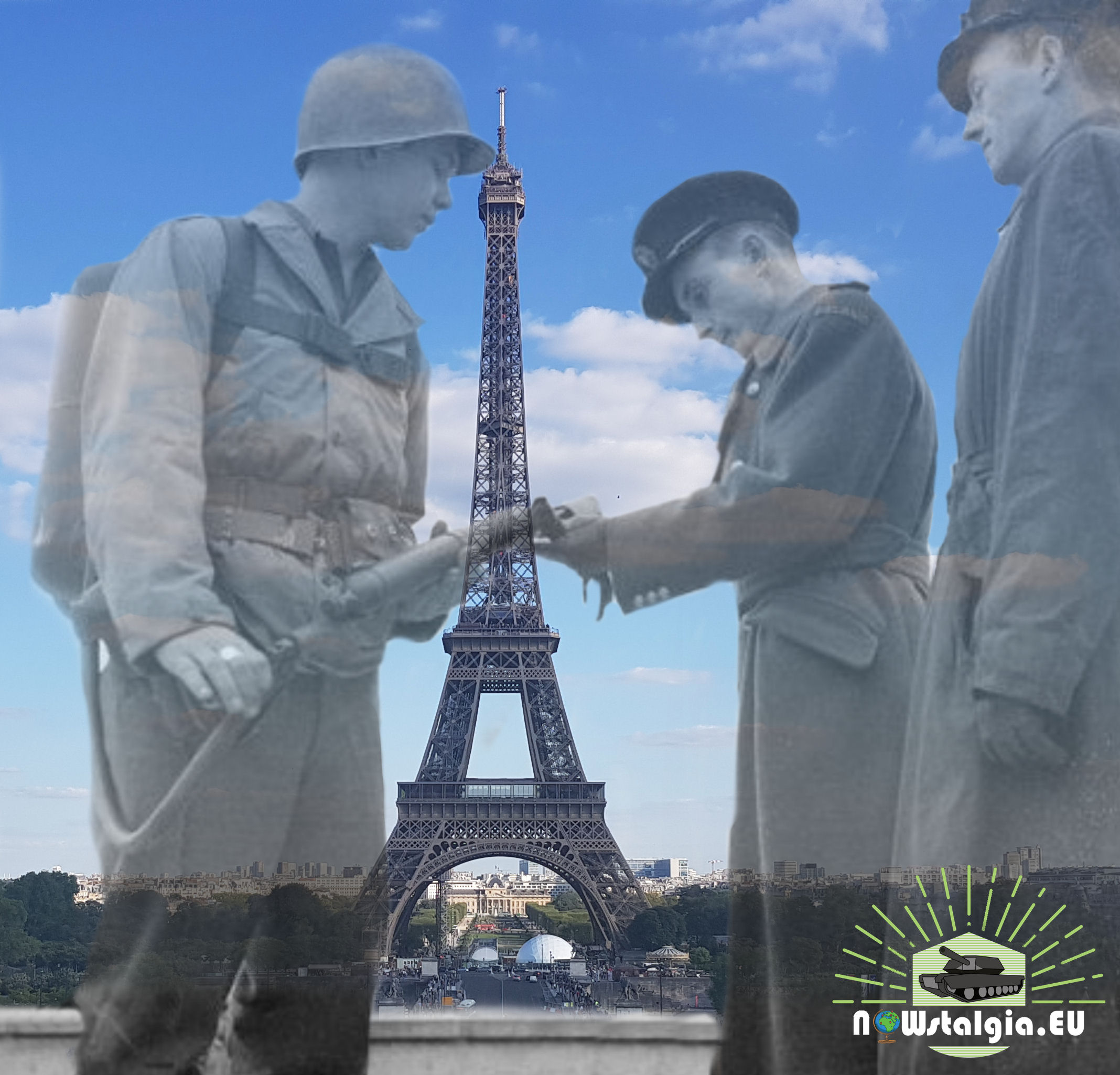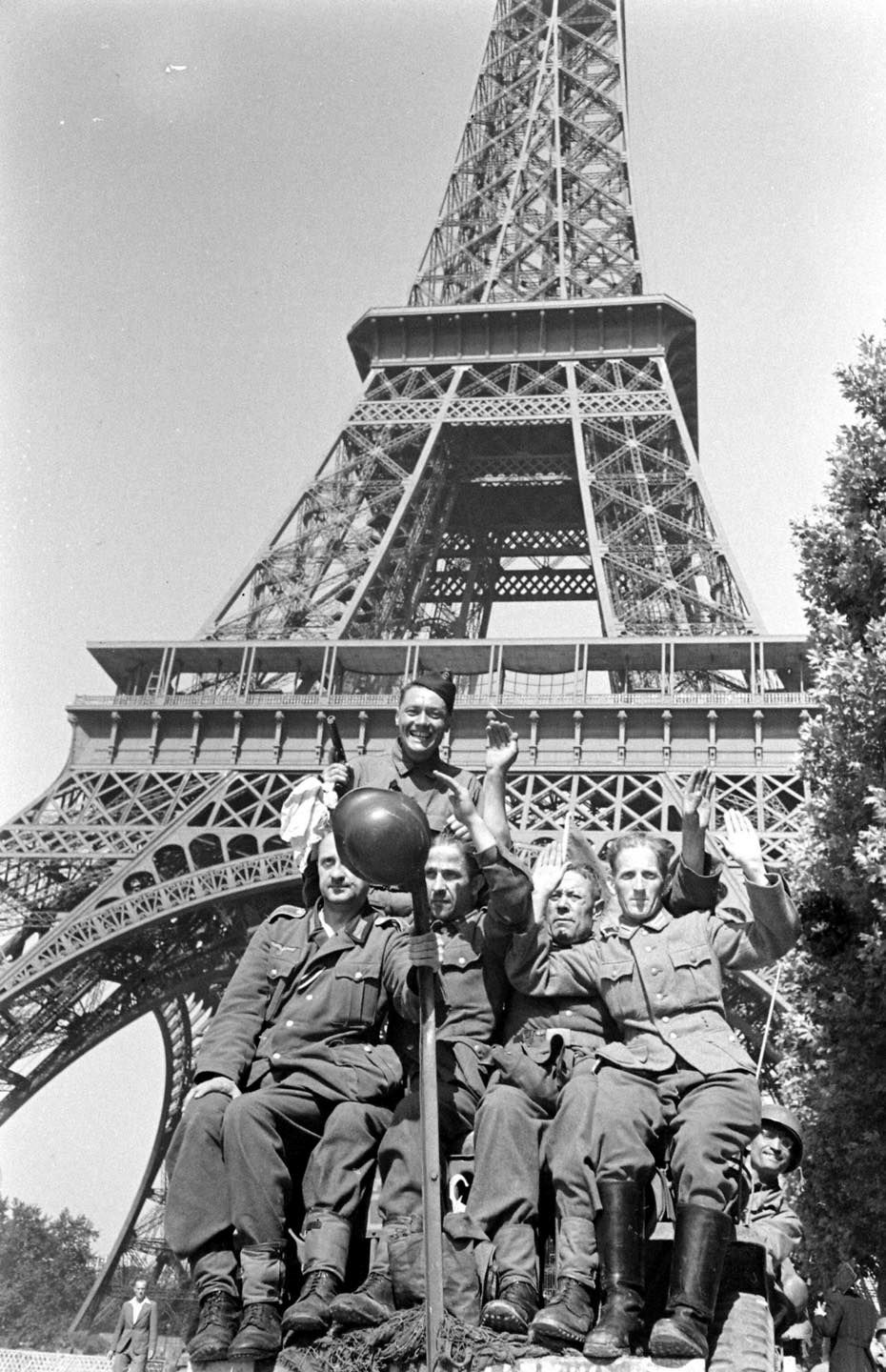 German prisoners with their guard on a jeep in front of the Eiffel Tower during the Liberation of Paris – August 1944.