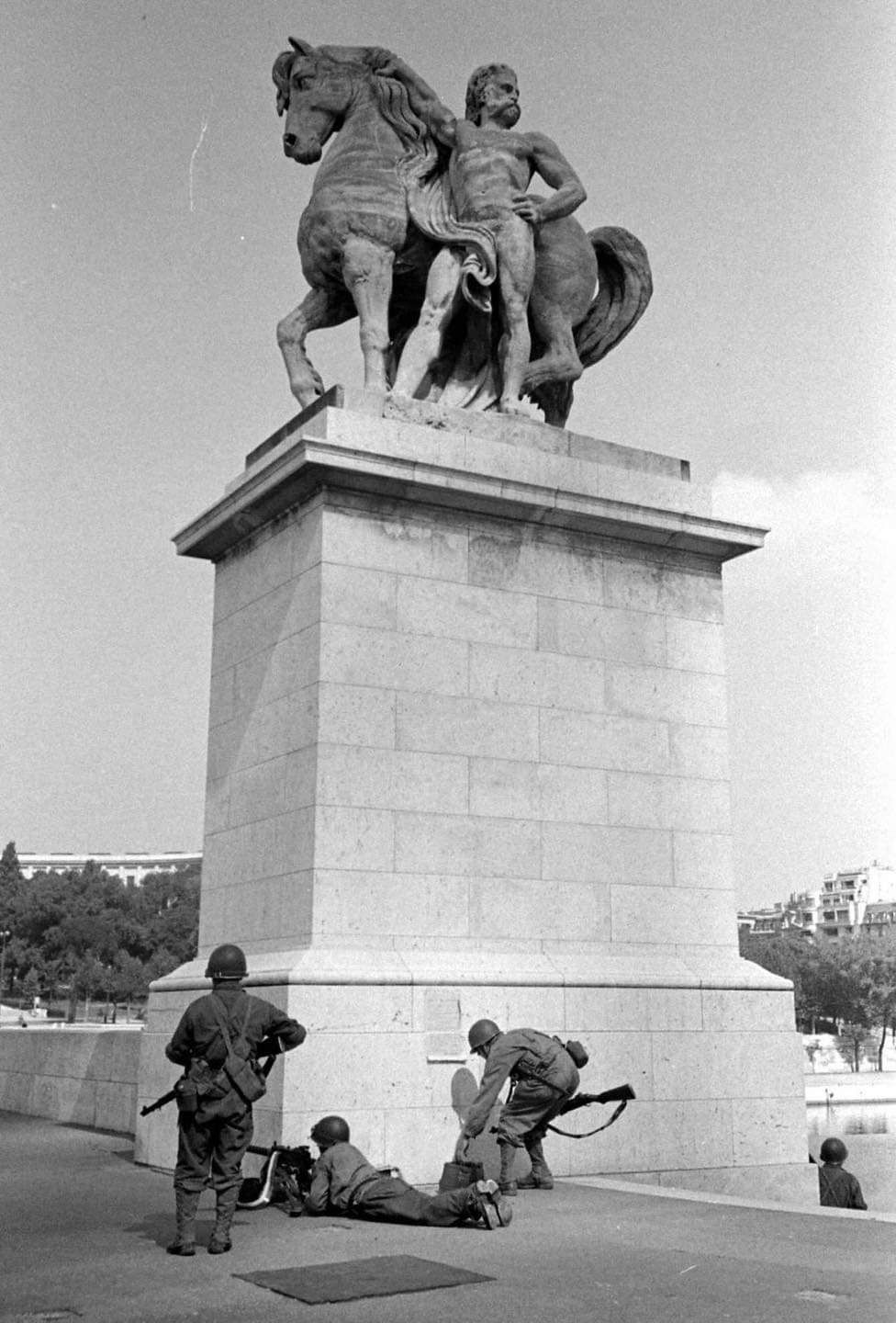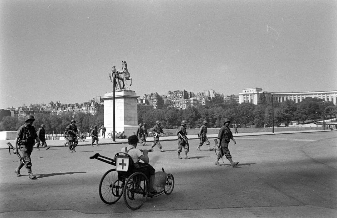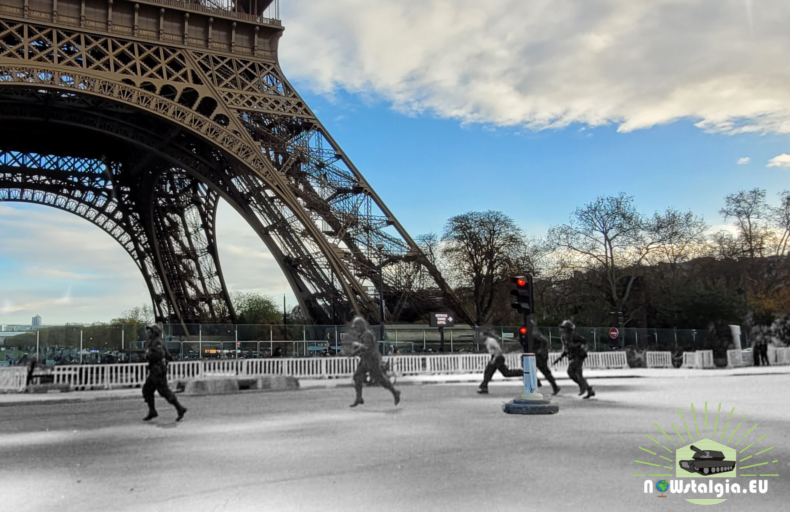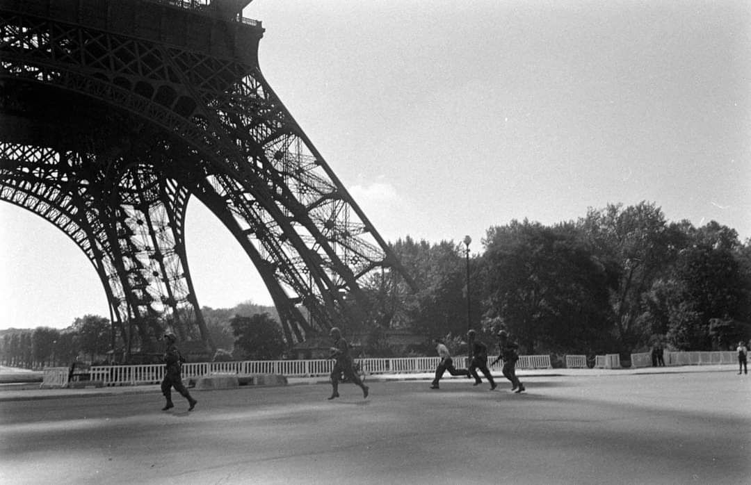 Allied soldiers near the Eiffeltower on the way to cross the Pont d’Iéna a 19th century bridge over the river Seine in the center of Paris.