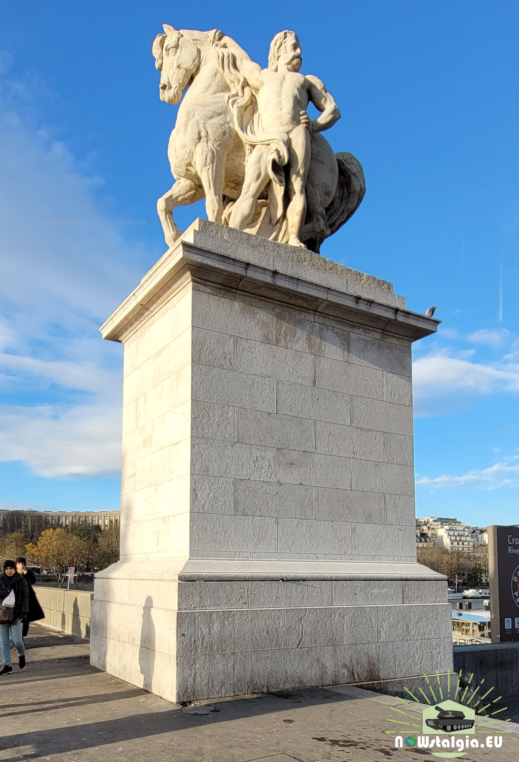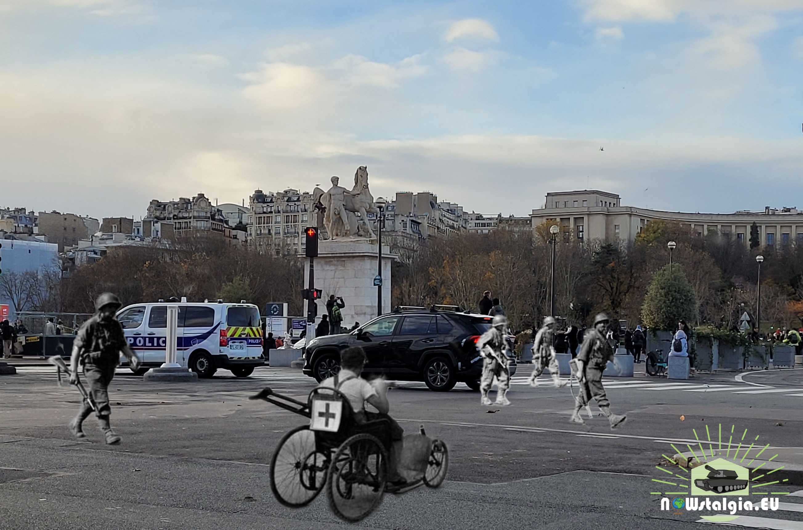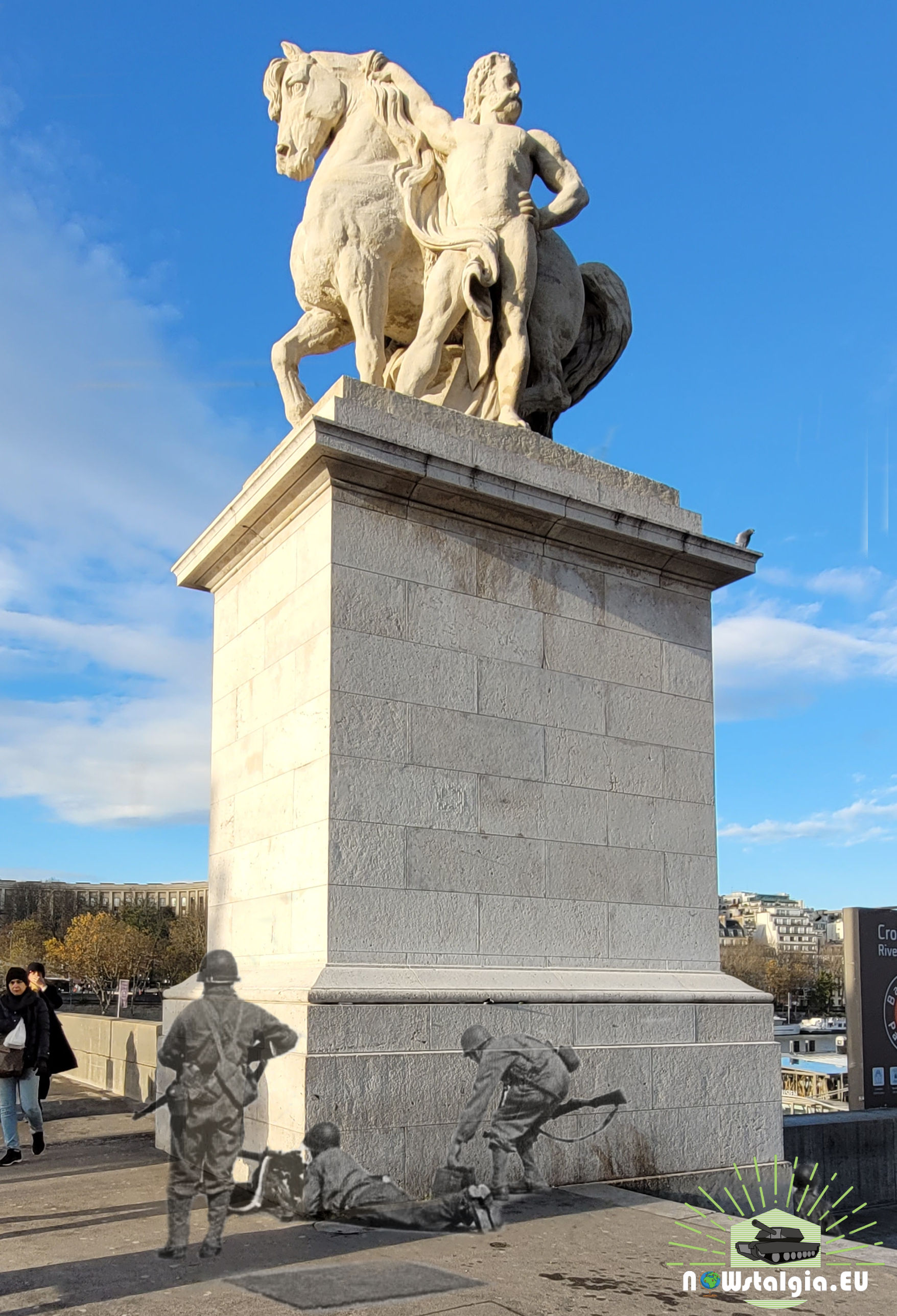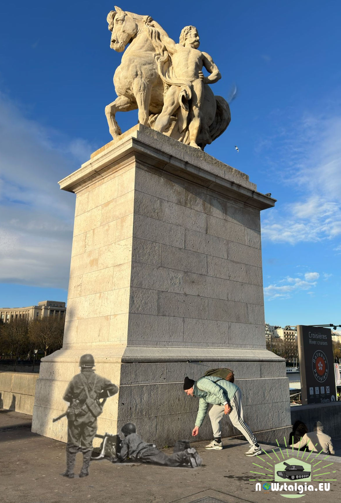 Allied soldiers near the Eiffeltower on the way to cross the Pont d’Iéna a 19th century bridge over the river Seine in the center of Paris.