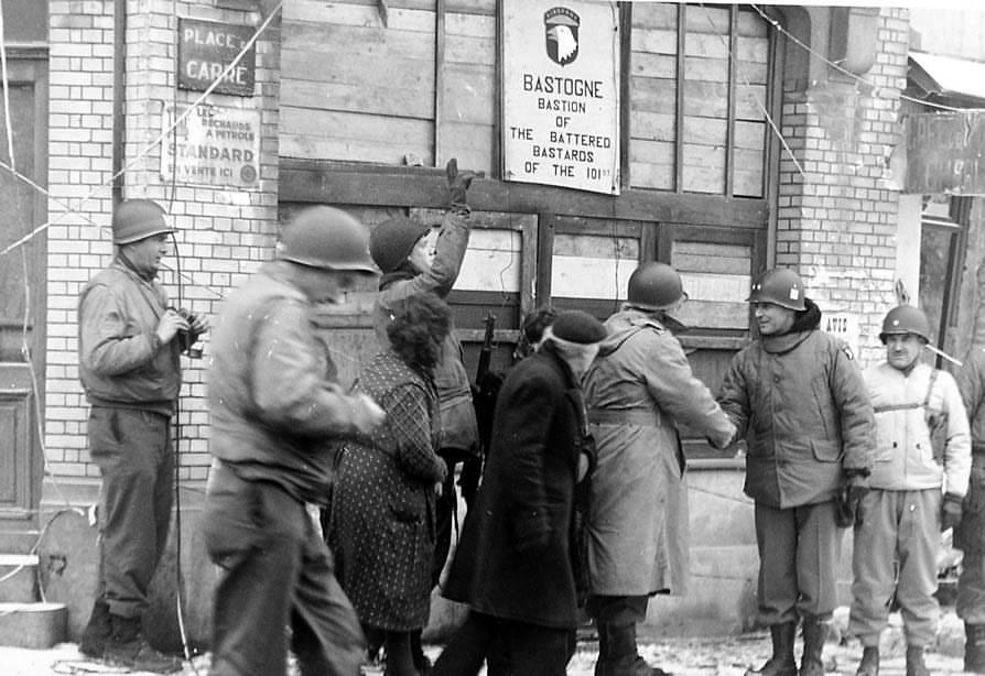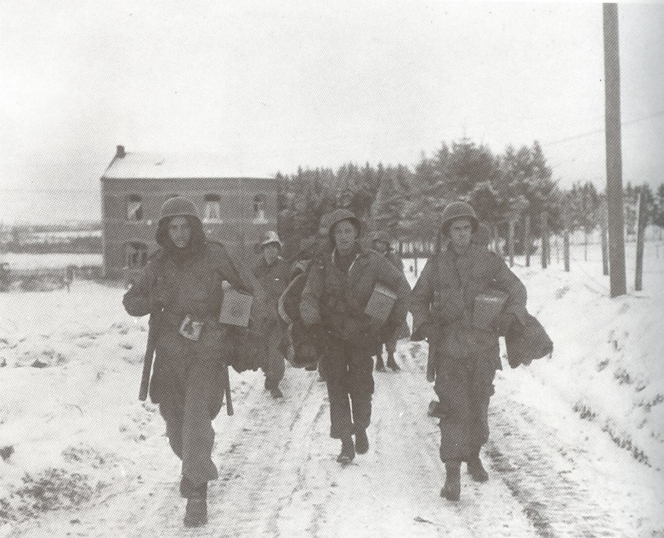 Soldiers of the 101st Airborne Division march in two columns along a road on the outskirts of the Belgian crossroads town during the Battle of the Bulge.