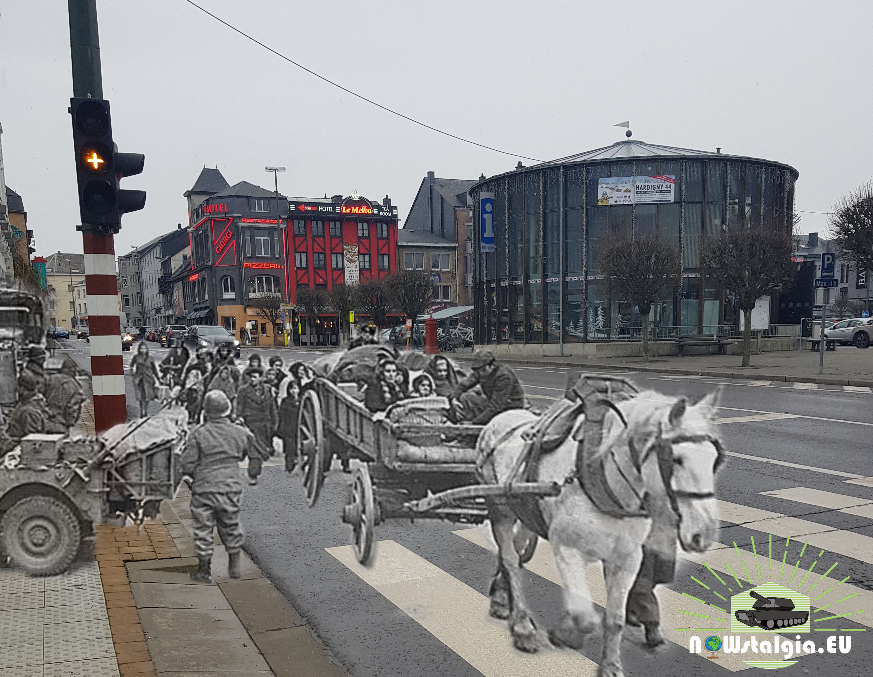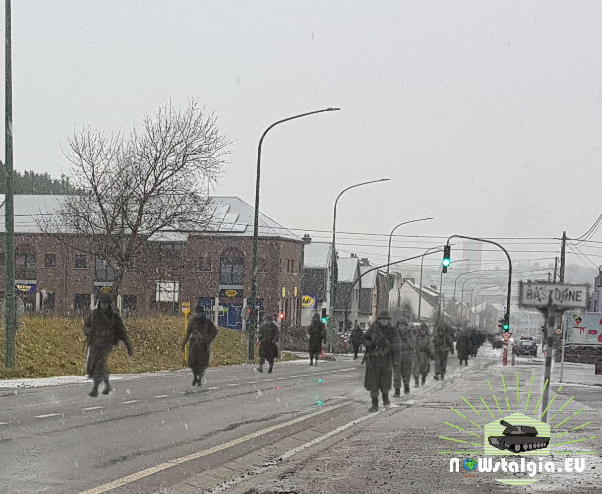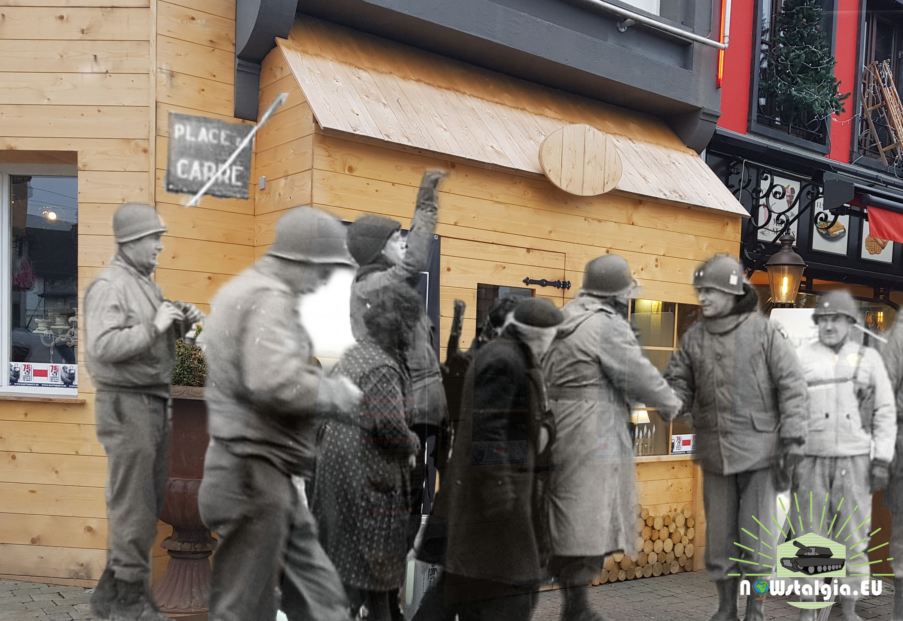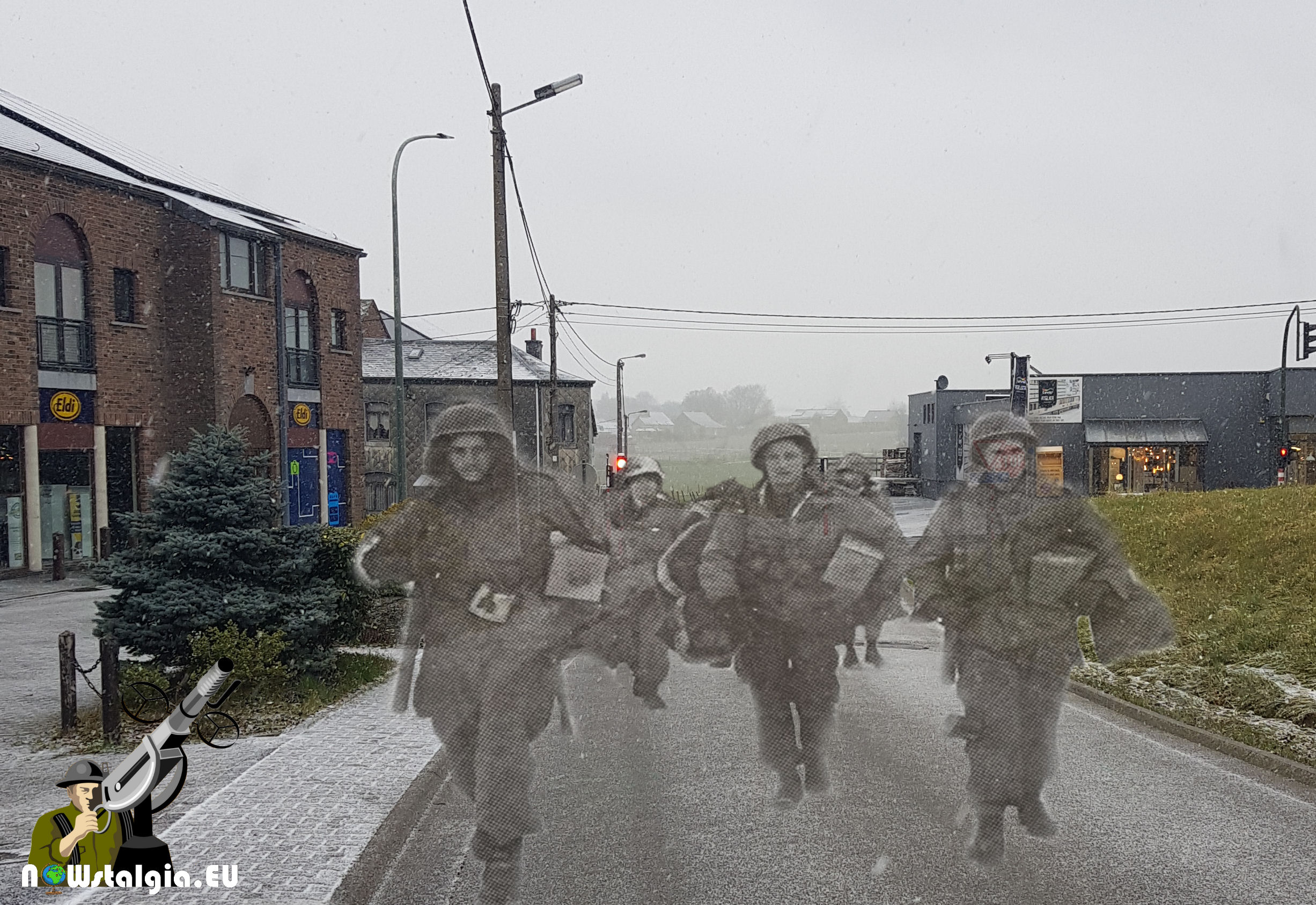 Soldiers of the 101st Airborne division in Bastogne at the Rue de la Chapelle in January 1945. When I was there two weeks ago it was snowing too.