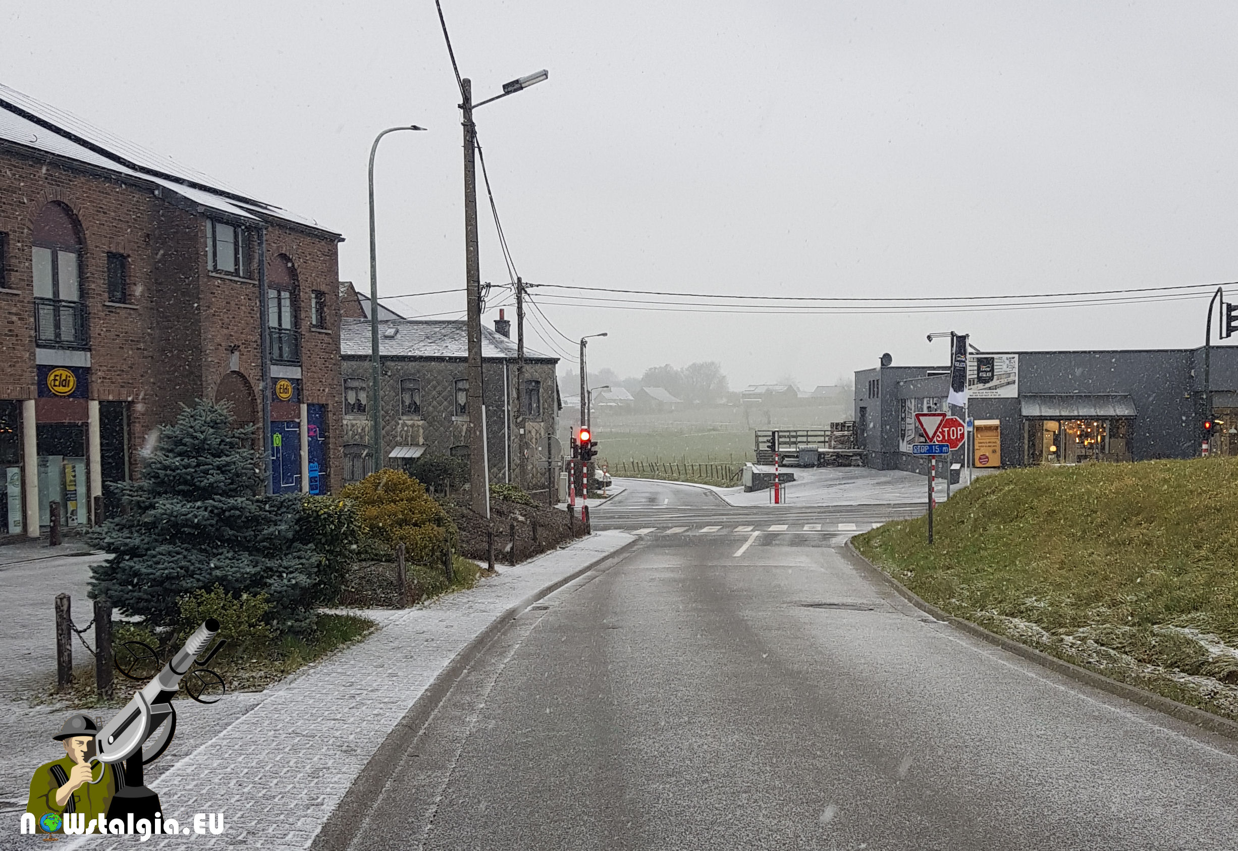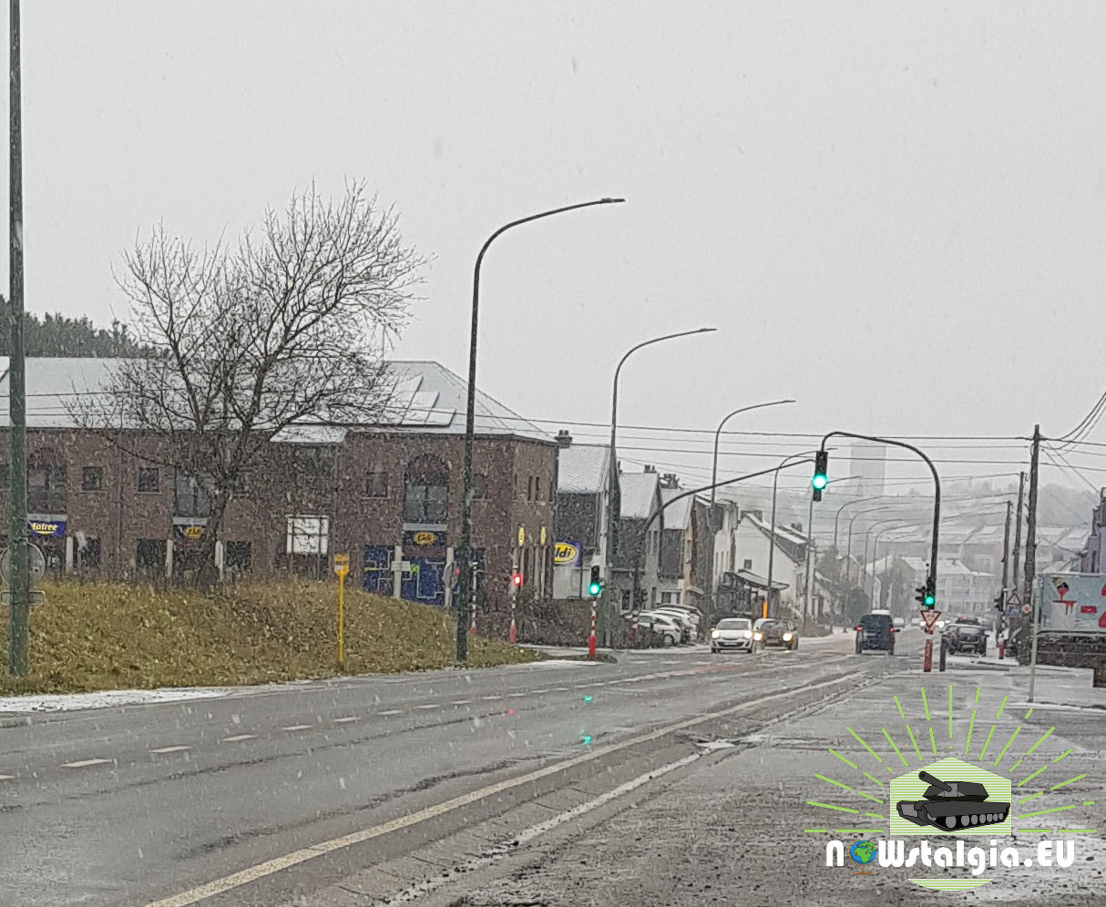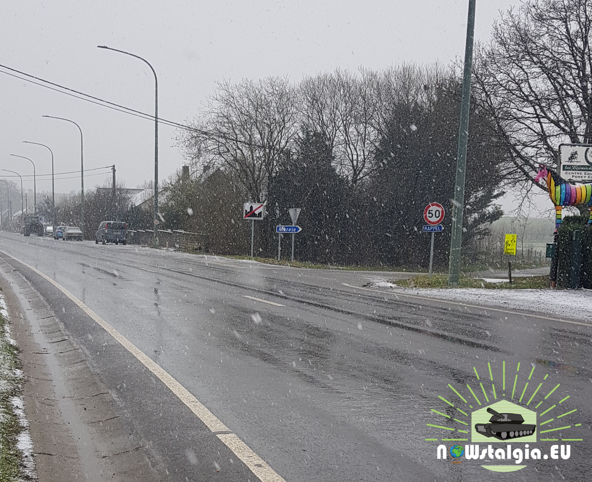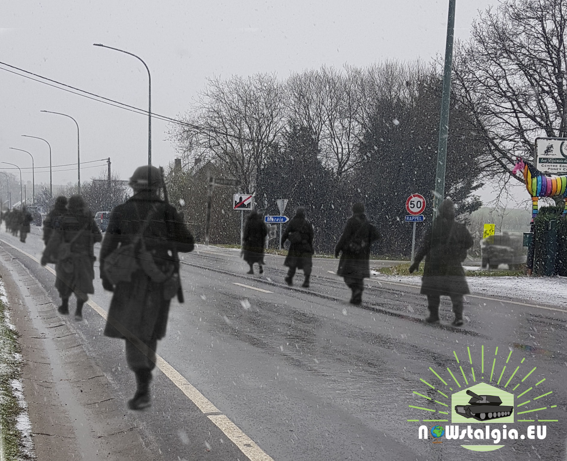 Soldiers of the 101st Airborne division in Bastogne at the Rue de la Chapelle in January 1945. When I was there two weeks ago it was snowing too.