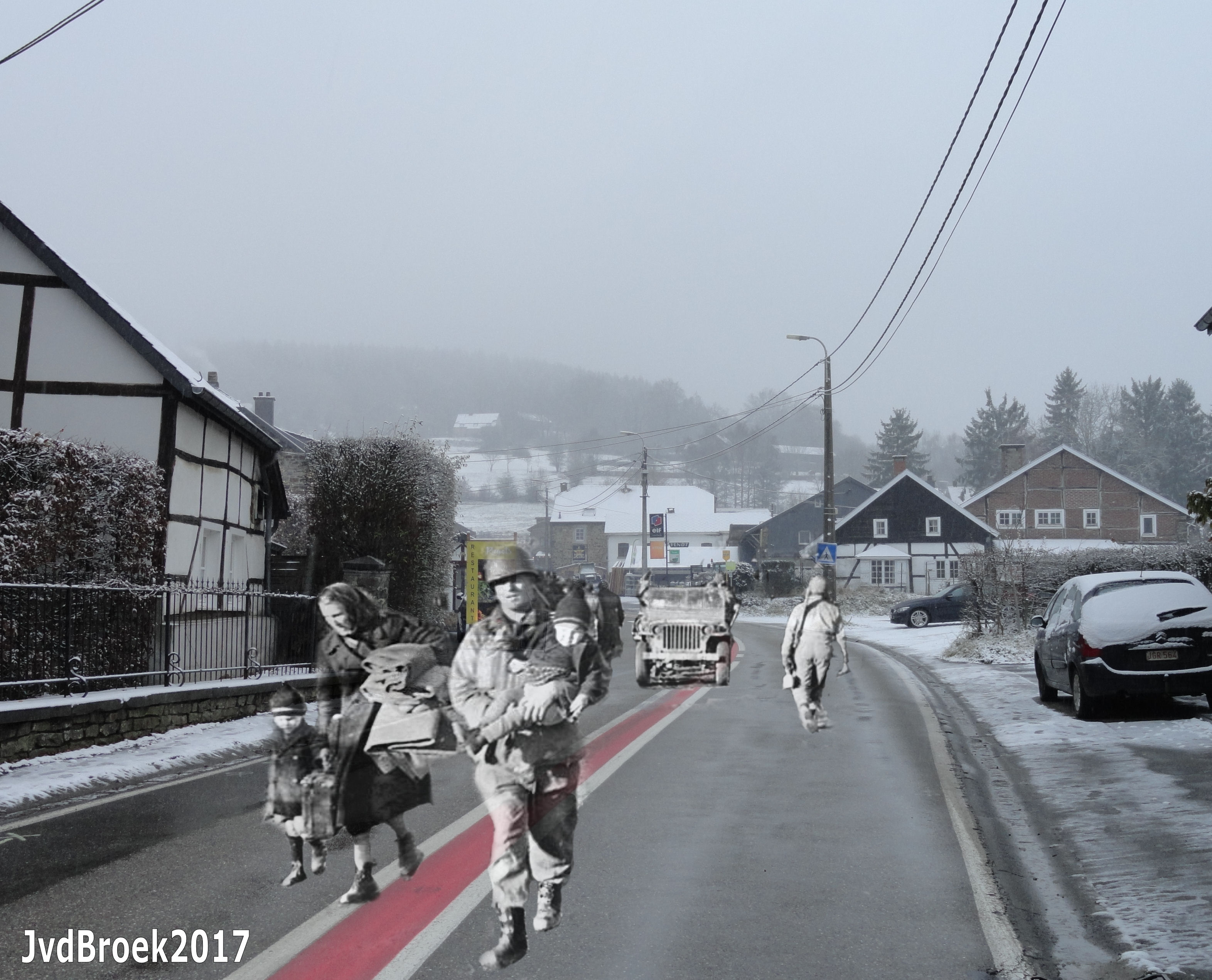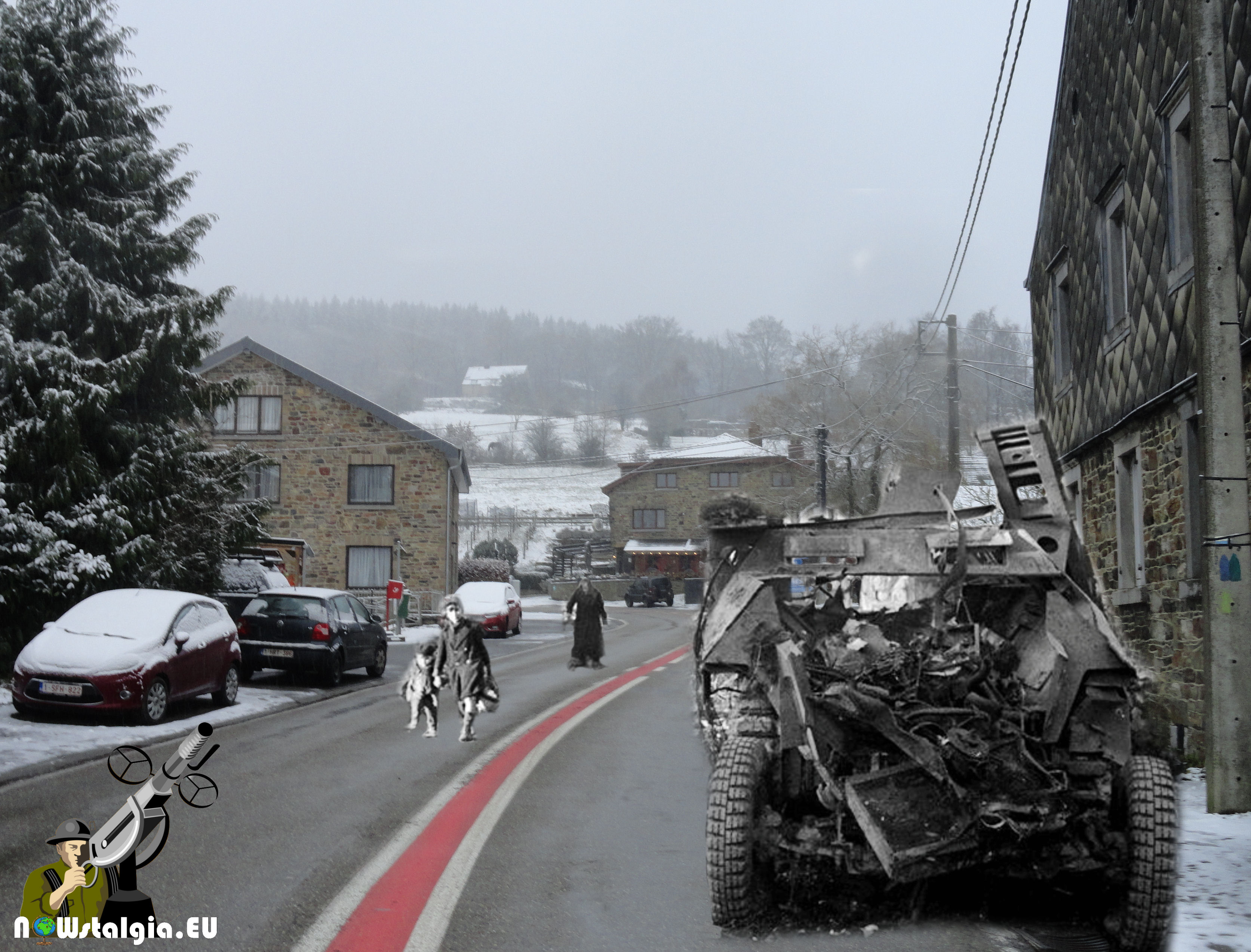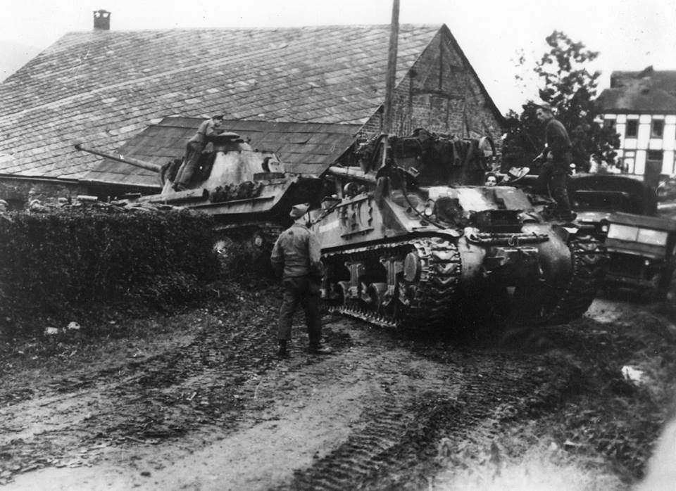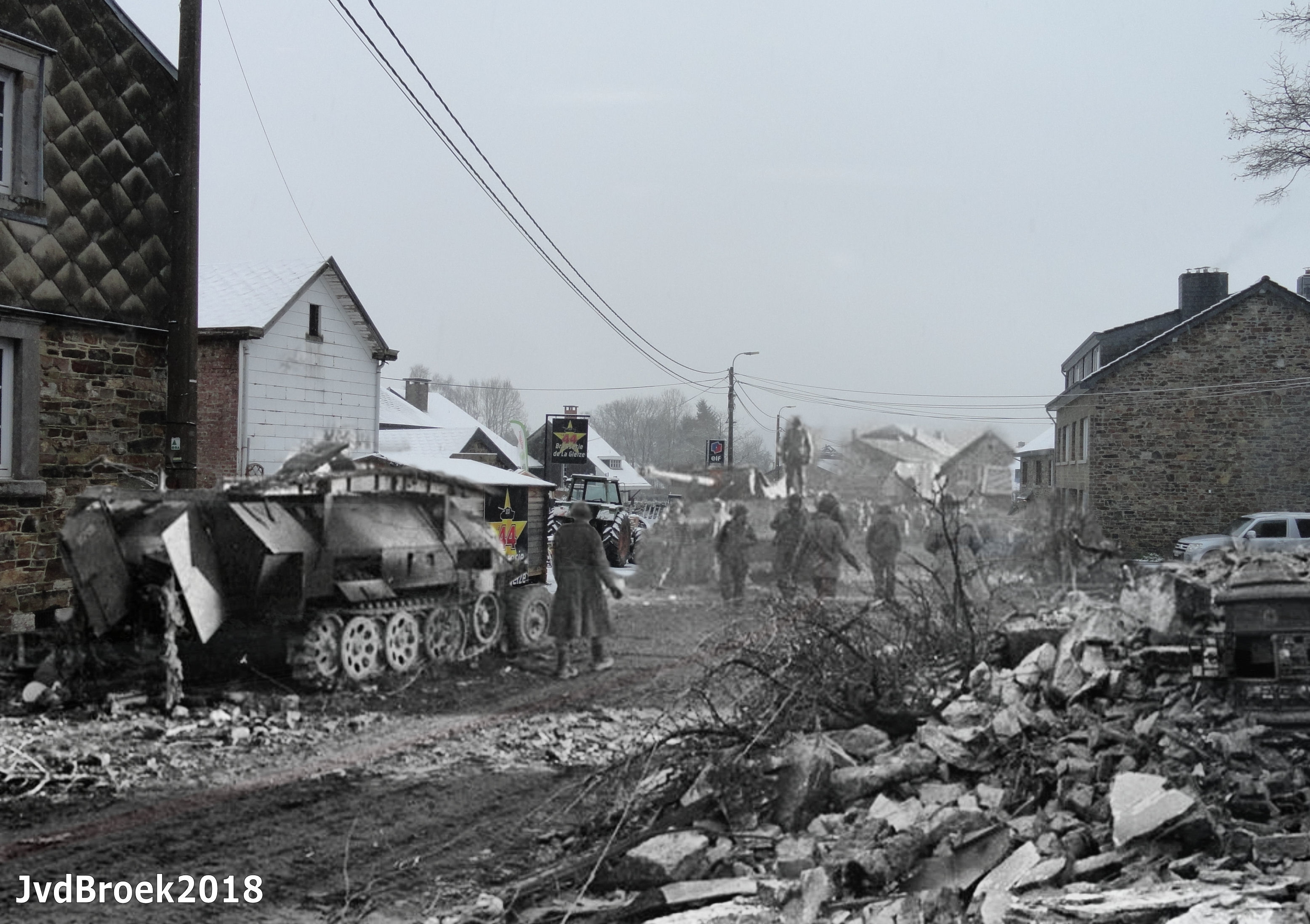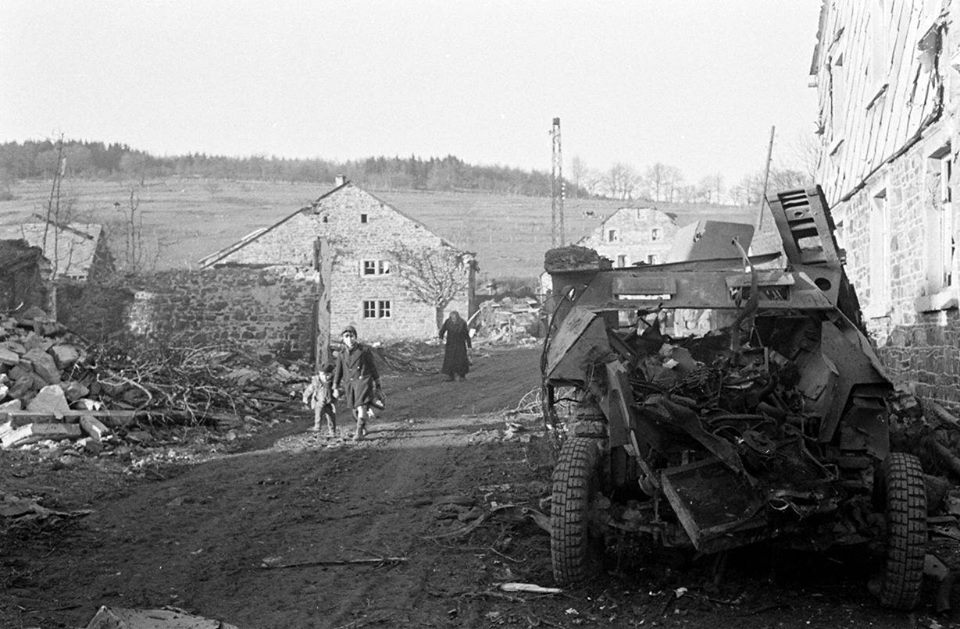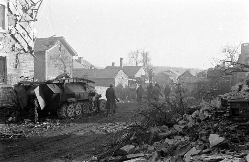 La Gleize after a fierce battle between the Americans and the Kampgruppe Peiper. The 800 German soldiers left around 135 vehicles (including a Tiger II) and fled on foot across the Amblève into the Forest.