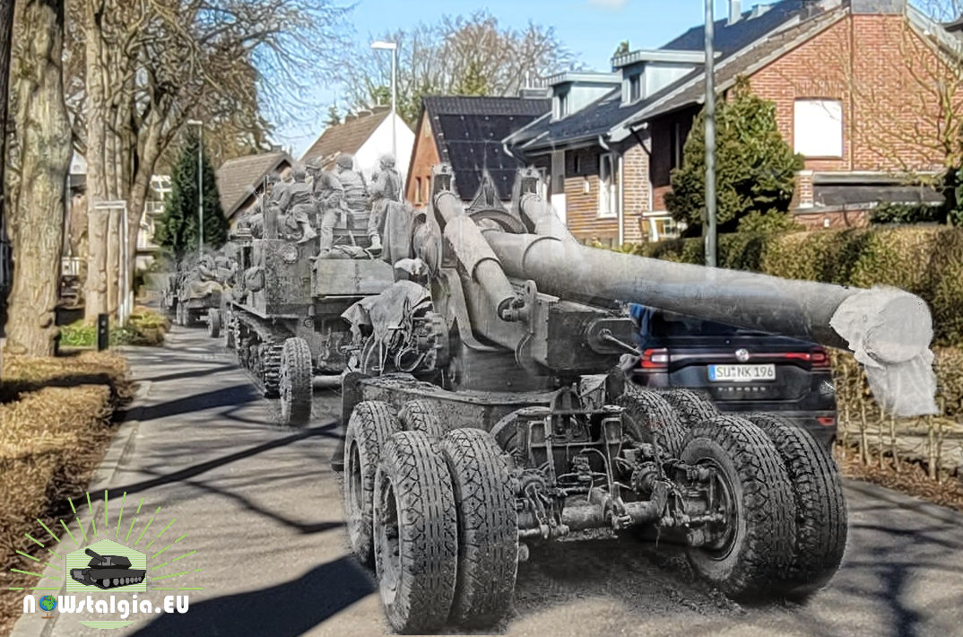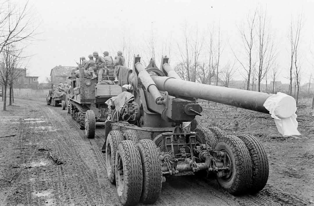 US M4 High-Speed Tractor towing a 155mm “Long Tom” Gun M1 with “B” Battery, 261st Field Artillery, on Anton-Heinen-Straße in Erkelenz, Germany – February 1945.