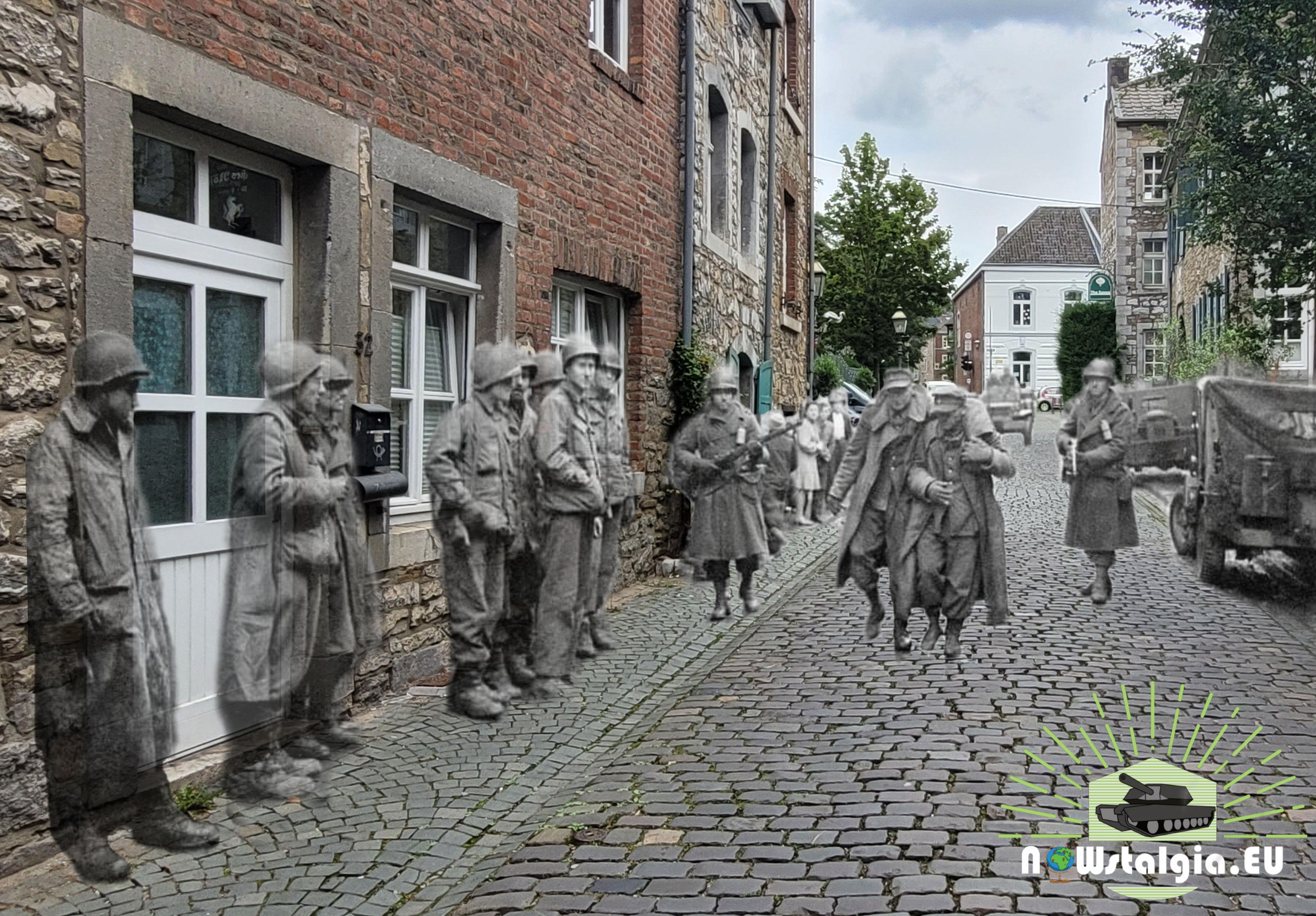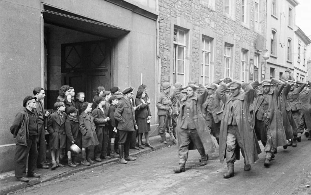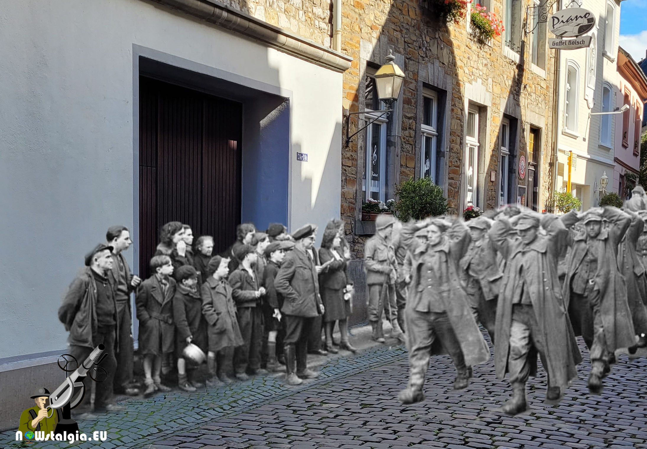 Allied soldiers in front of the Lützow-Kaserne in Aachen end 1944 or early 1945. During the battle for the city many civilians fled to this Kaserne.