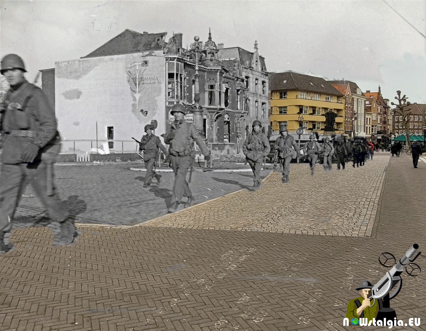 Troops of the 35th Infantry Division, Ninth U.S. Army, move through Venlo, Holland further into Germany, March 2, 1945.