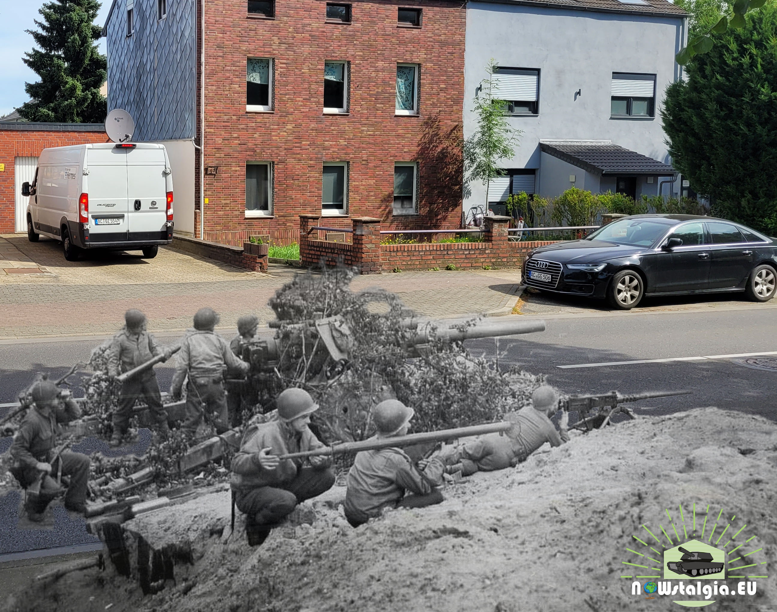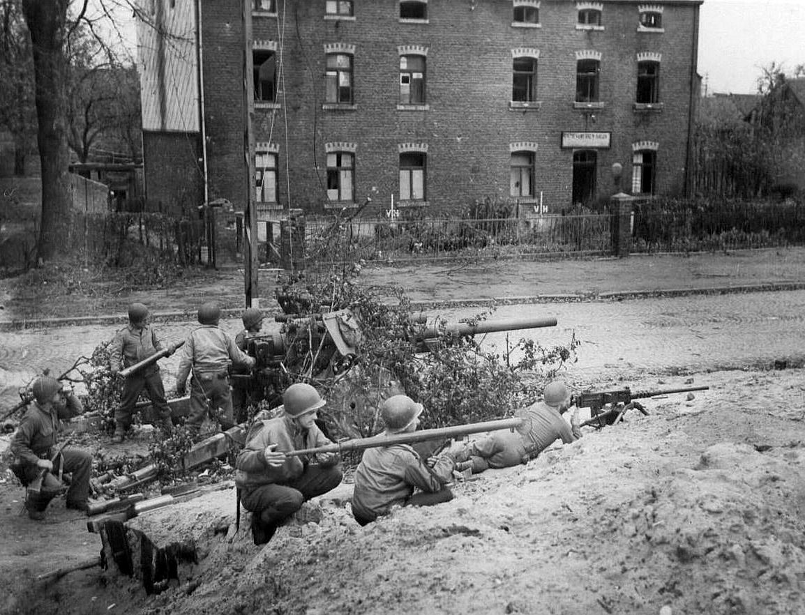 A US anti-tank squad in Alsdorf-Schaufenberg, Germany during the encirclement of Aachen in 1944.
