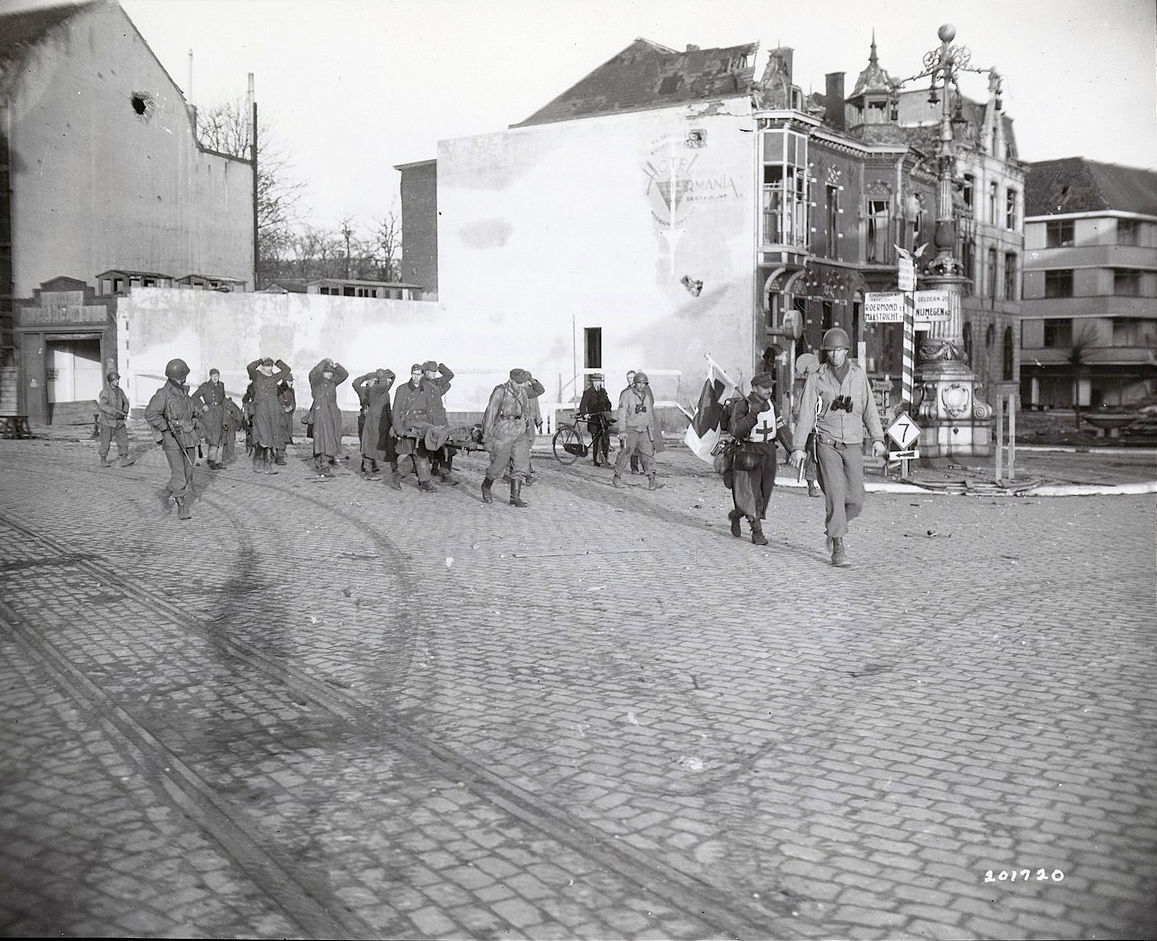 German prisoners are escorted by men of the 35th Infantry Division task force which liberated Venlo, Holland. 2 March, 1945.