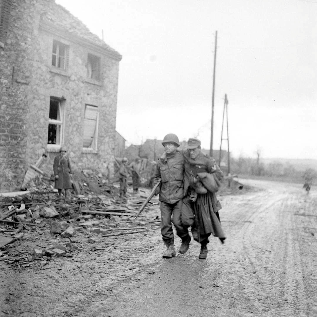 Soldiers from the US 104th Infantry Division “Timberwolves” with 2 injured German Soldiers in the city center of Stolberg, November 1944.