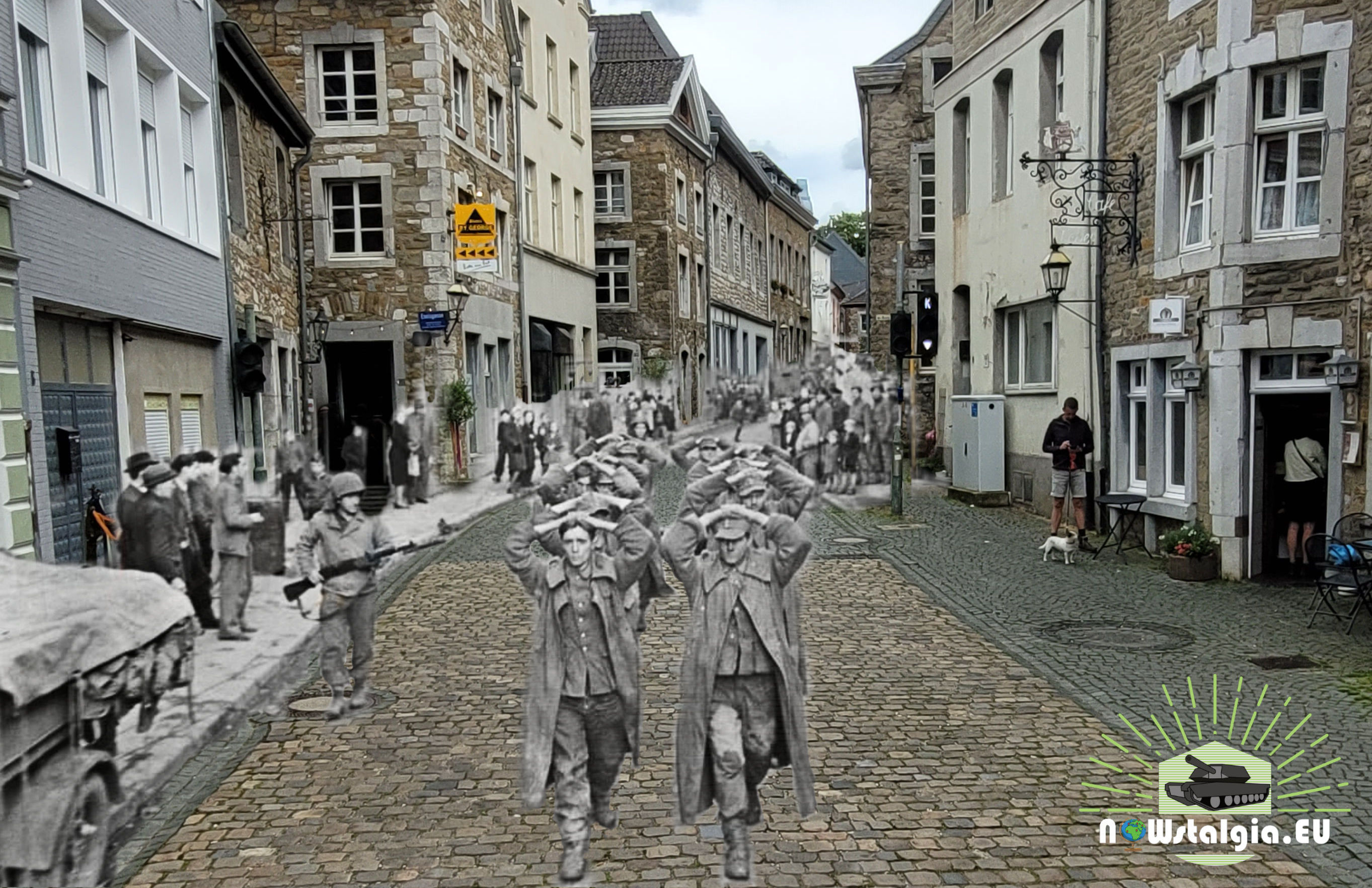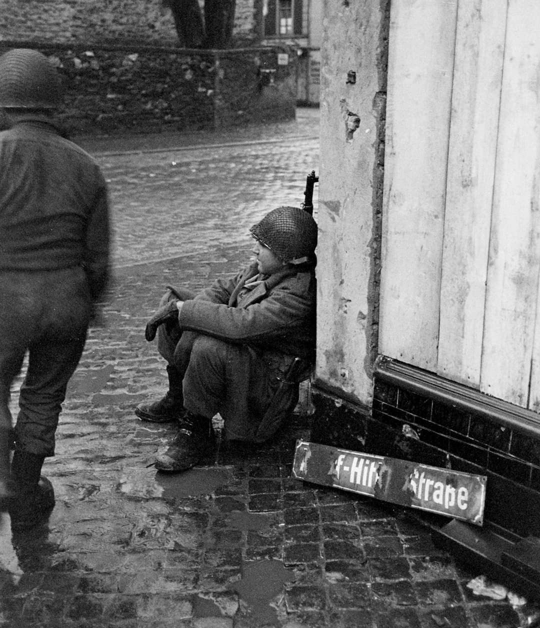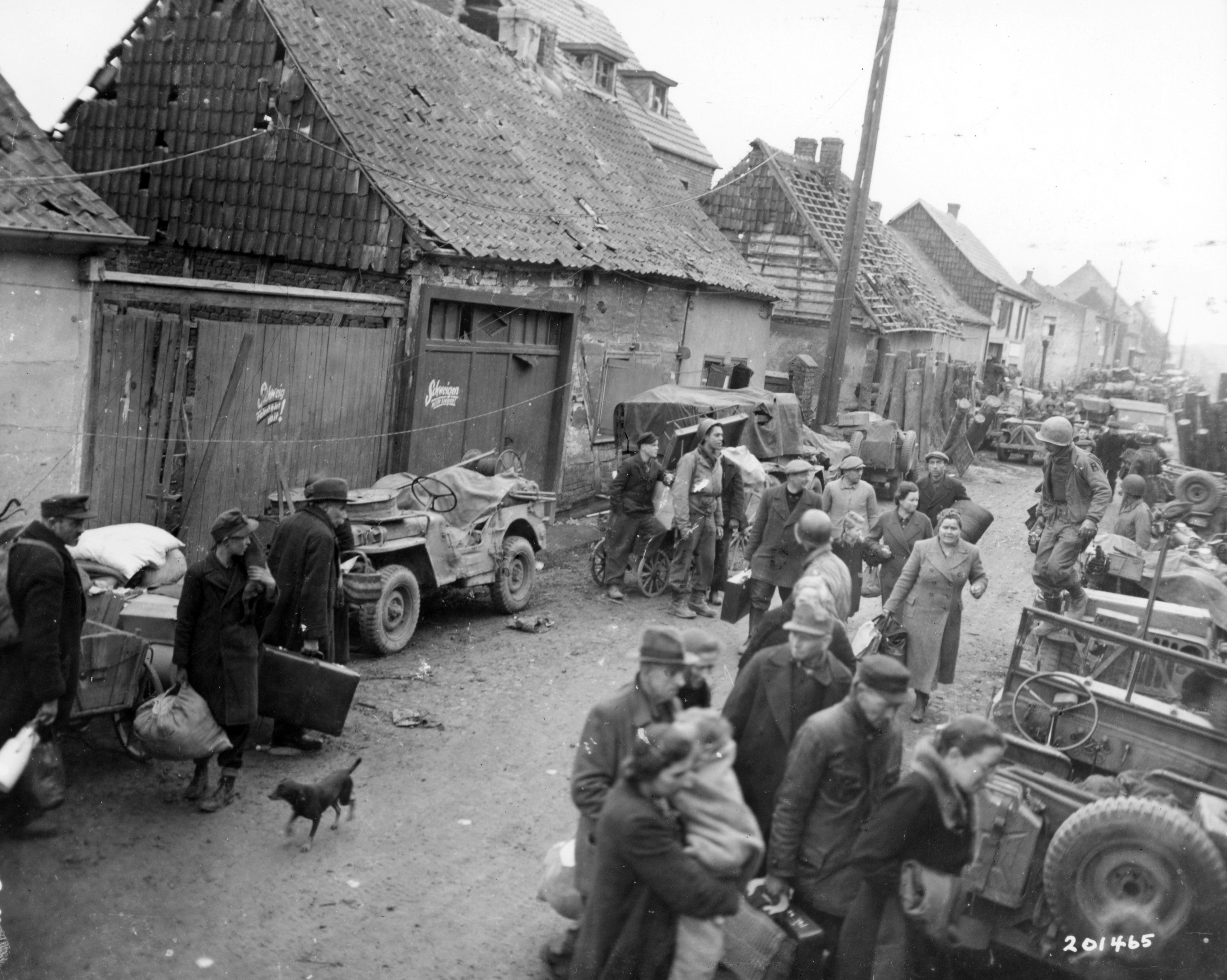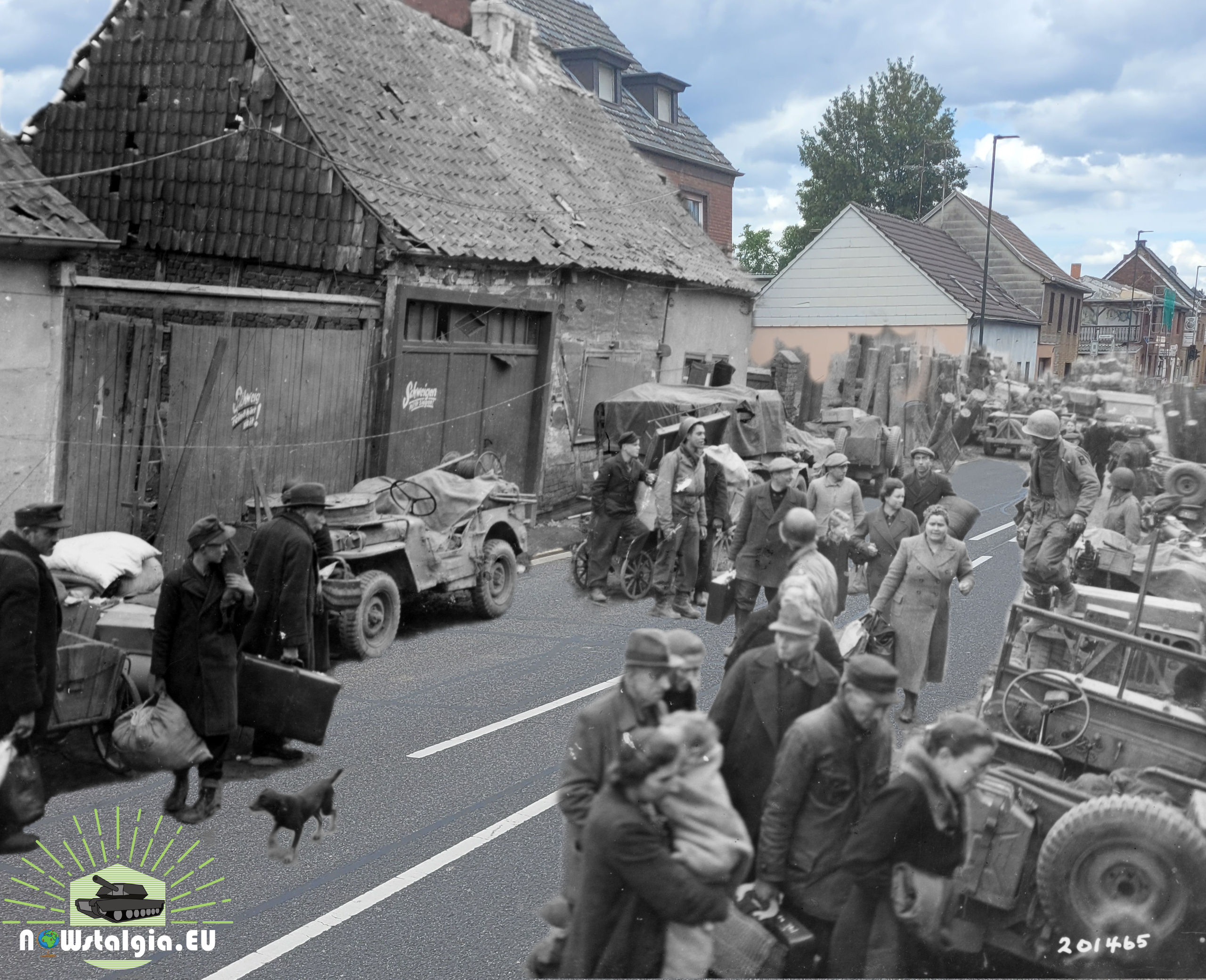 Civilians are rounded up by members of the Military Government, after First Army infantrymen of the 8th Division drove the Nazis out of Blatzheim, Germany, 27 February, 1945. Note: If you look careful you can you can see the slogans Schweig Feind hort mit! and Schweigen hilft Siegen!