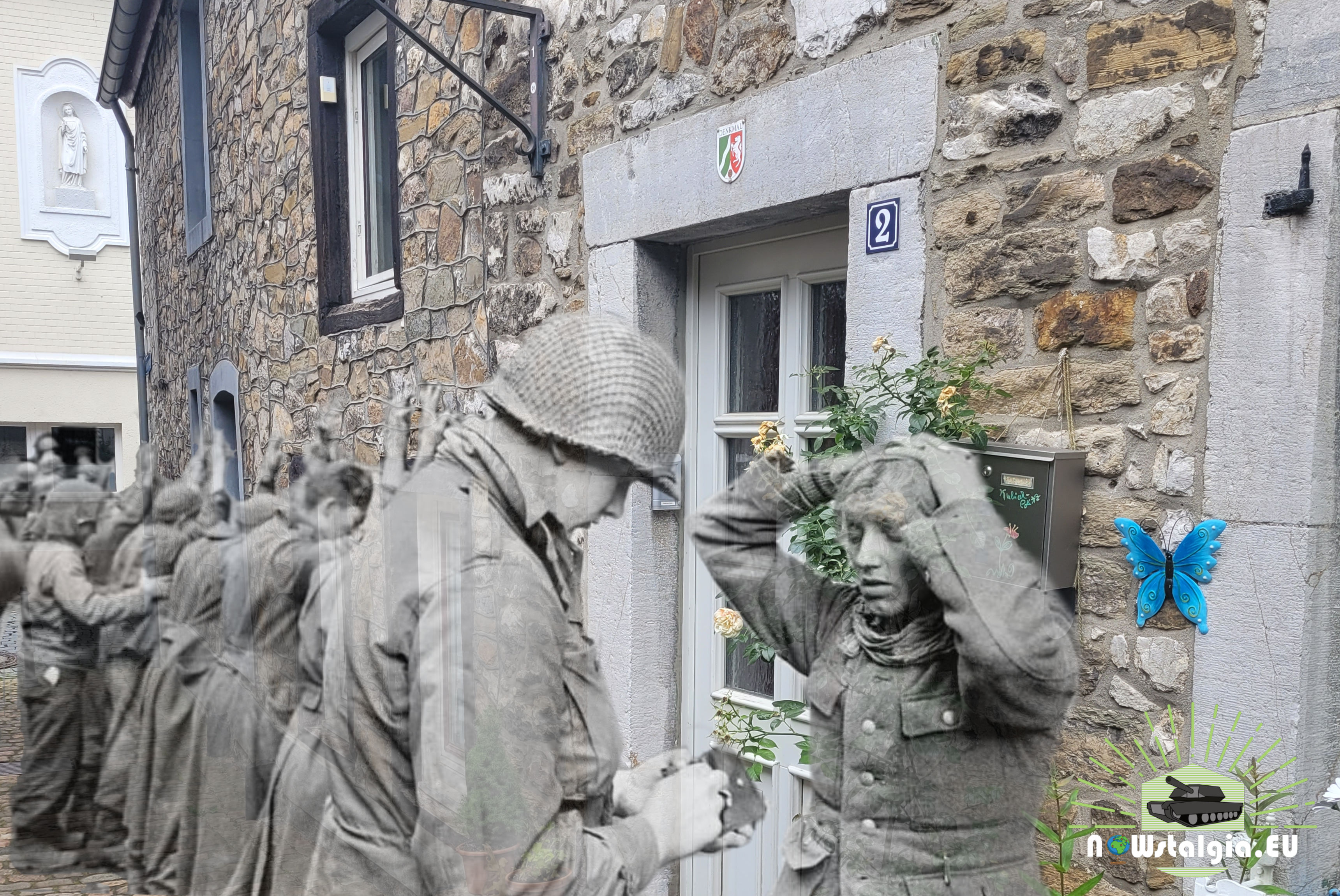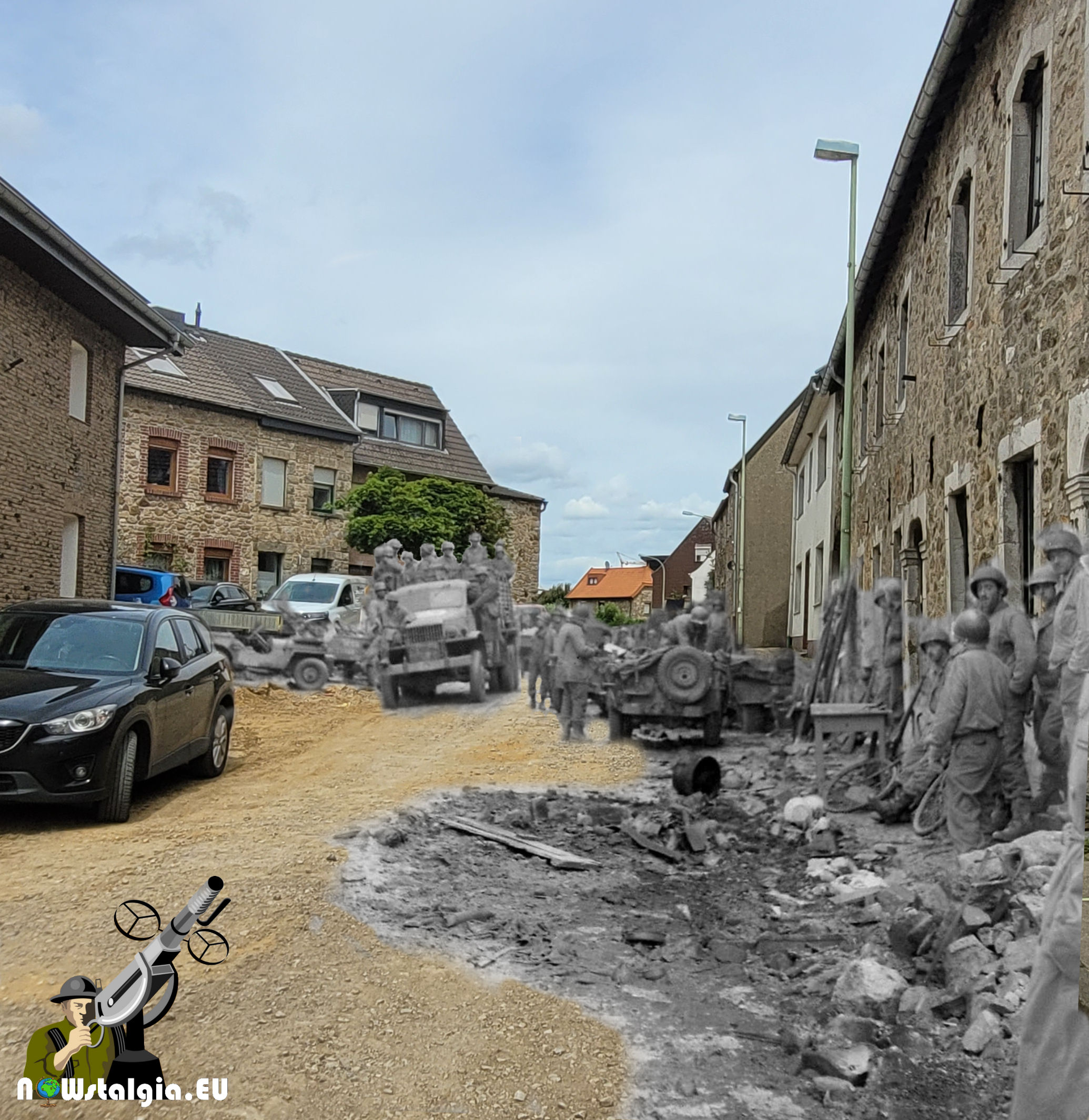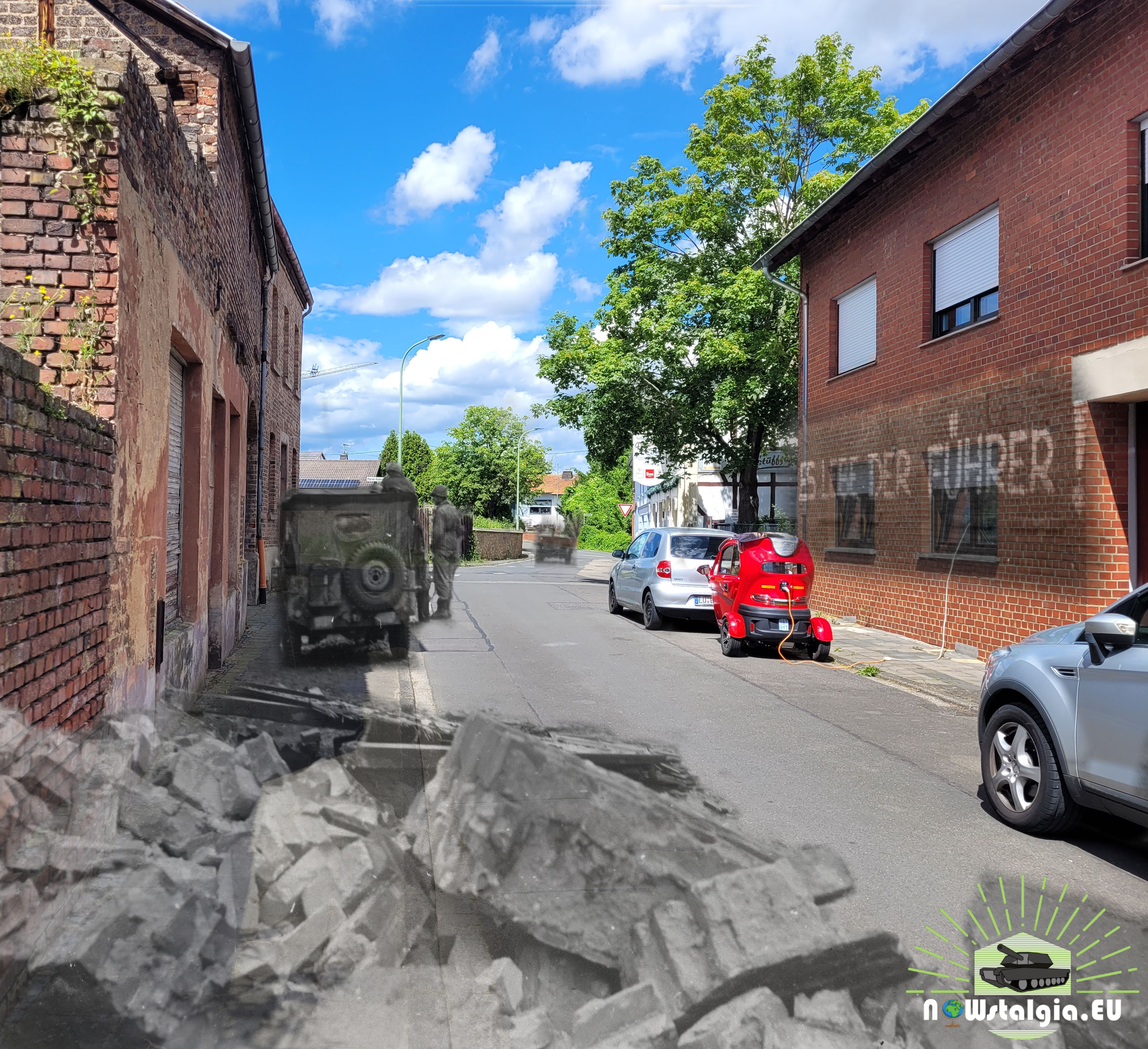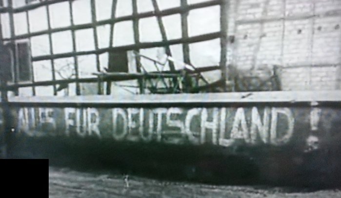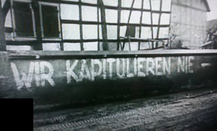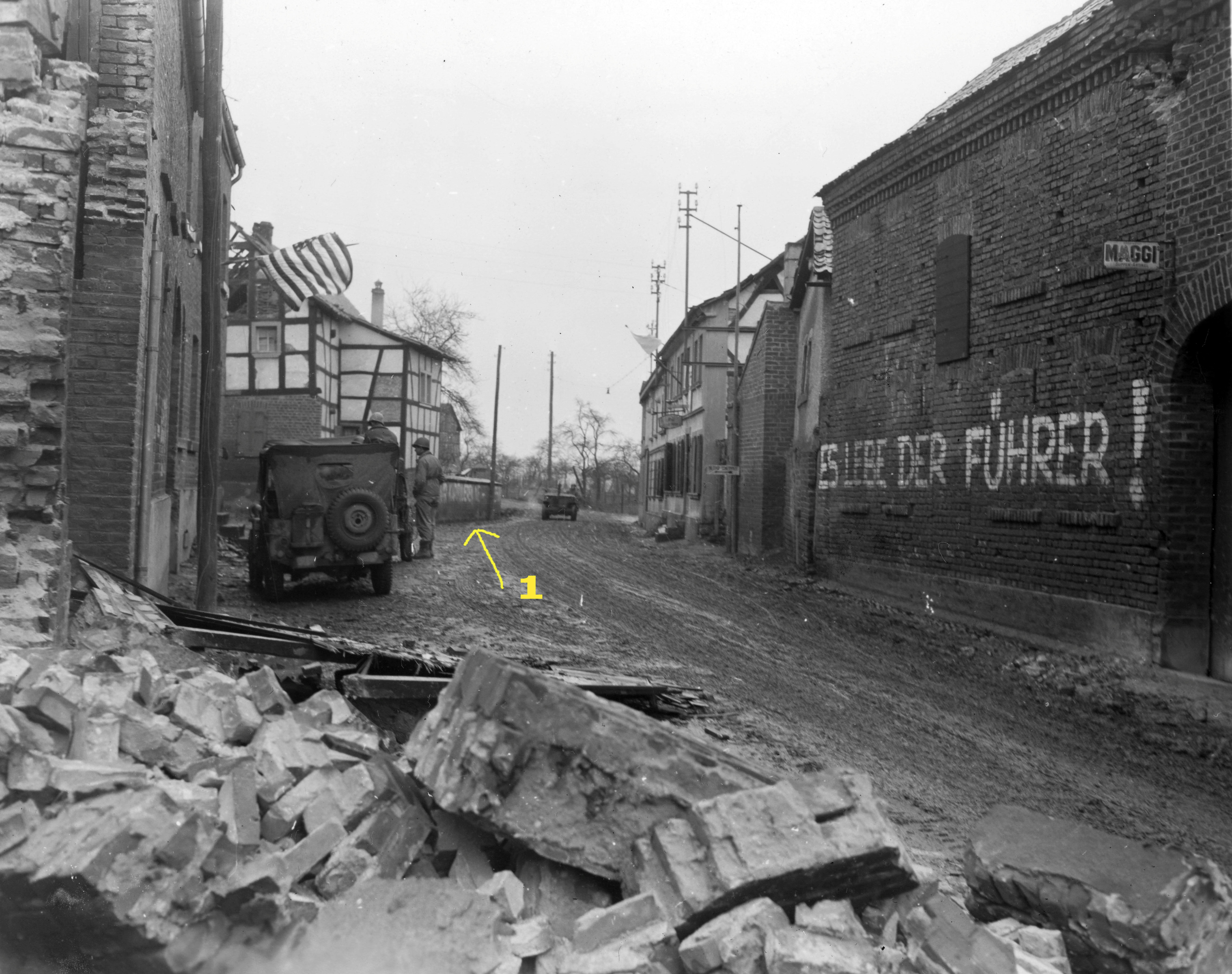 The Stars and Stripes flies from a building on the left while on the right you can read the slogan “Es lebe der Führer” or “Long live the Führer”. The town of Schwerfen was taken by a Cavalry Reconnaissance unit of the 1st U.S. Army 6 March, 1945. Further on the wall (1) you can read the slogan “Wir kapitulieren nie – Alles fur Deutschland“.