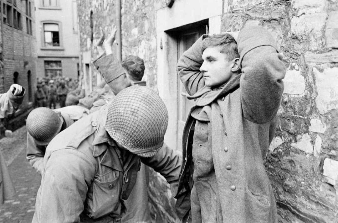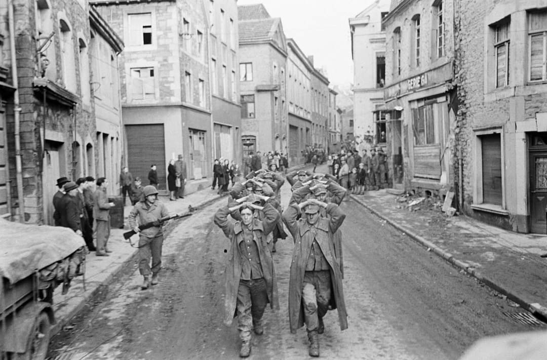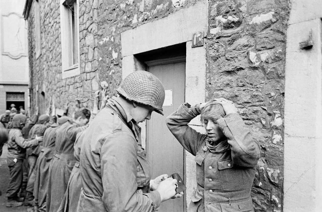 US soldiers in the small town of Hamich gathering around German prisoners of war around November 1944.