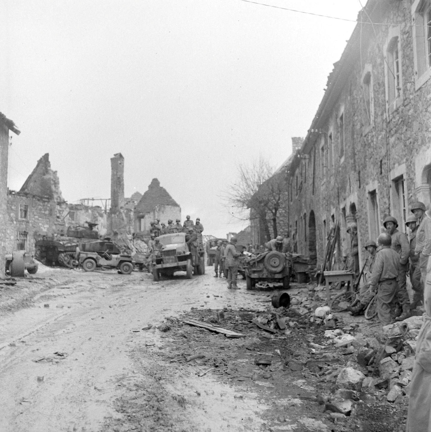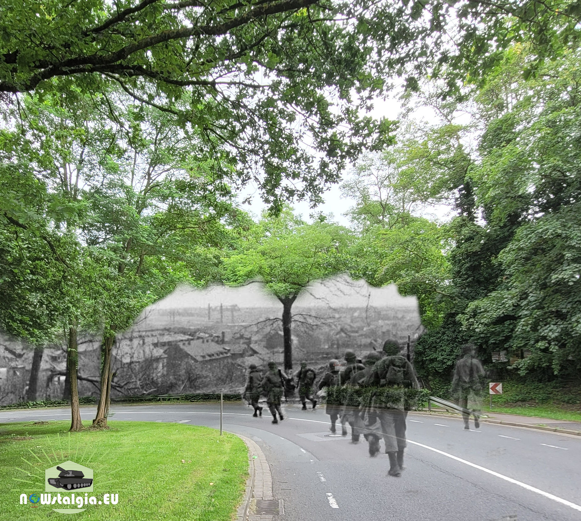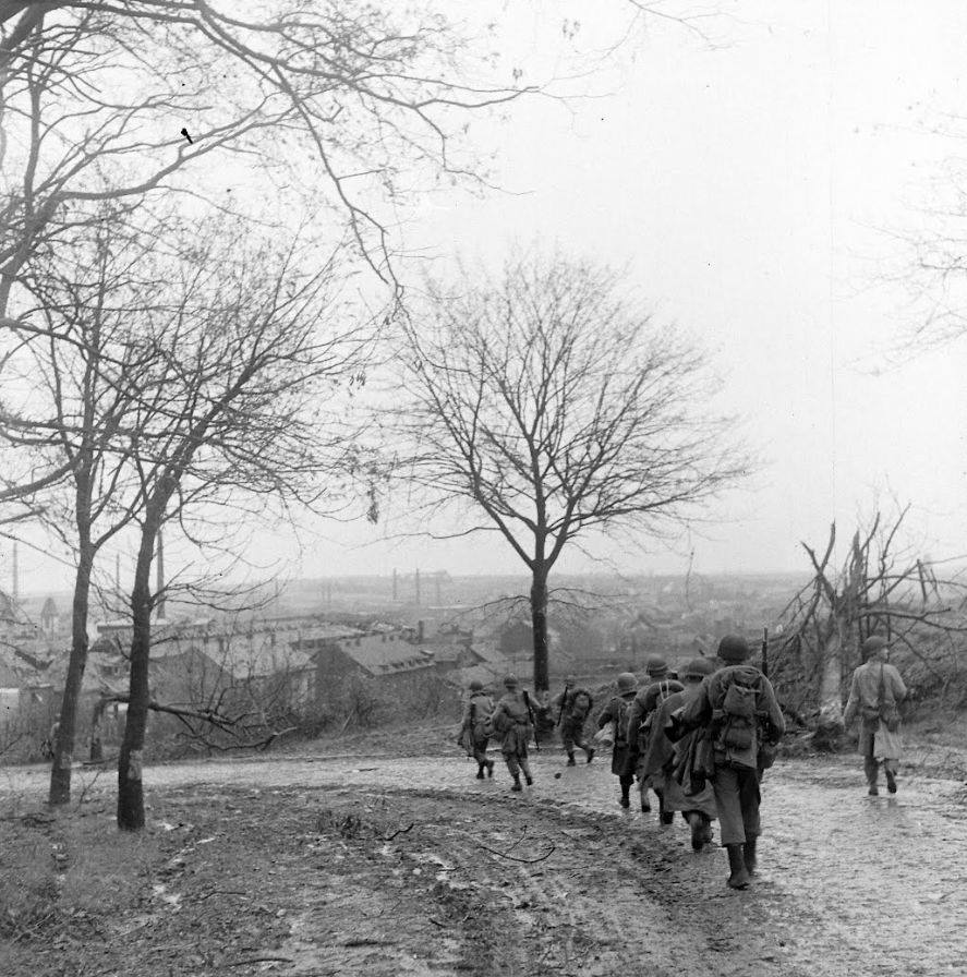 US soldiers on the Sticherberg on their way to the city of Eschweiler which they can see in the background during Operation Queen in December 1944.