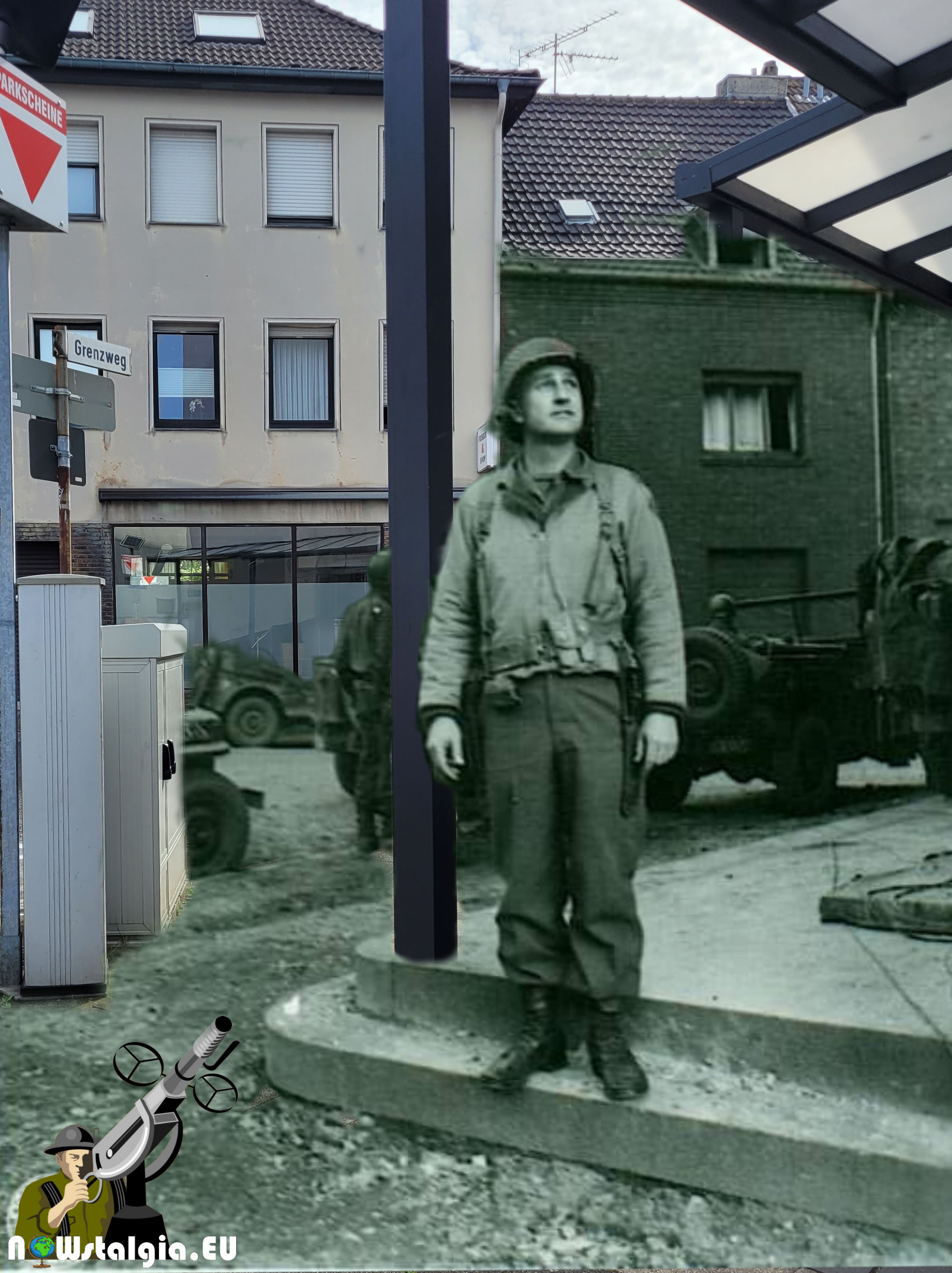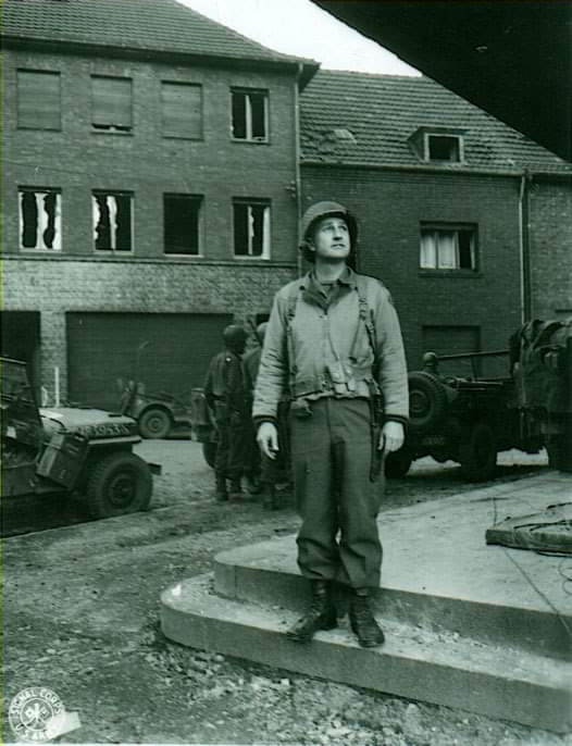 Lt. Col. Robert E. Frankland, CO, 1st Battalion, 117th Infantry Regiment iin front of 1st Battalion CP in Alsdorf, Germany, a few days after initial assault in October 1944.