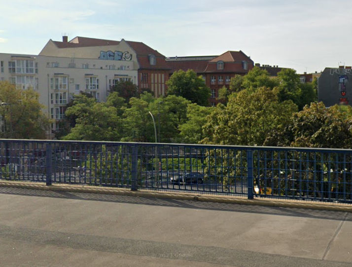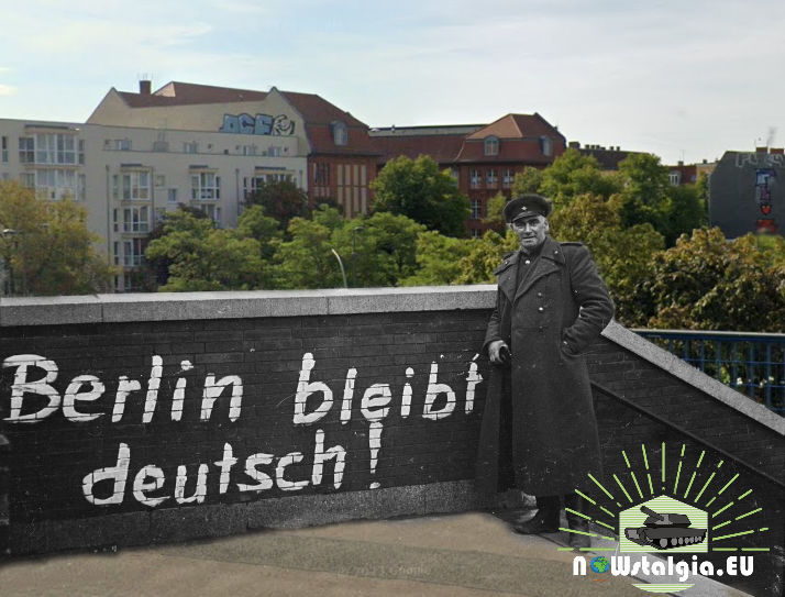 Soviet Officer on a metro bridge in the suburb of Lichtenberg in April 1945 besides the sign Berlin Bleibt Deutsch or Berlin remains German after the battle for the city.