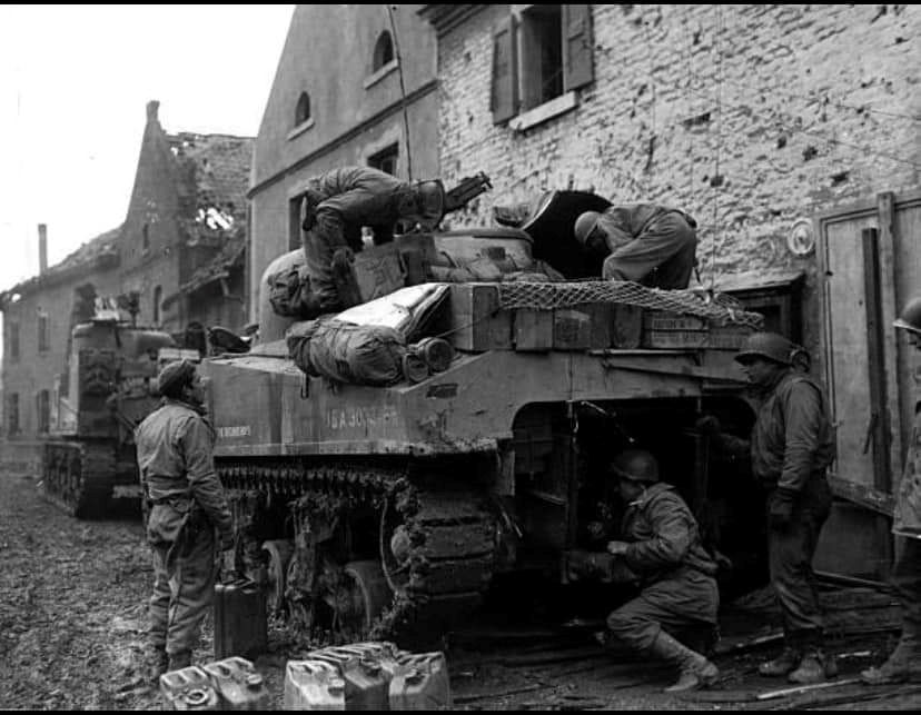 Men of the 2nd Arm. Div., 9th U.S Army, inspect and refuel their tank prior to moving out in the new advance inside Germany. (Beggendorf/November 17, 1944)