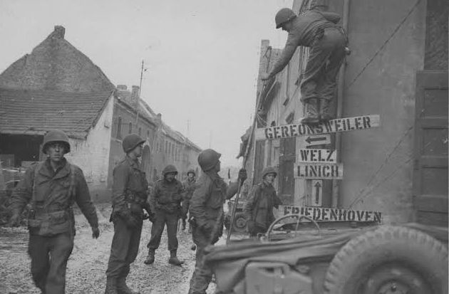 American troops and a tank move through a wreckage strewn street in Gressenich, Germany captured during Operation Queen in 1944.
