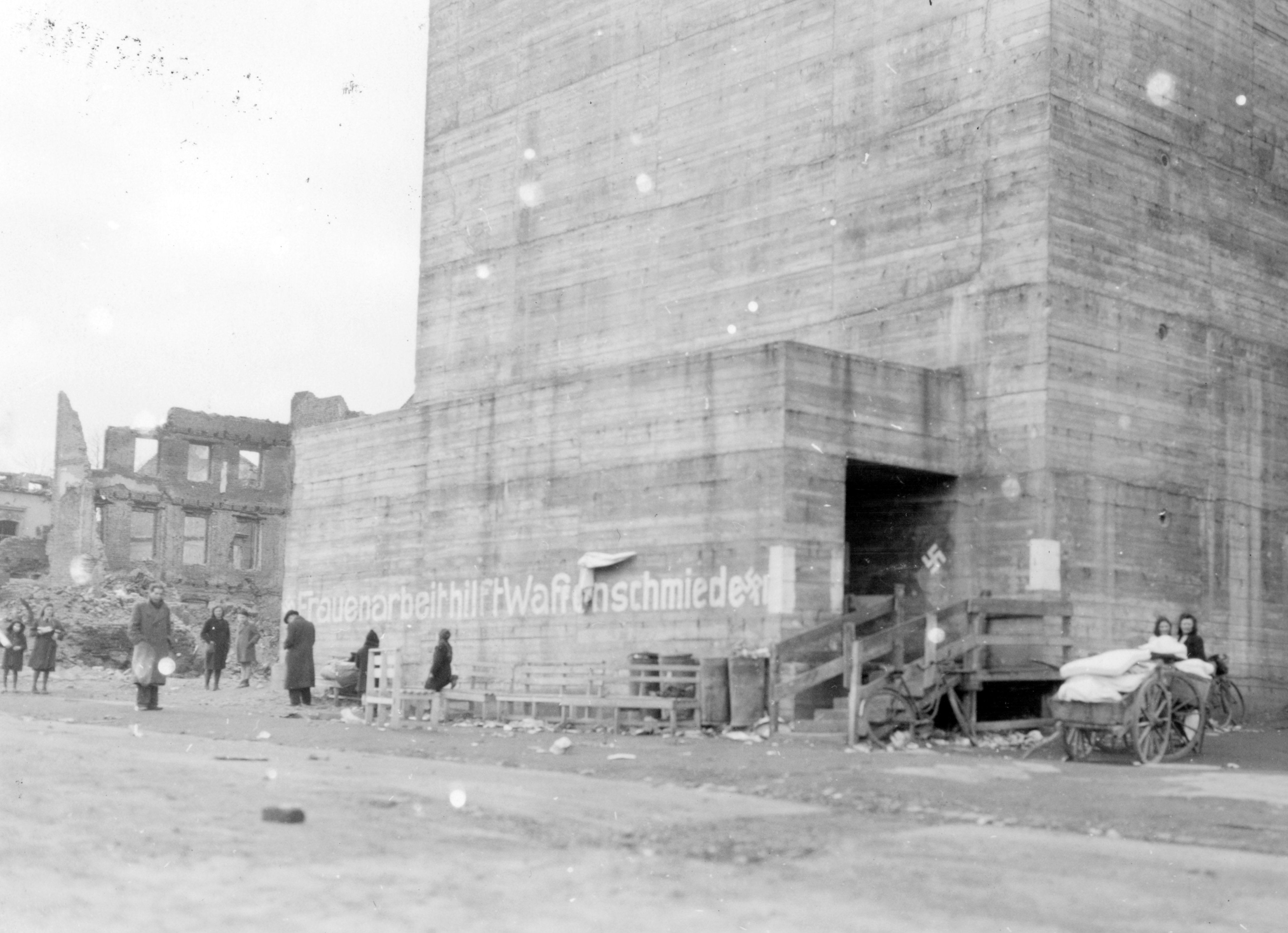 German civilians who have been living in an air raid shelter with the slogan on the wall that reads Frauenarbeit hilft waffen schmieden or Women’s work helps forge weapons in Krefeld, Germany, pack up their stuff and leave the town, 3 March, 1945.