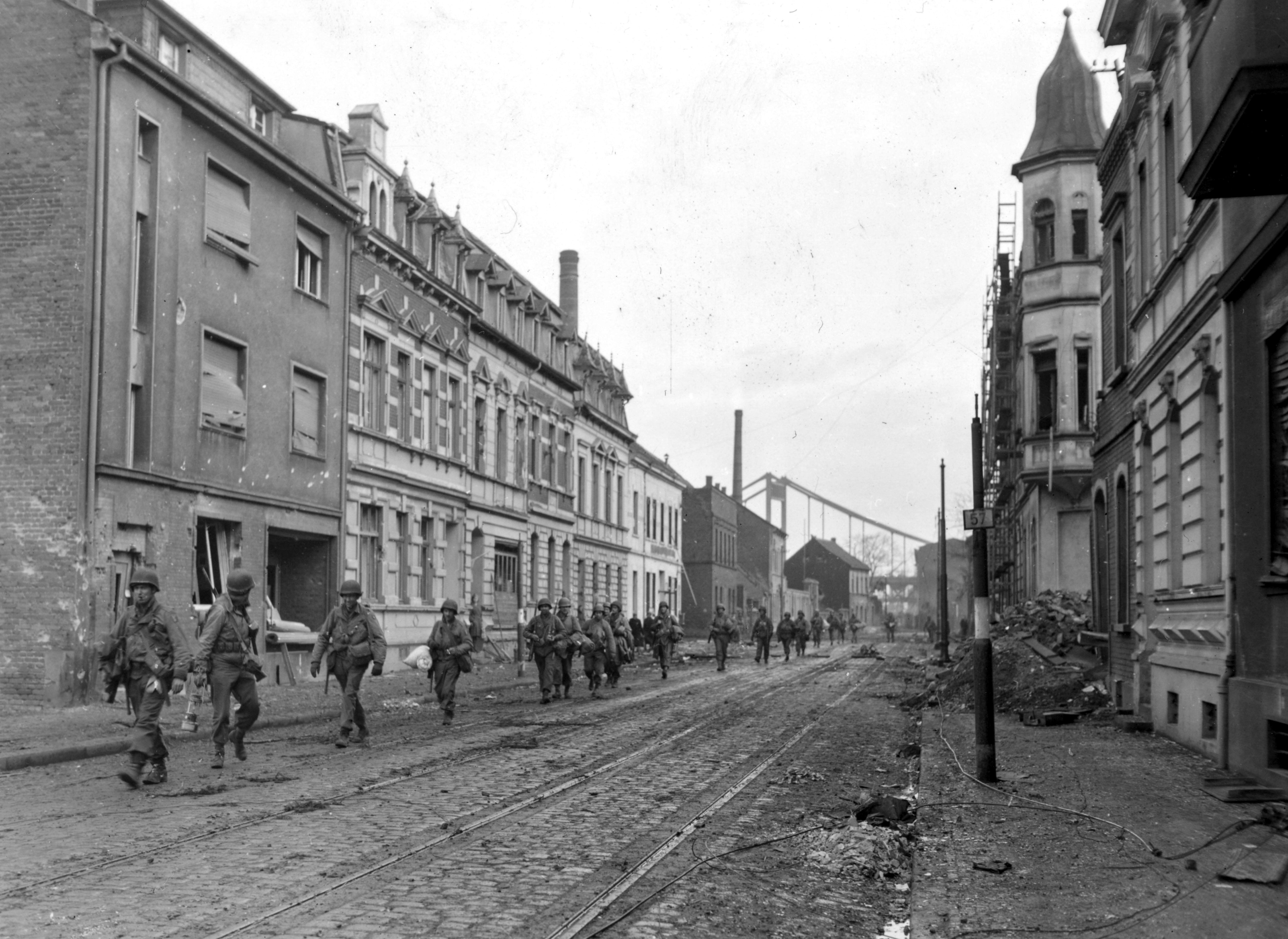 Infantrymen of the 95th Division, 9th U.S. Army, move into the town of Uerdingen, Germany. 5 March, 1945.