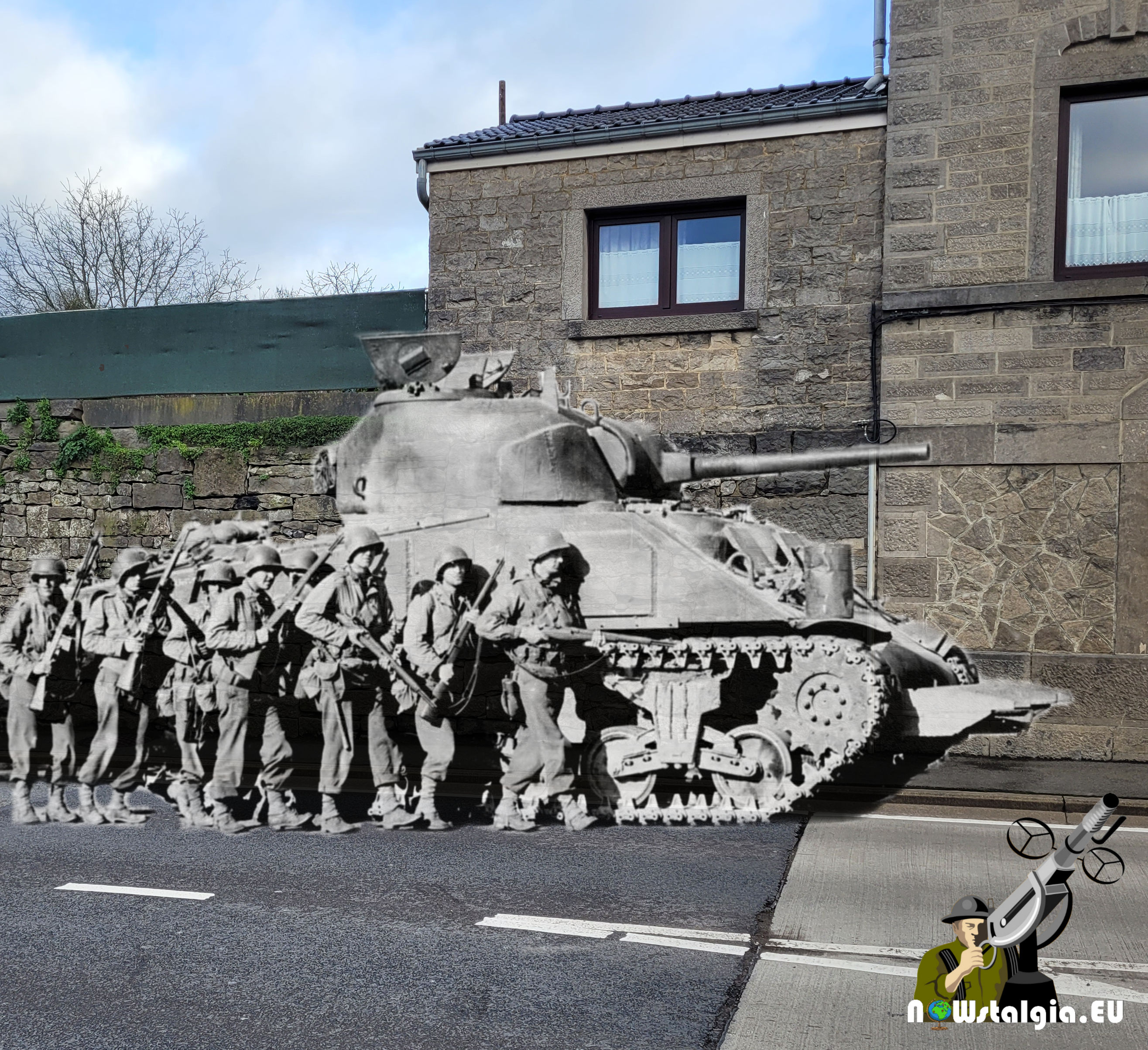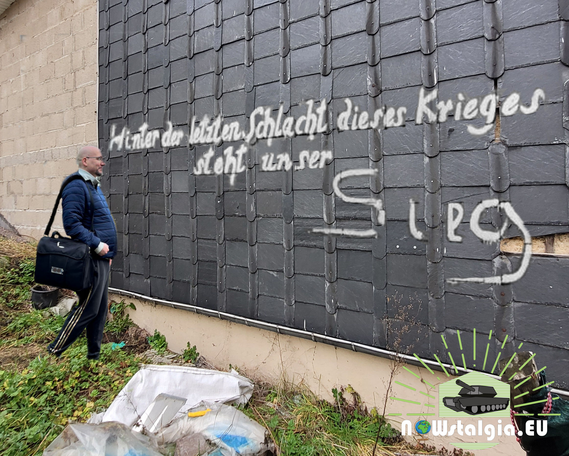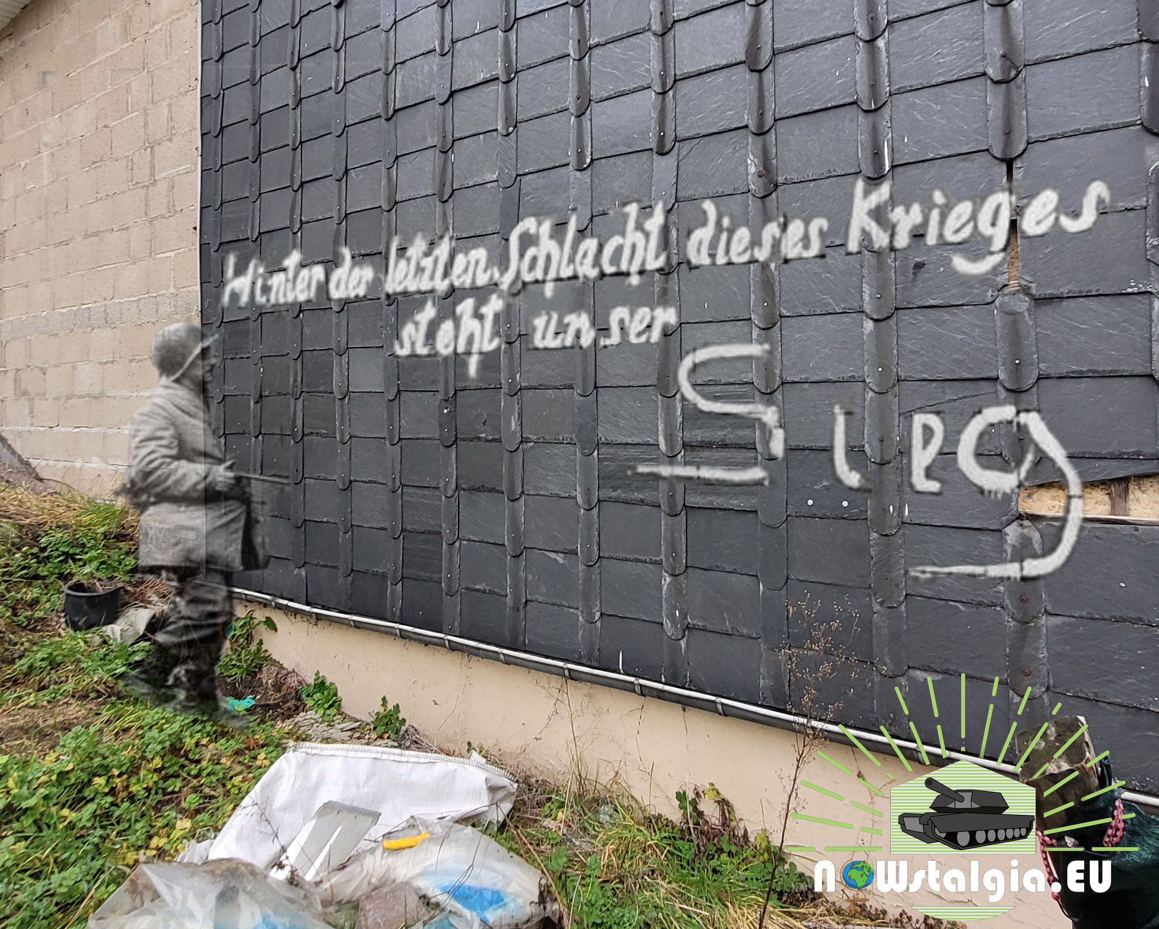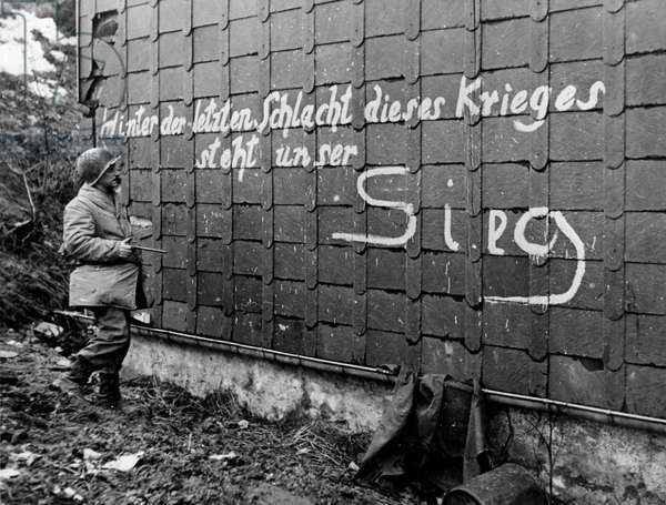 Allied soldier in Trois-Vierges Luxembourg during the battle of the bulge looking at a grafitti slogan saying “Hinter der letzten schlacht dieser Krieges steht unser Sieg” or in English “Behind the last battle of this war lies our victory“.