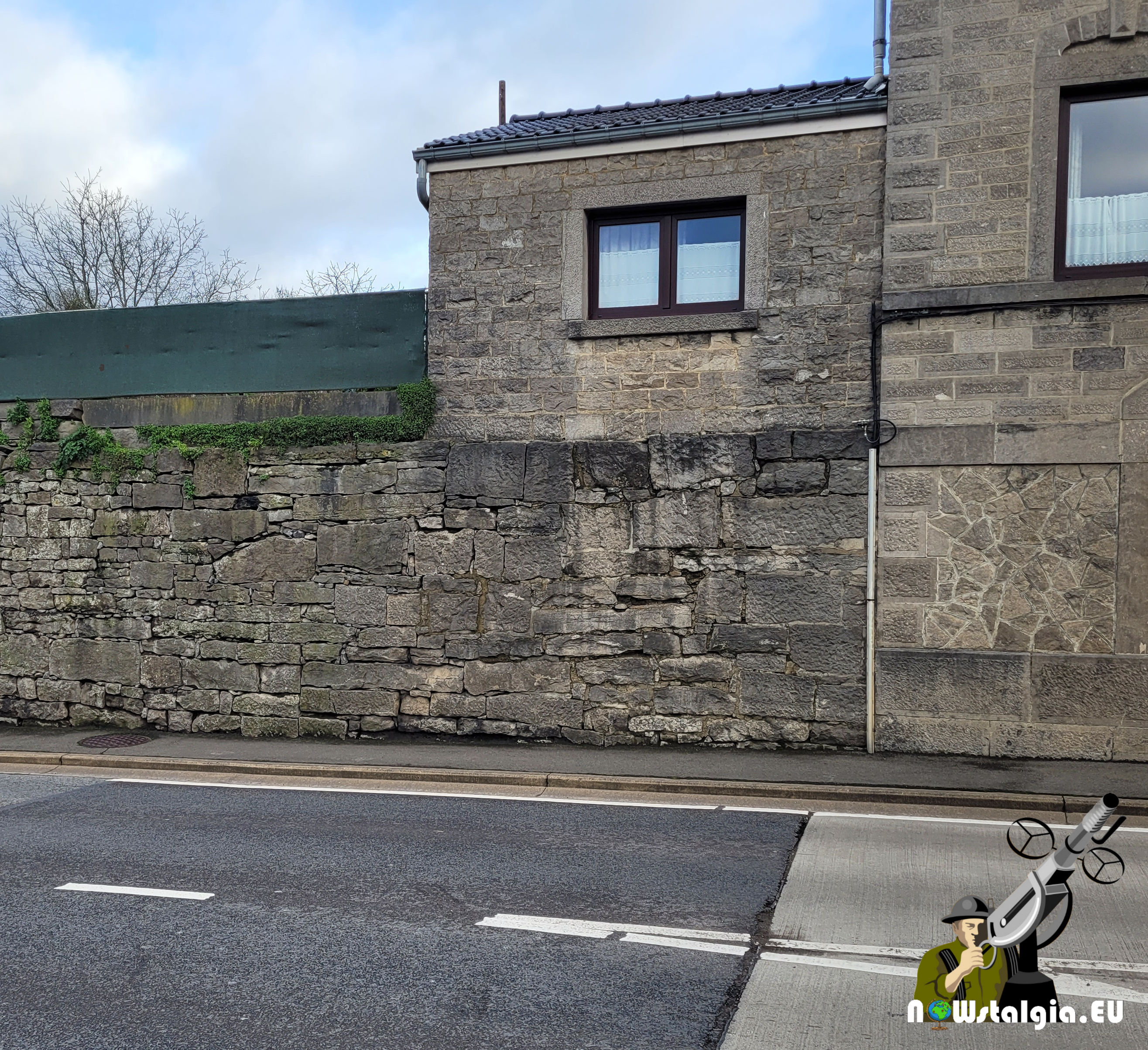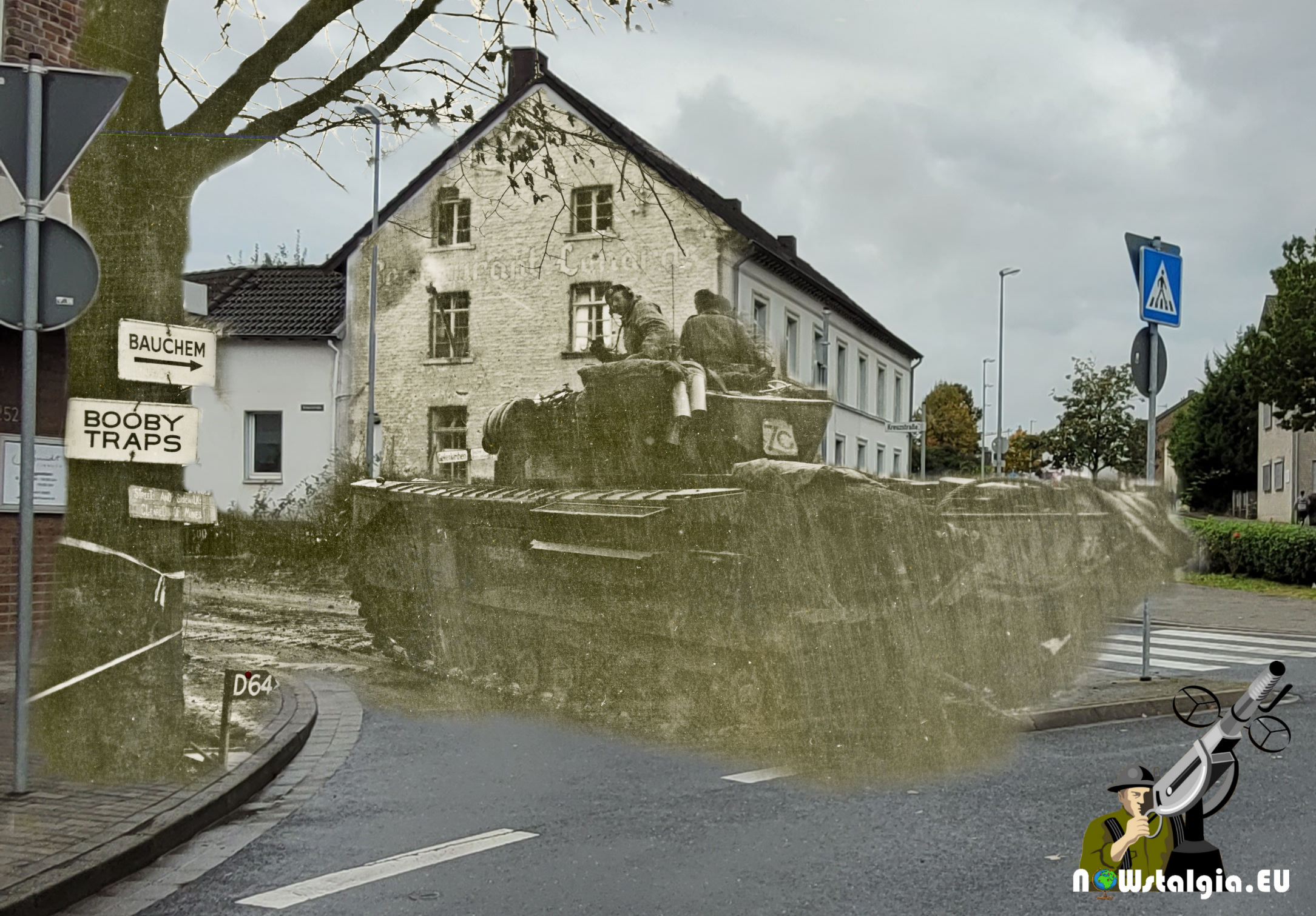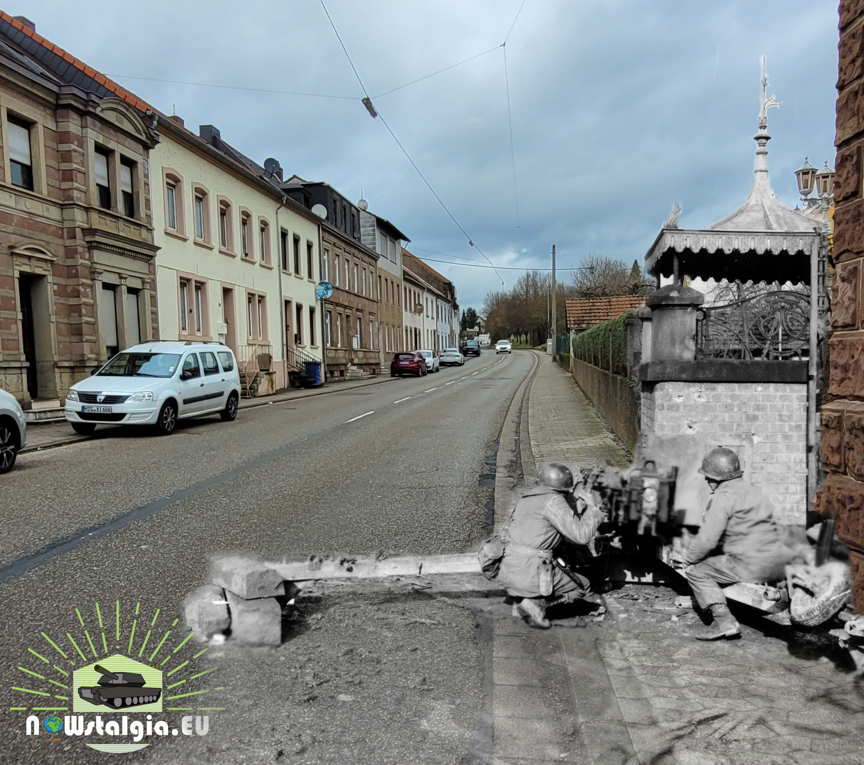Allied soldier in Trois-Vierges Luxembourg during the battle of the bulge looking at a grafitti slogan saying “Hinter der letzten schlacht dieser Krieges steht unser Sieg” or in English “Behind the last battle of this war lies our victory“.