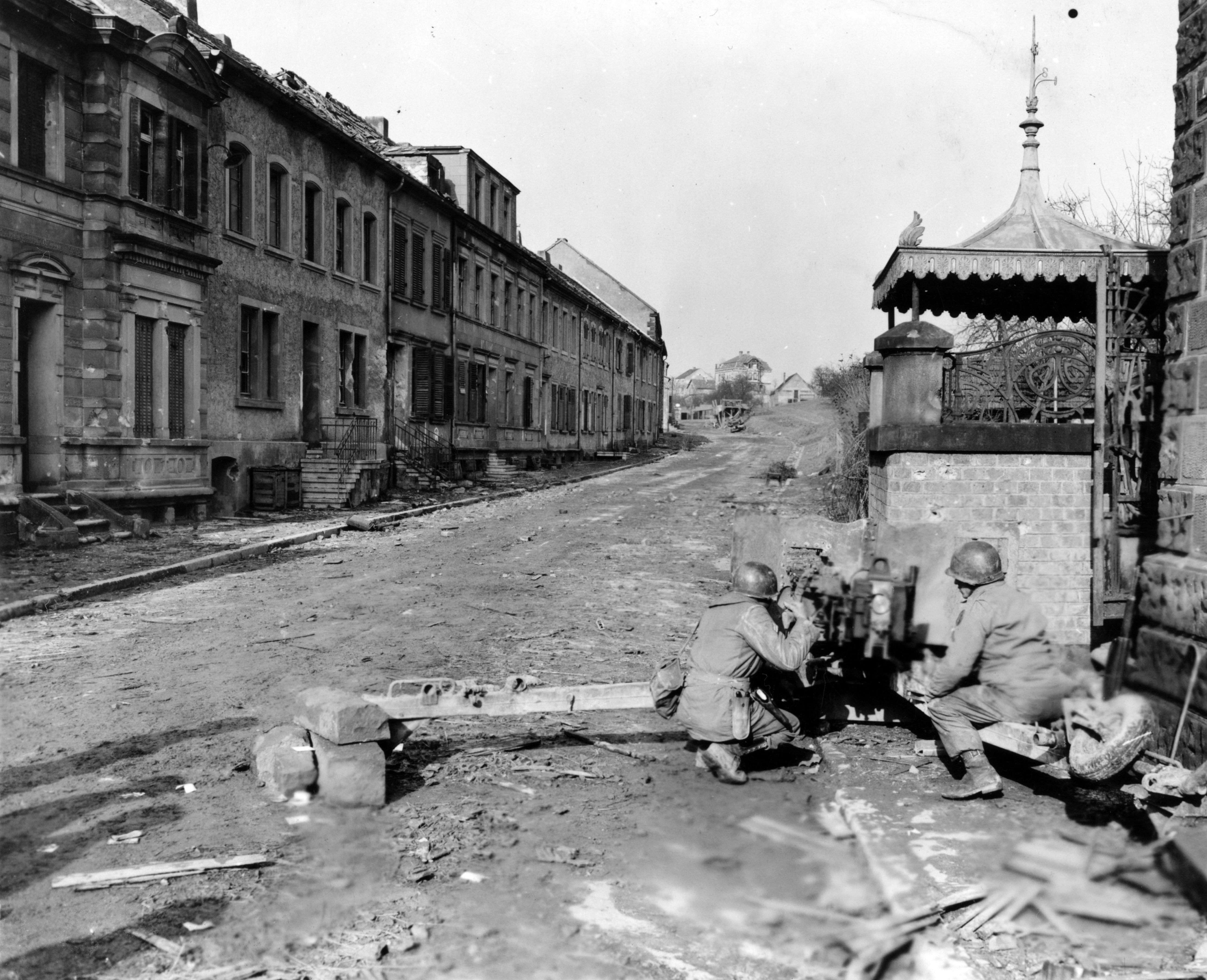 Anti-tank gunners set up their 57mm gun, commanding a street in the outskirts of Kleinblittersdorf, alert for a possible counterattack by the enemy, 21 February 1945.