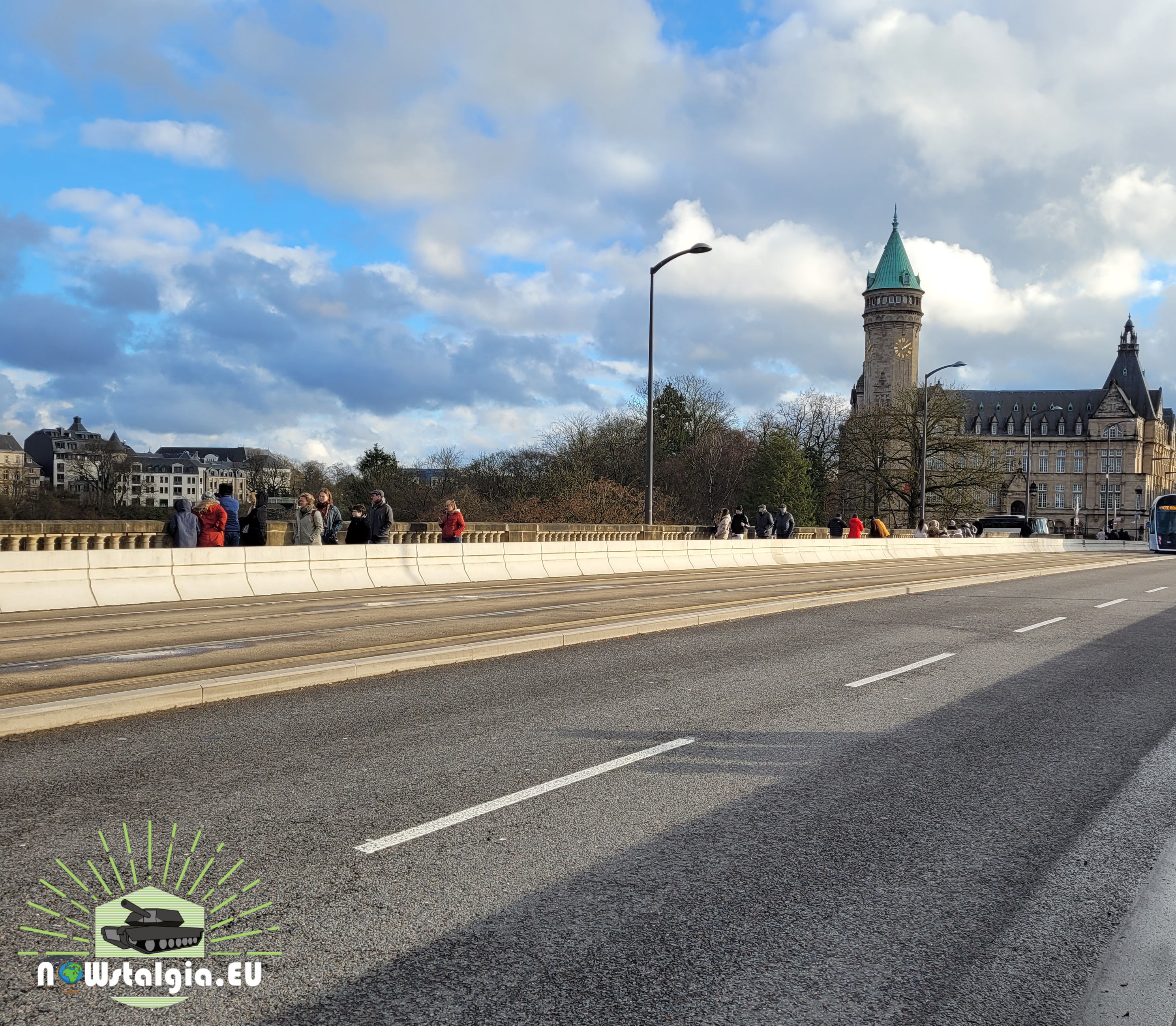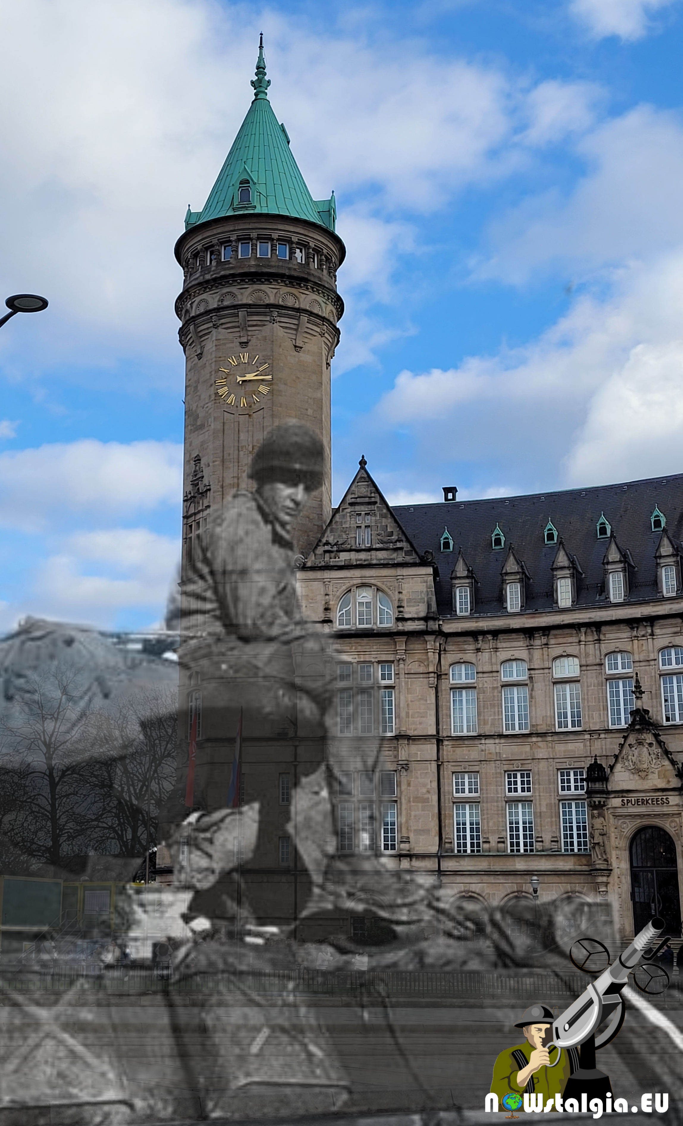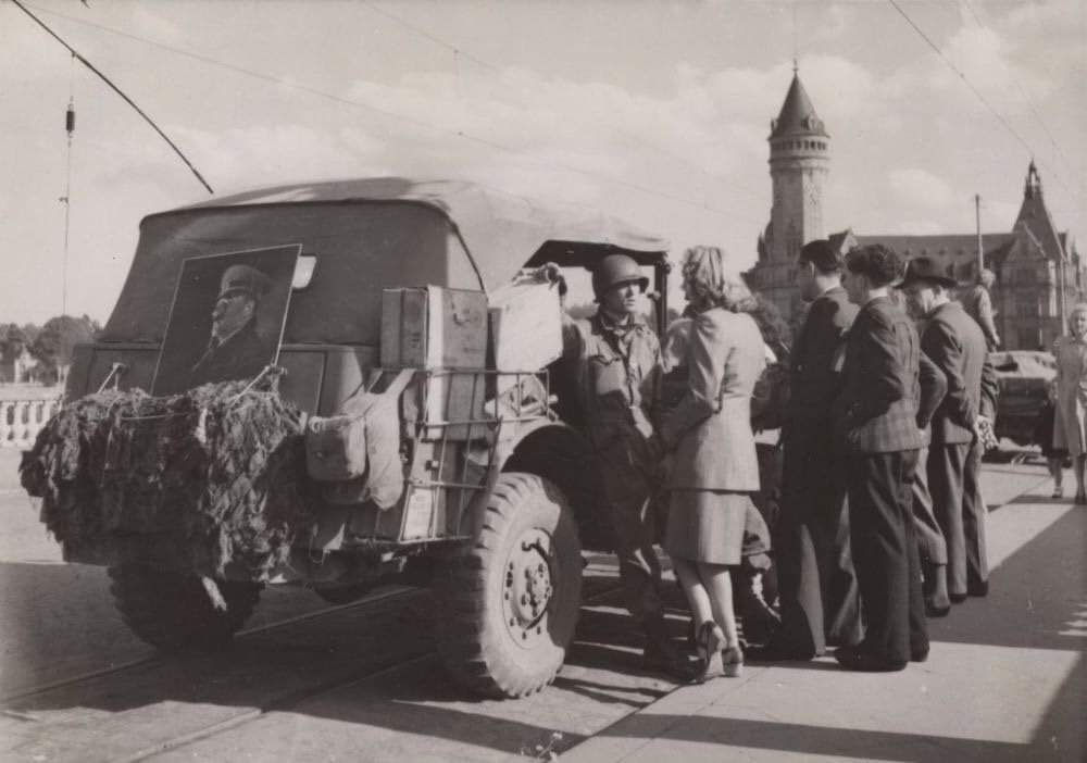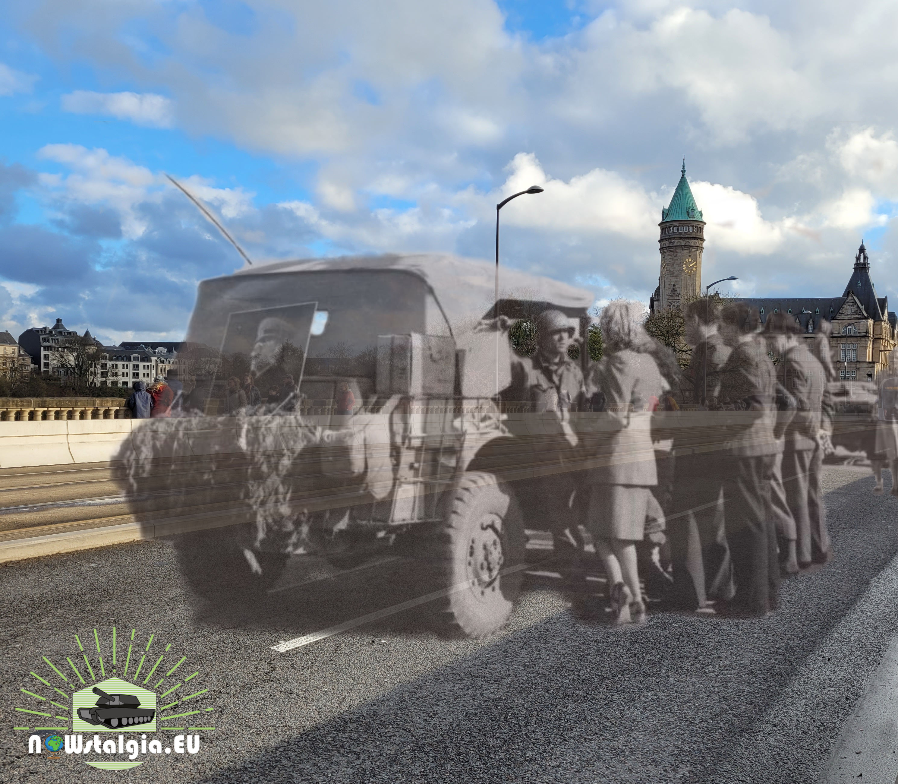 Liberators arrive in Luxembourg on the Pont Adolphe with a portrait of Adolf Hitler around September / October 1944.