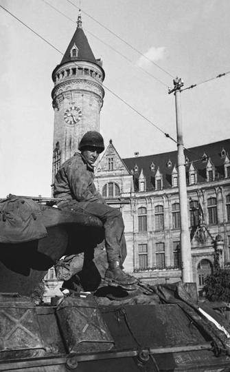 An American GI of the US army sits on an armoured vehicle after just passing the Pont Adolphe in Luxembourg city around September / October 1944.